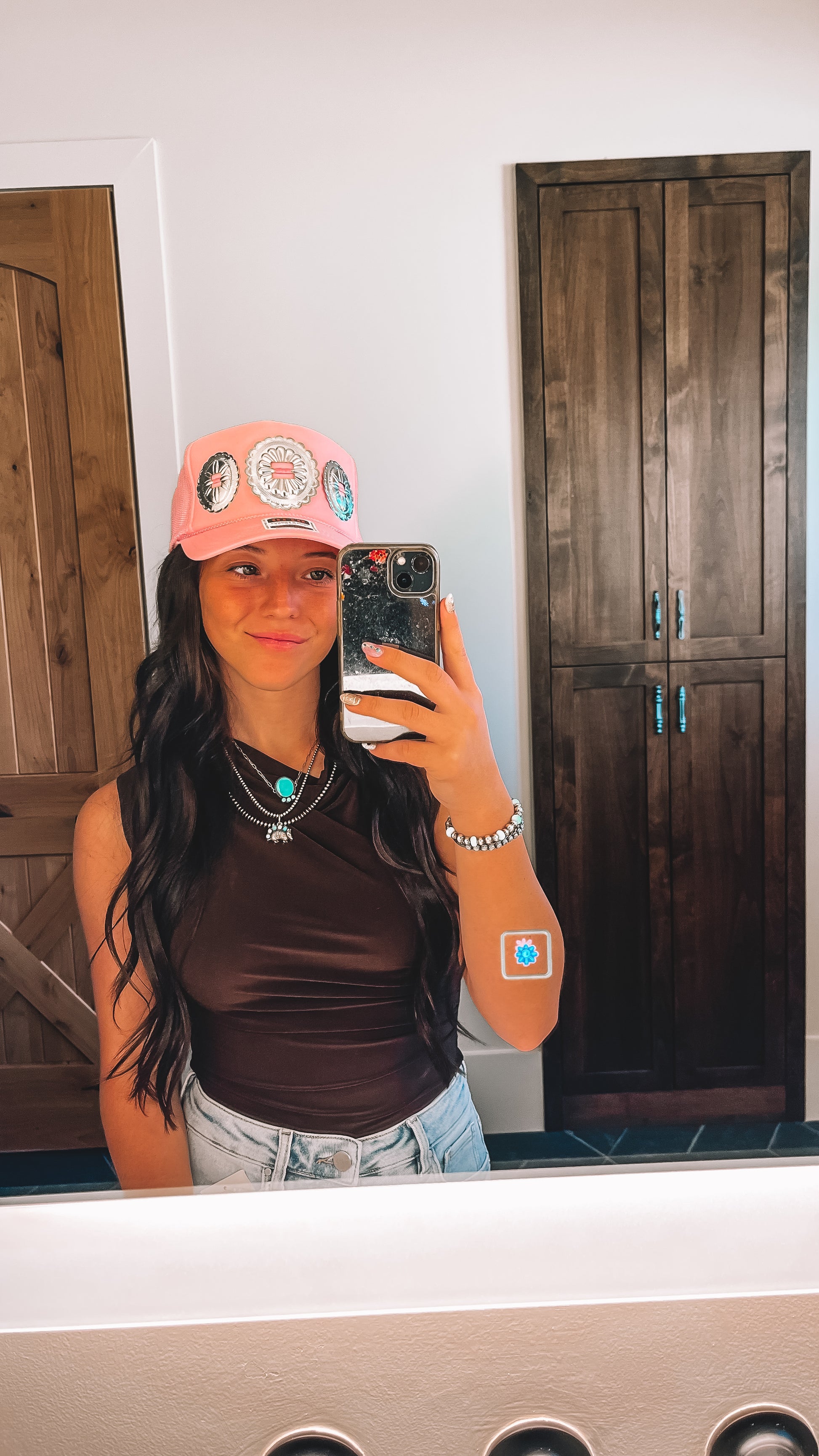 Pink foam high crown trucker hat. Silver conchos hand sewn on.