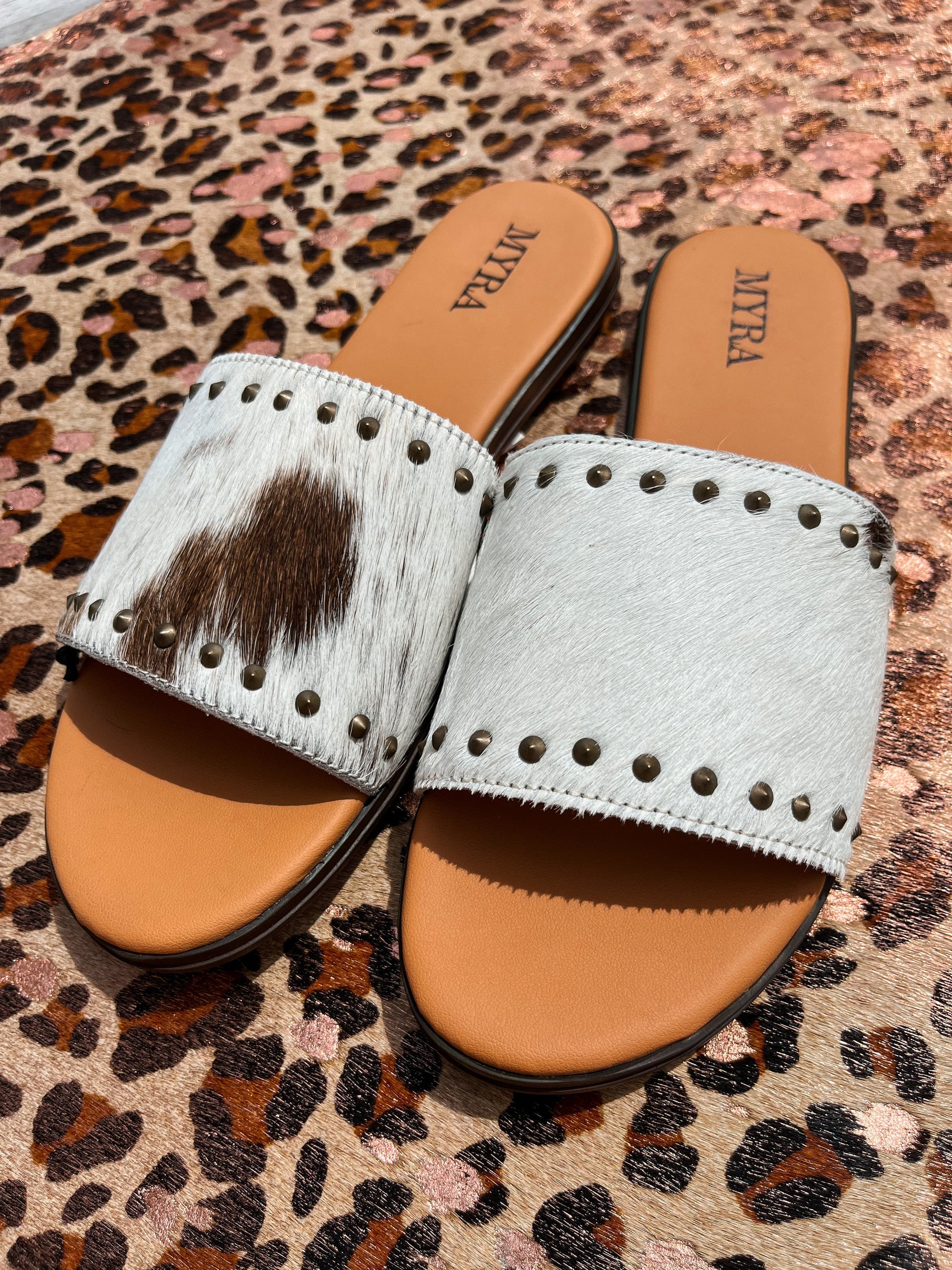 These are genuine cowhide sandals, meaning hides vary and no two shoes are exactly alike. Select your size to view that unique pair.