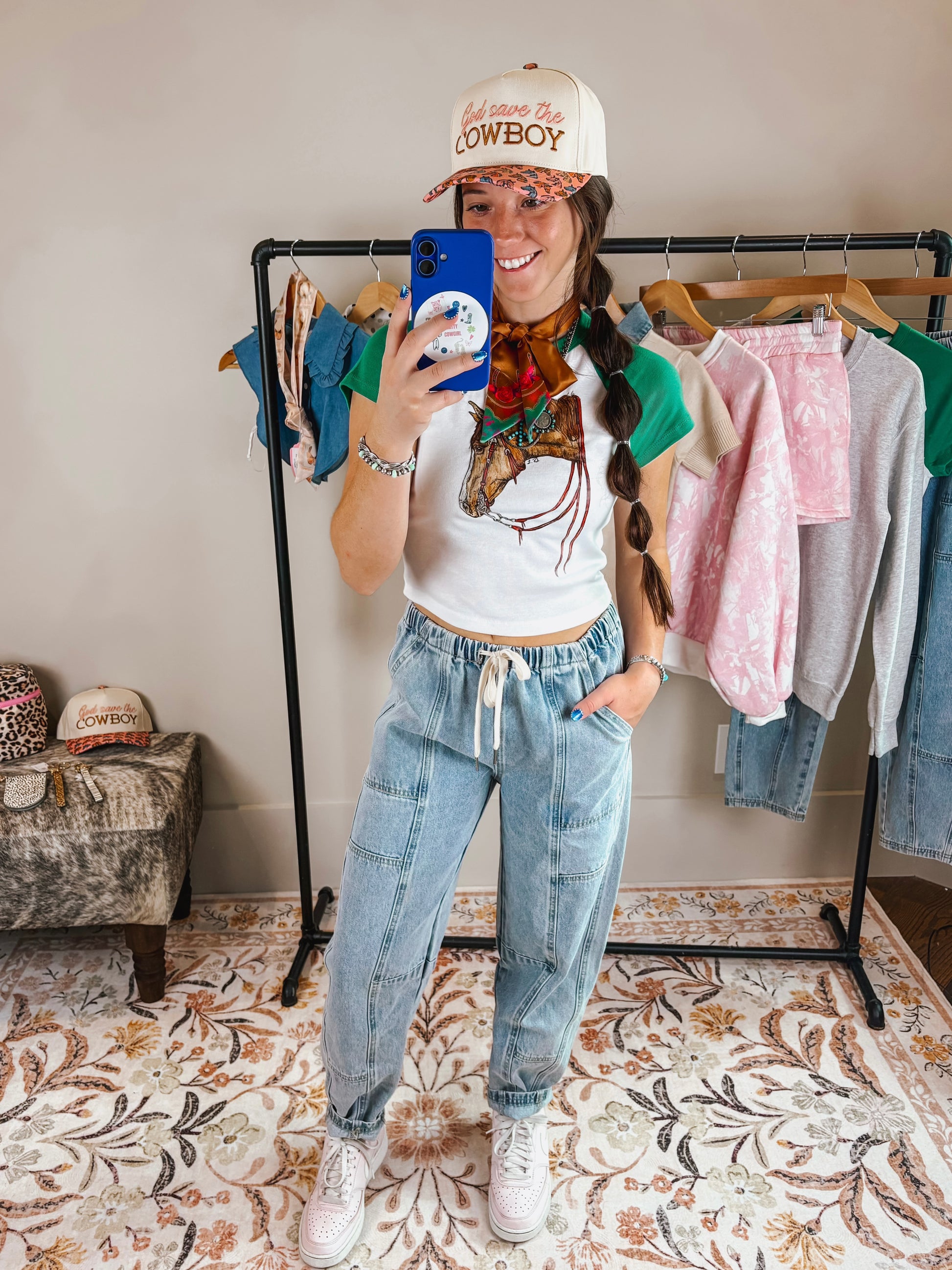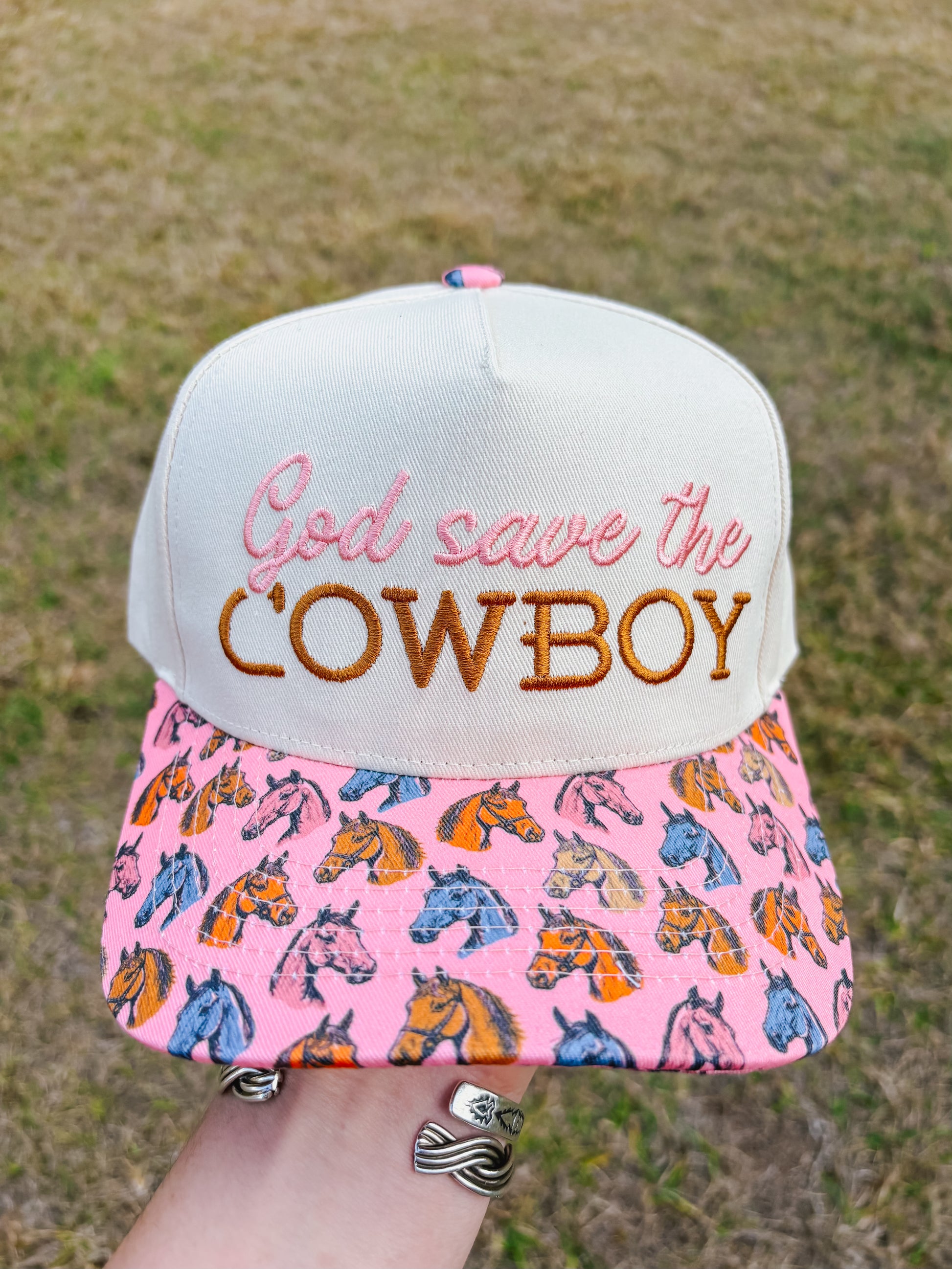 "God save the cowboy" embroidered hat. Pink & horses patterned bill.