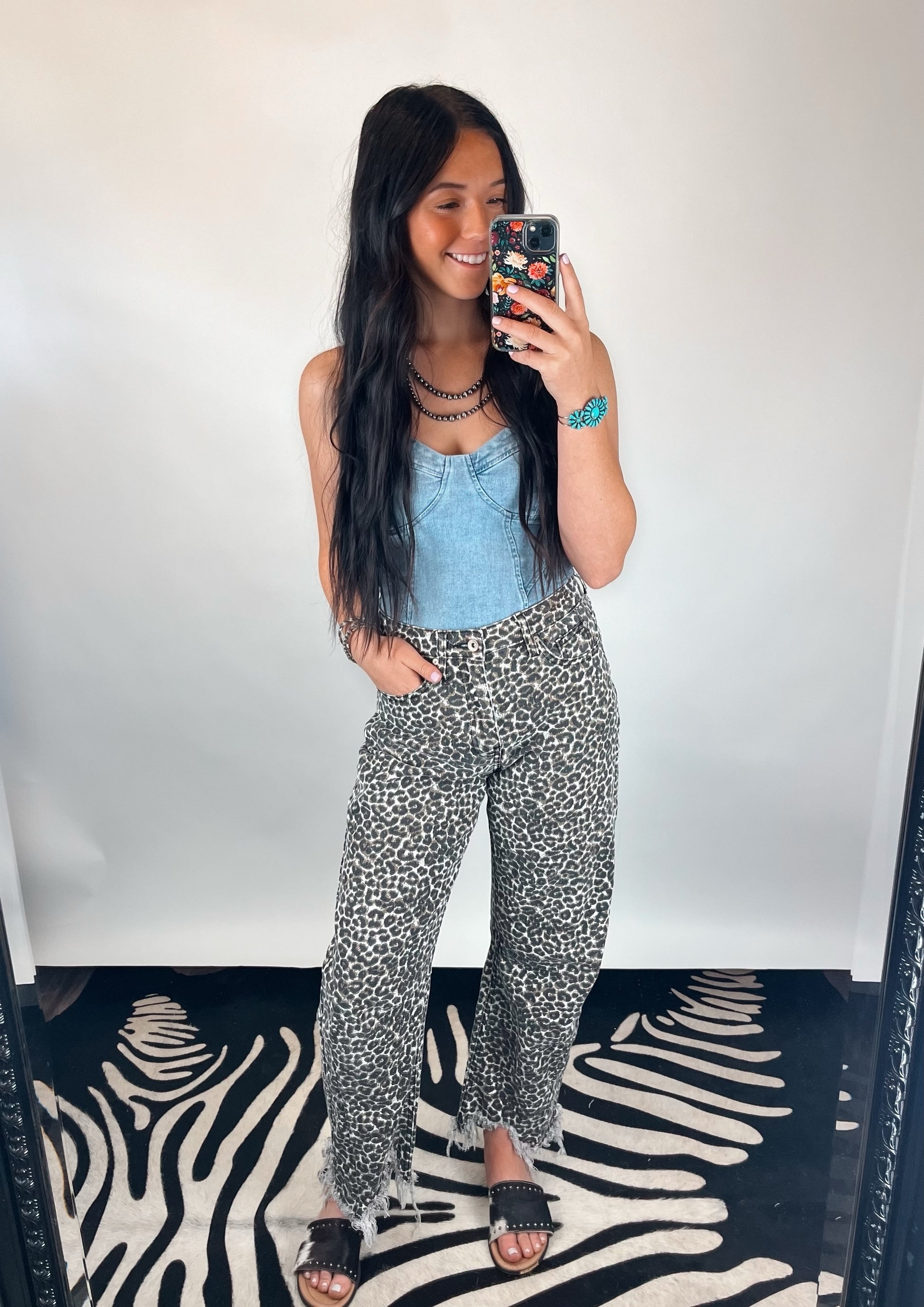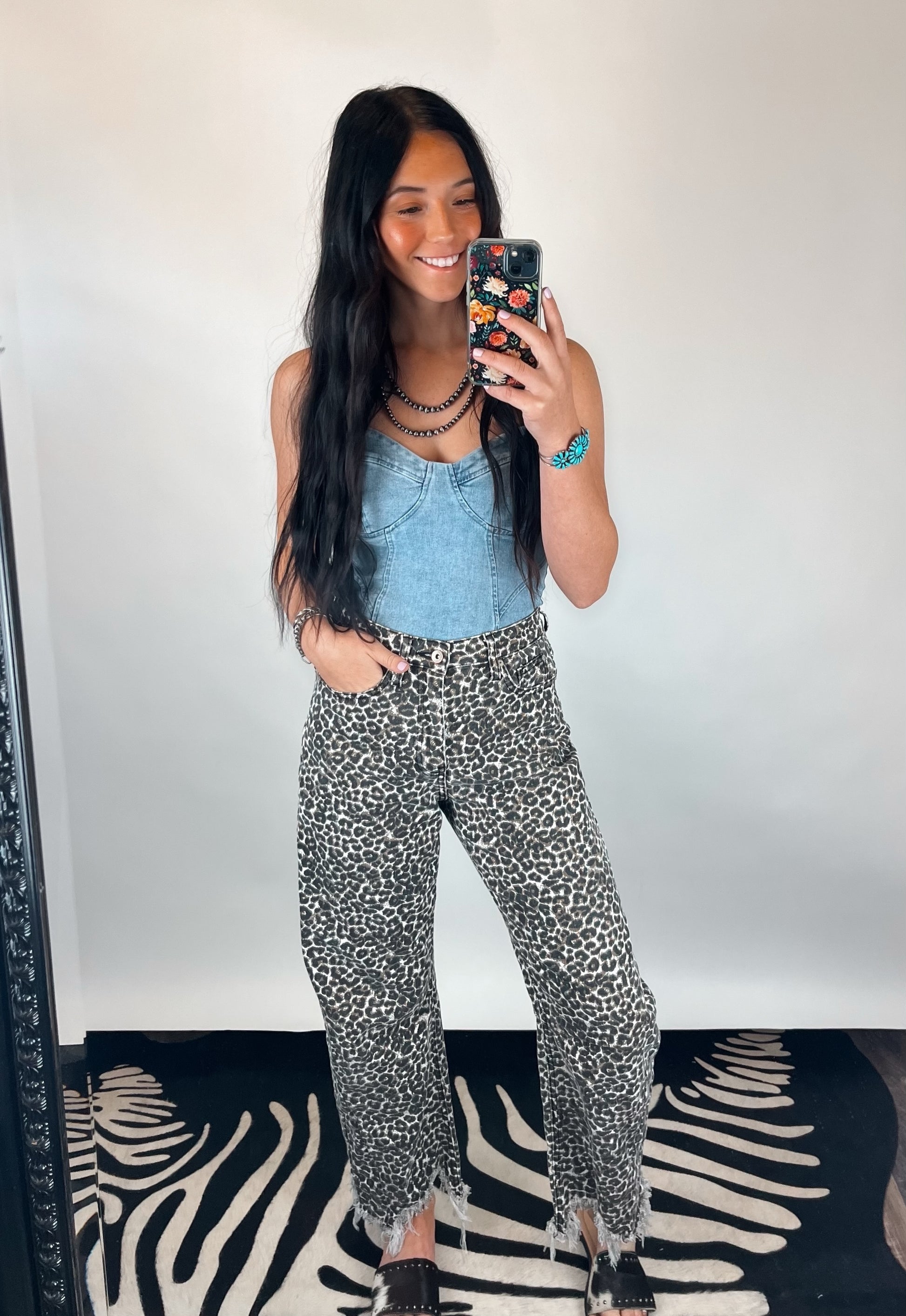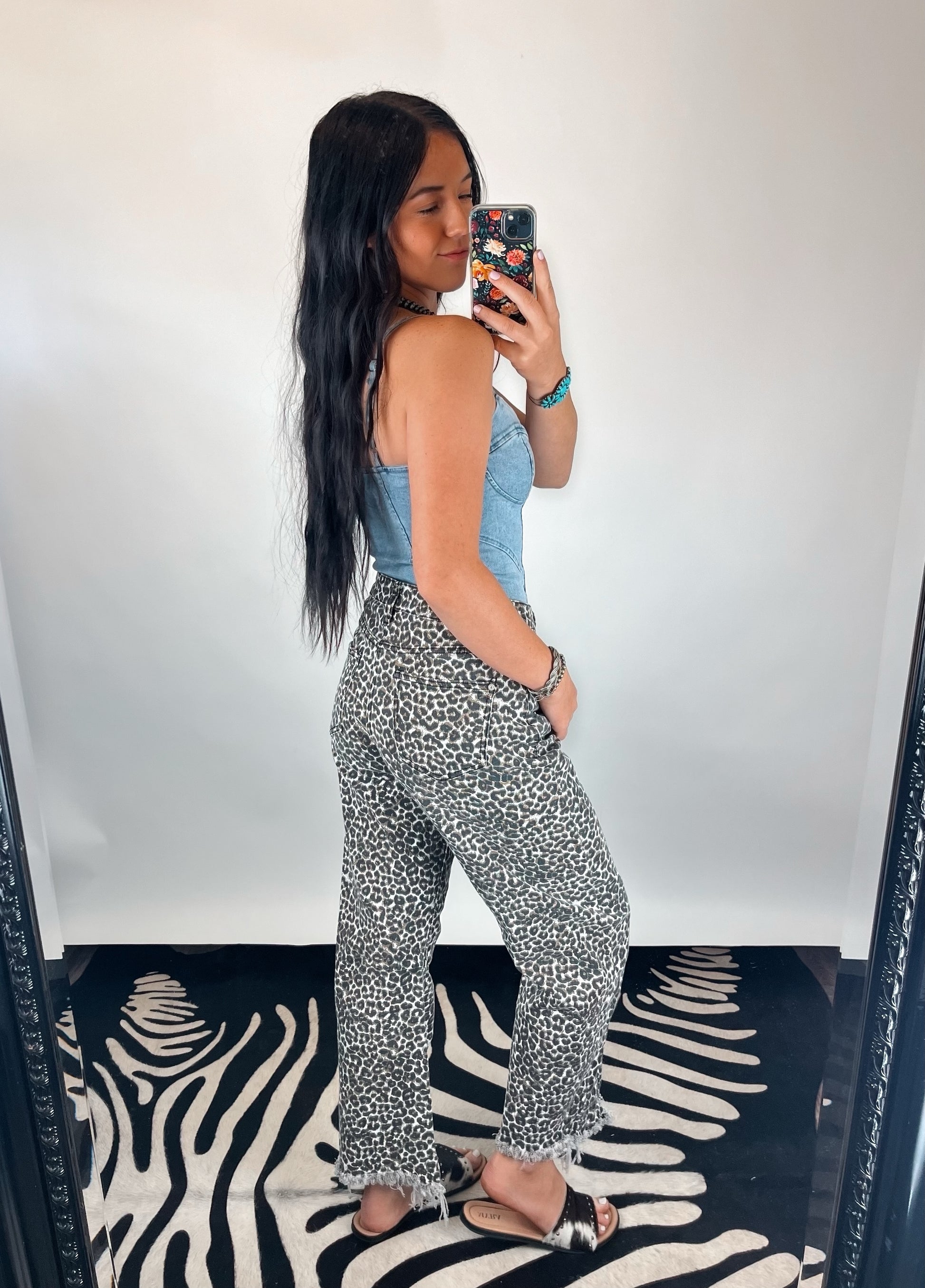 Raw hem leopard print barrel jeans. Medium stretch material. Button & zipper fly. Comfortable looser fit.