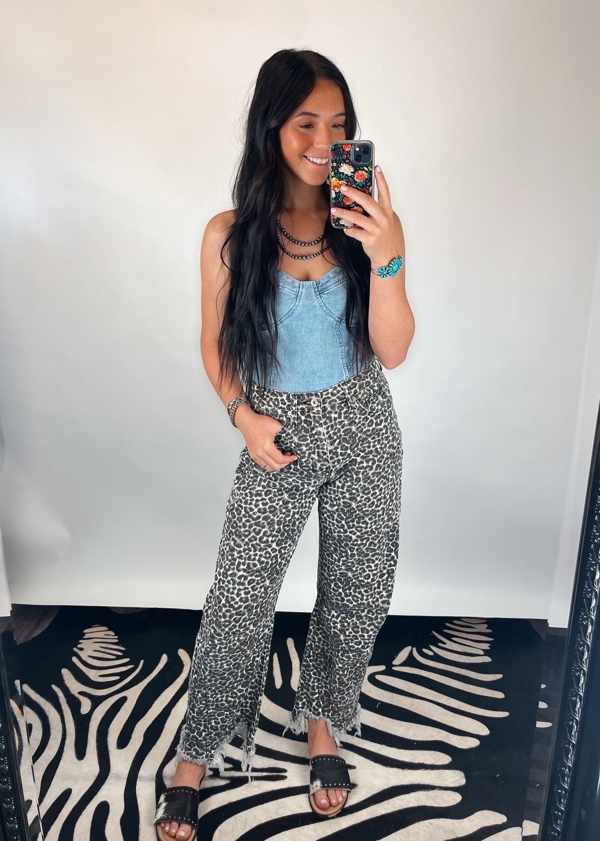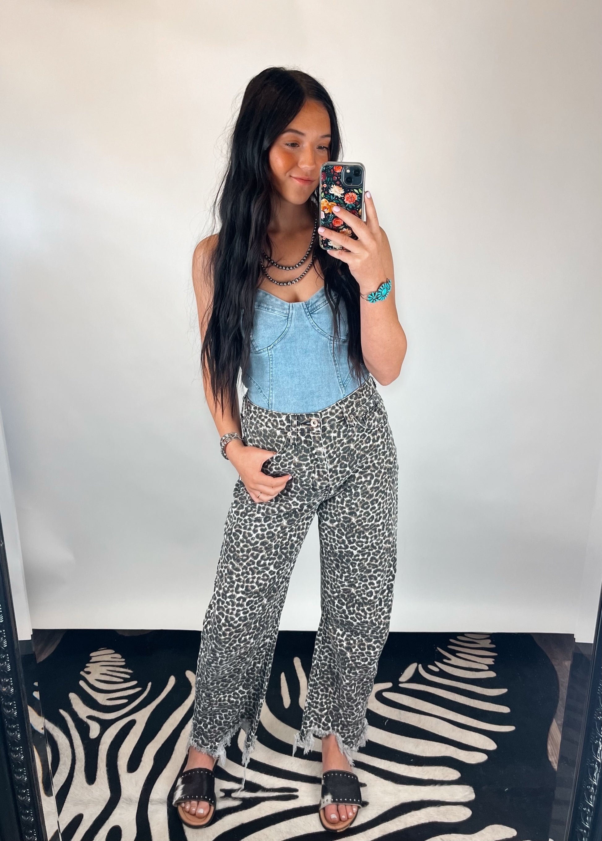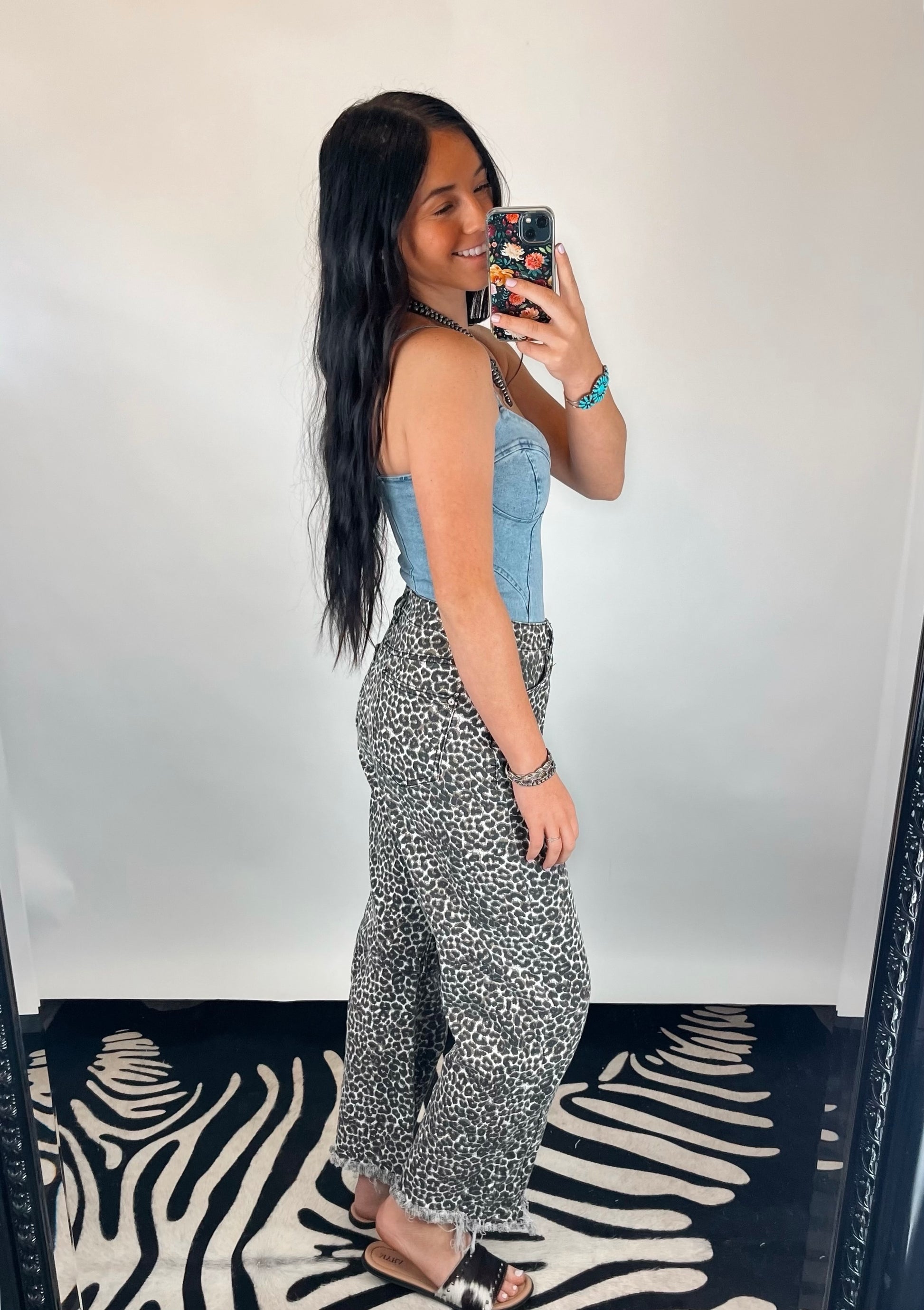 Raw hem leopard print barrel jeans. Medium stretch material. Button & zipper fly. Comfortable looser fit.