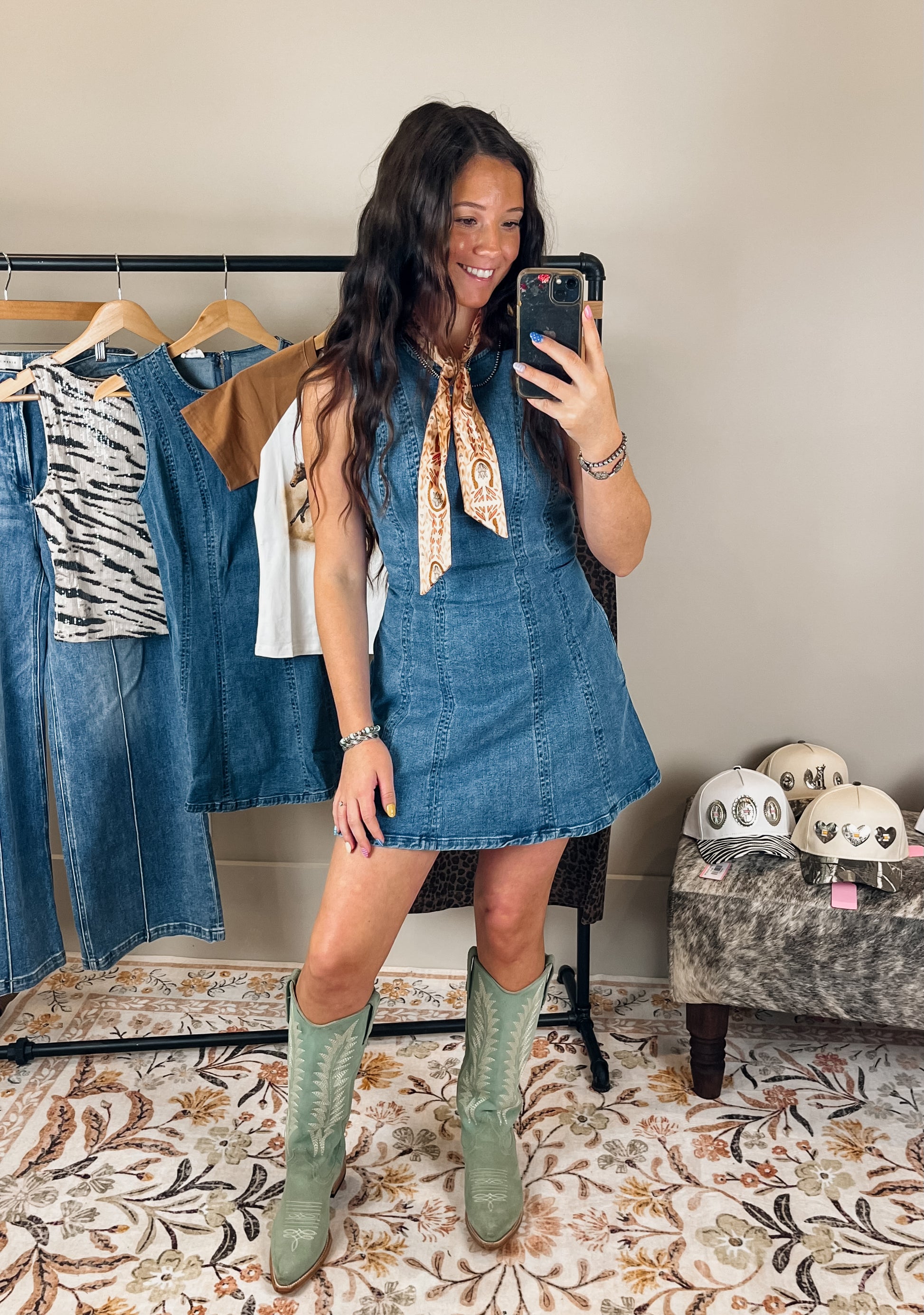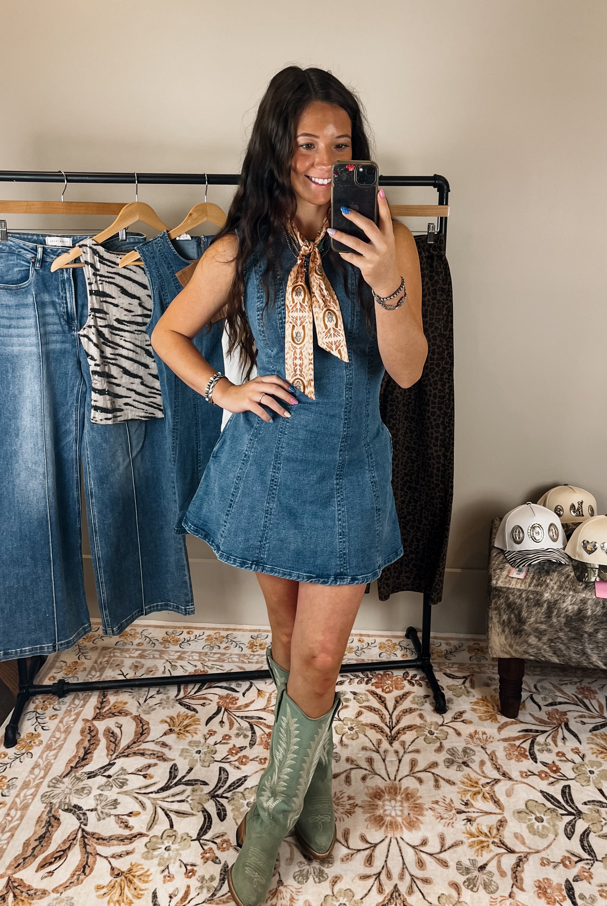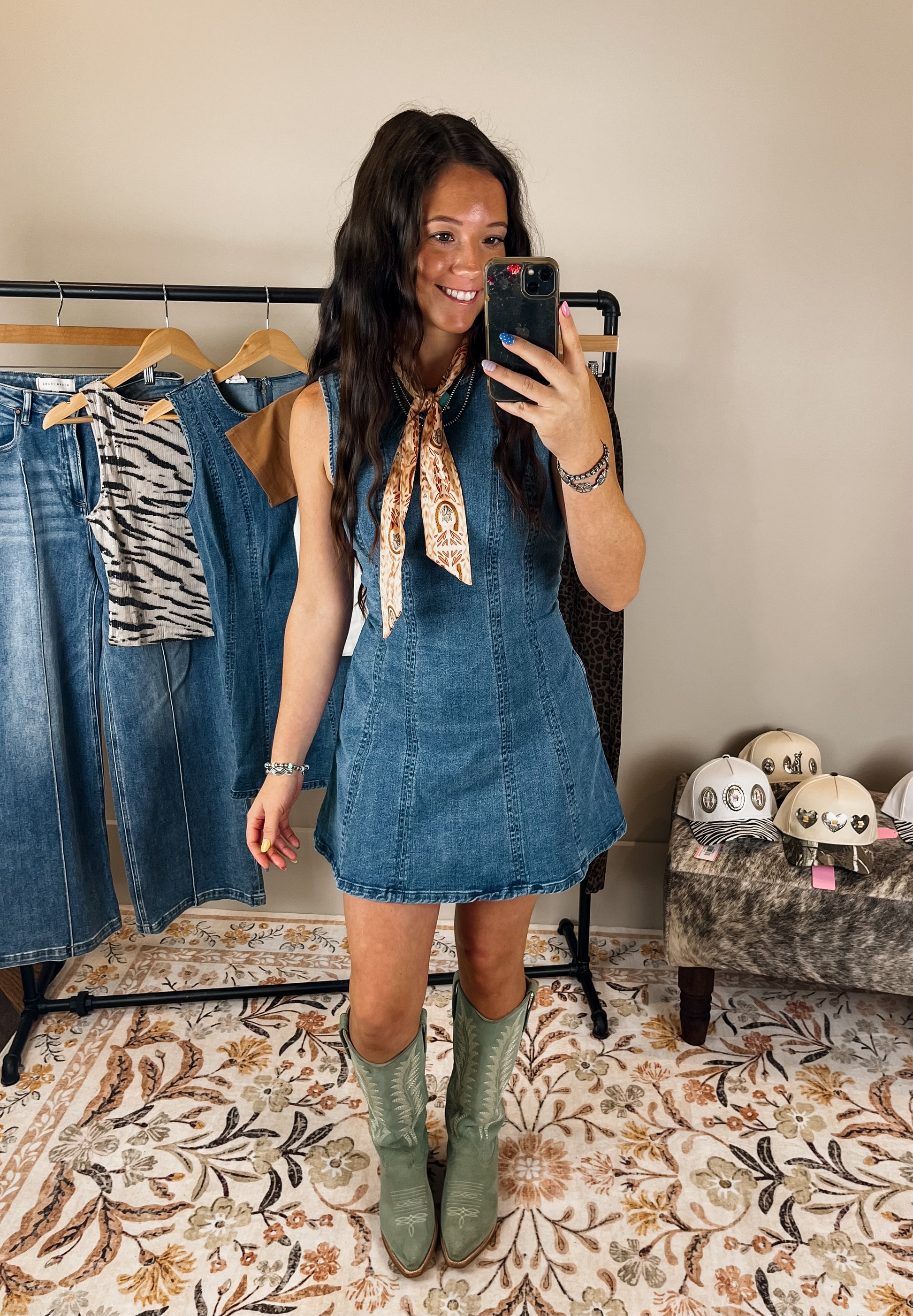 Fit & flare denim dress with the cutest seam details. Super stretchy material. Zips in the back. Has functional pockets.