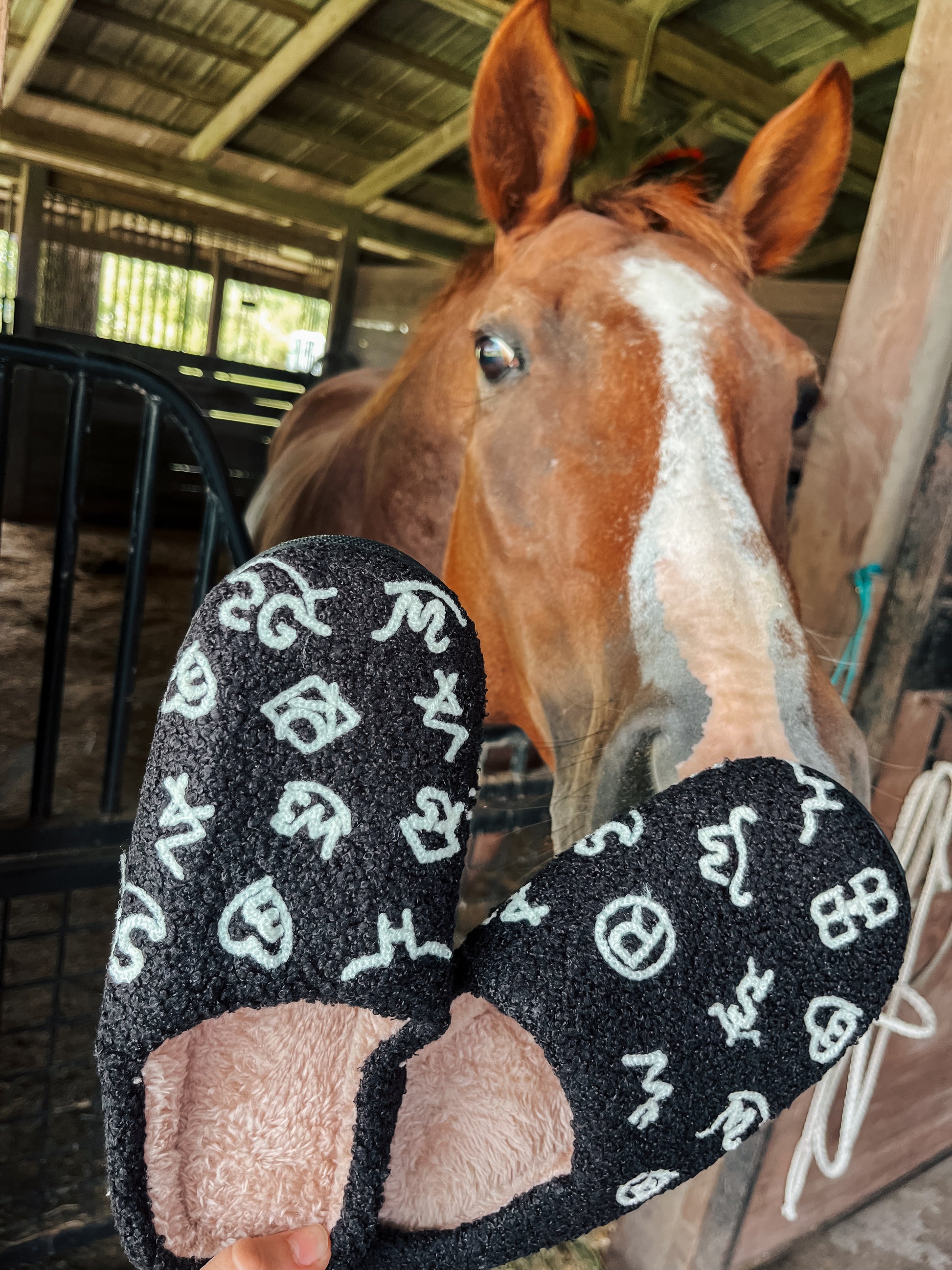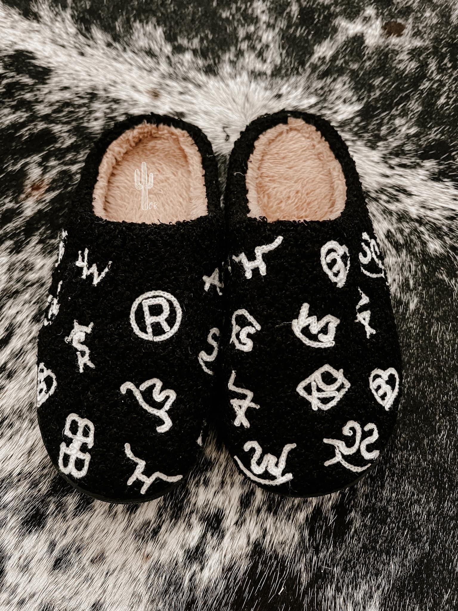 Fuzzy black slippers with cattle brand graphic. If you are between sizes, size up.
