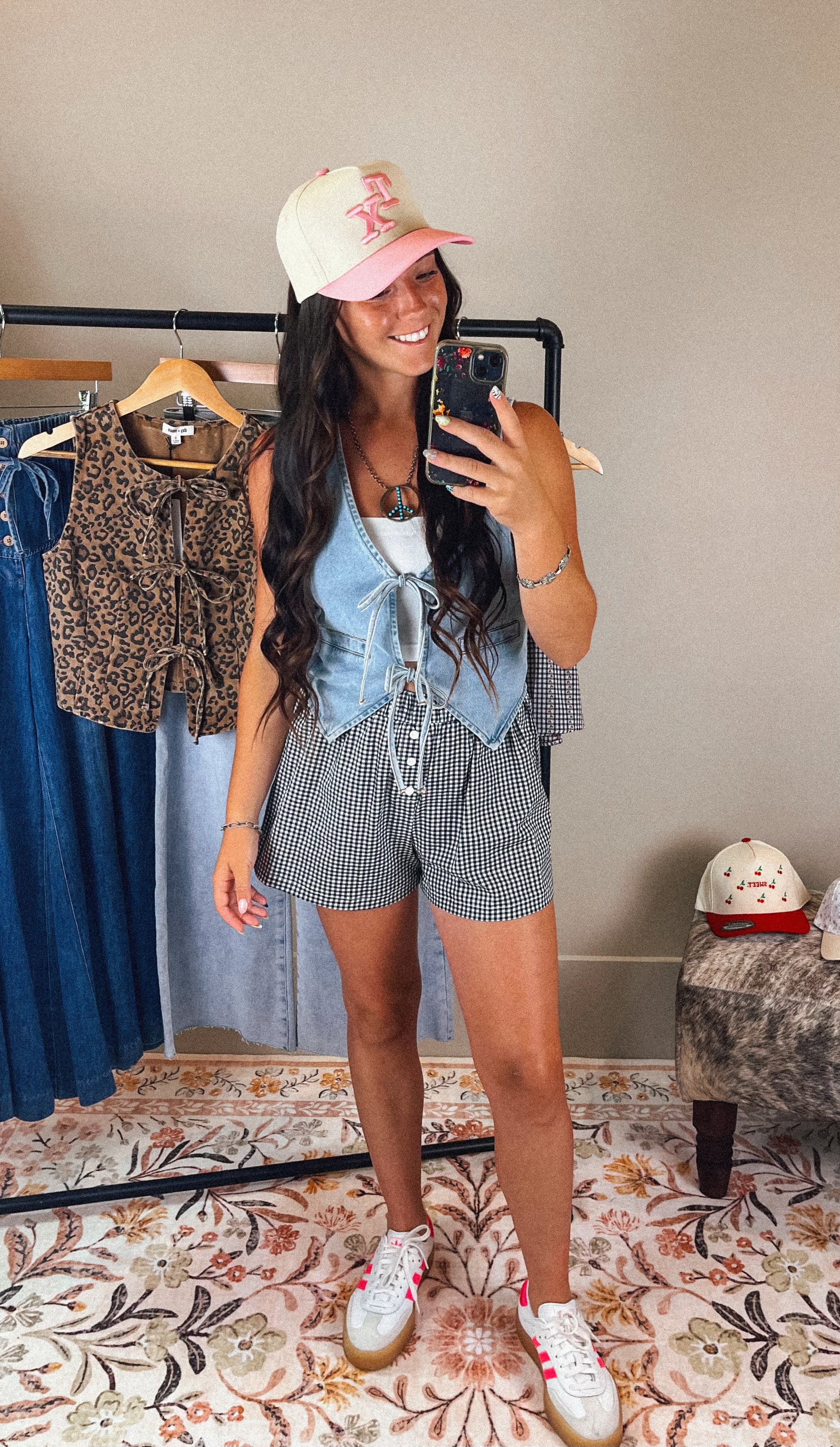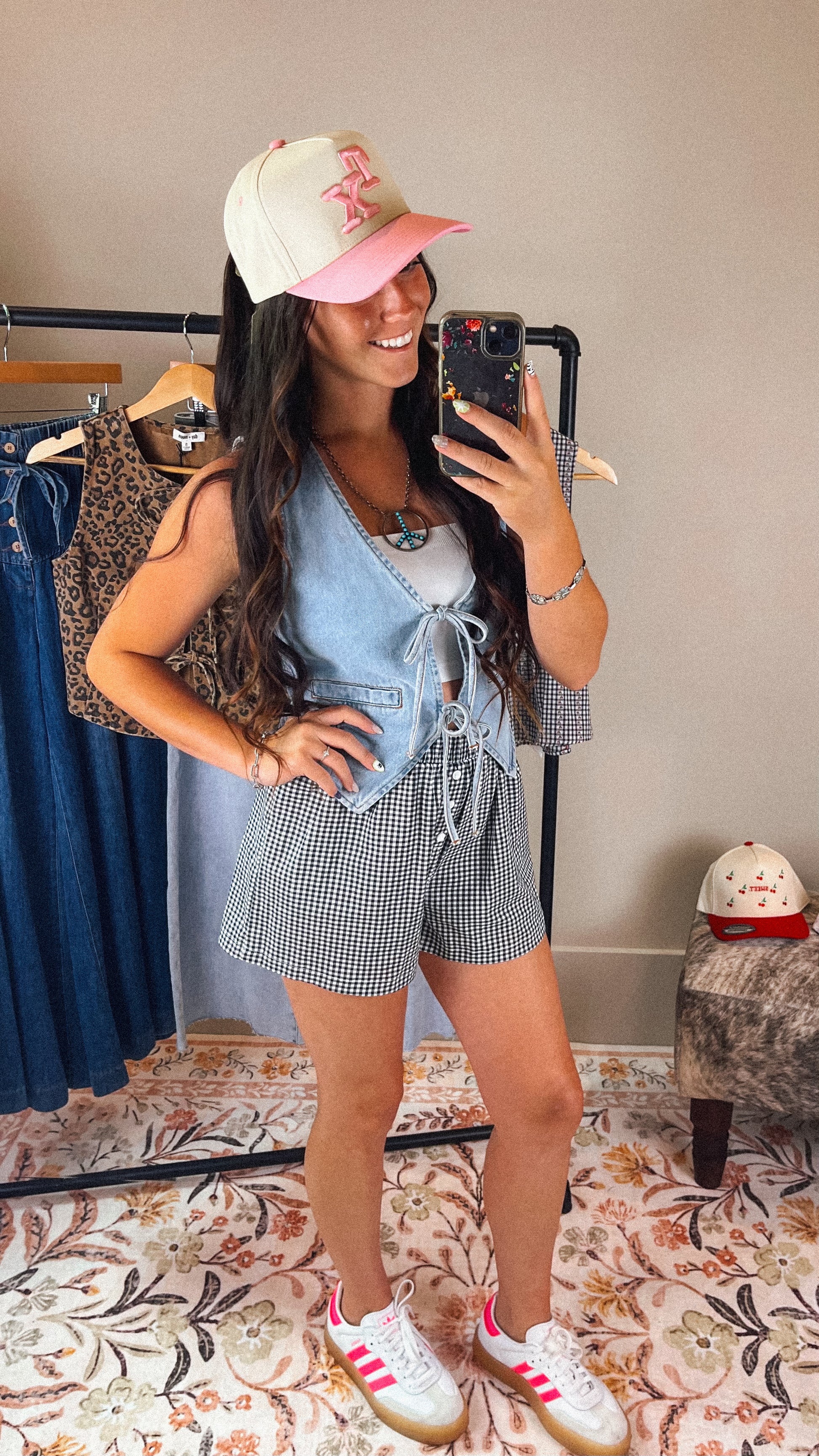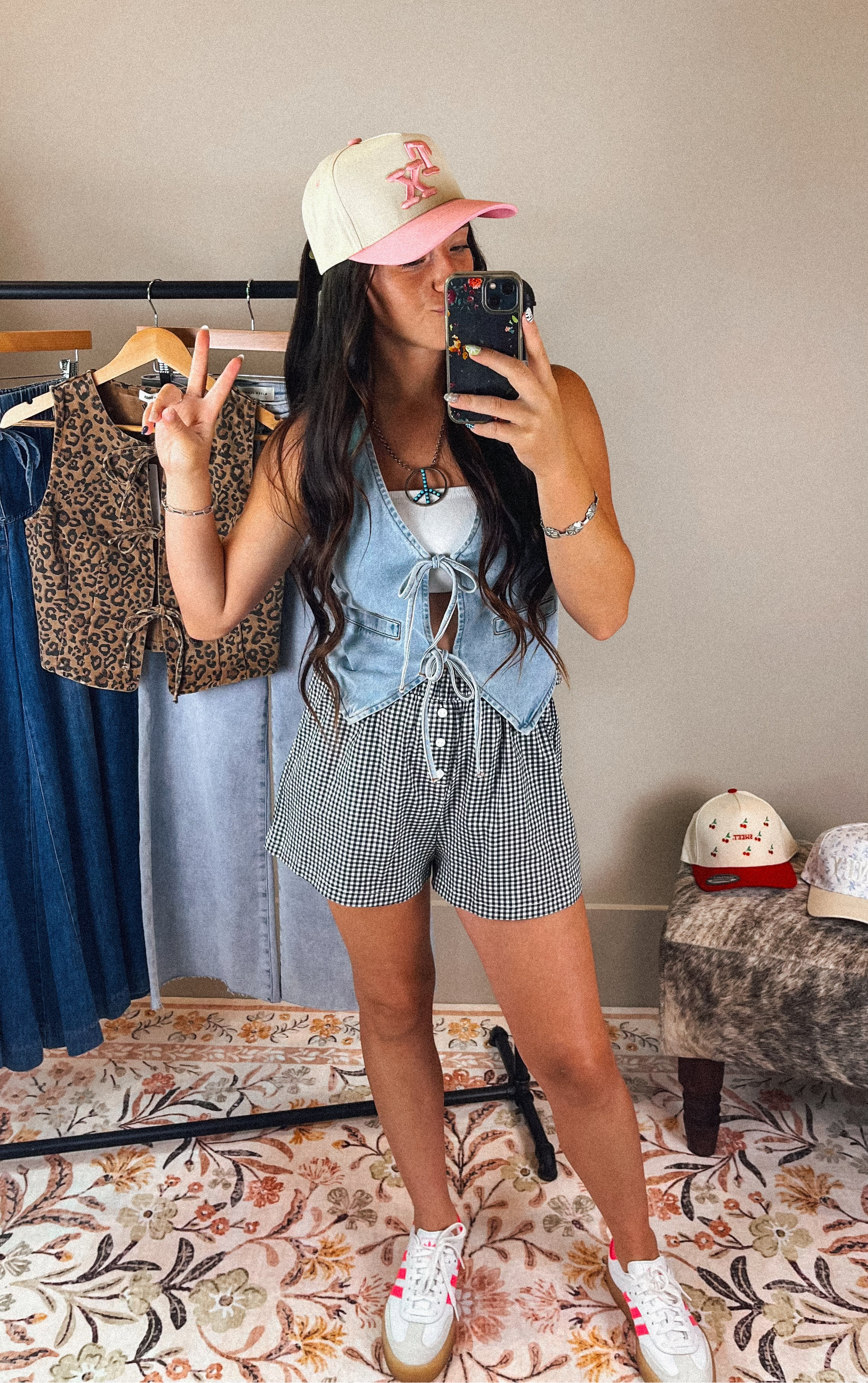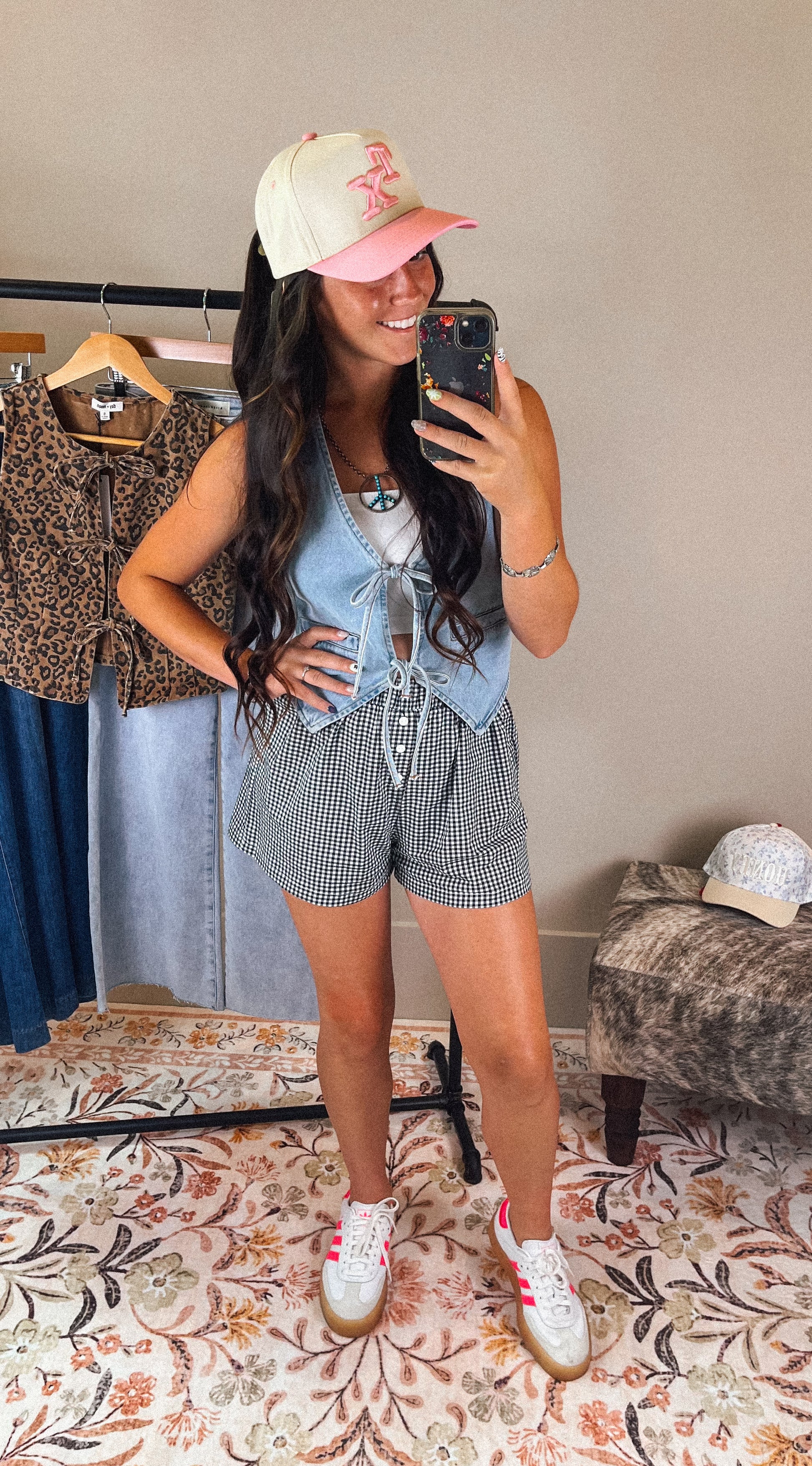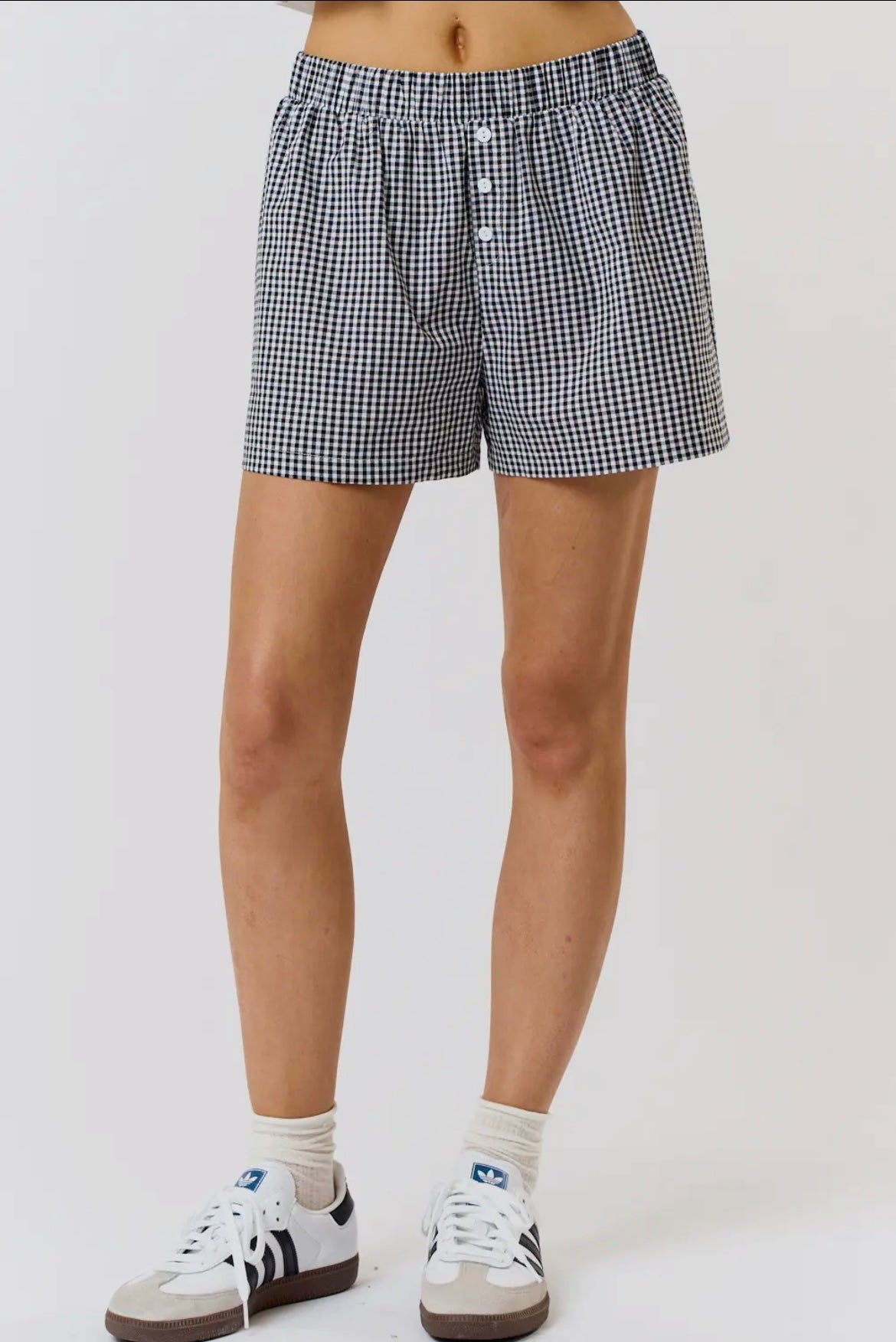Gingham / black & white checker boxer shorts. Elastic waistband, stretchy material. High waisted but can be rolled at the waistband or pulled down & worn lower.