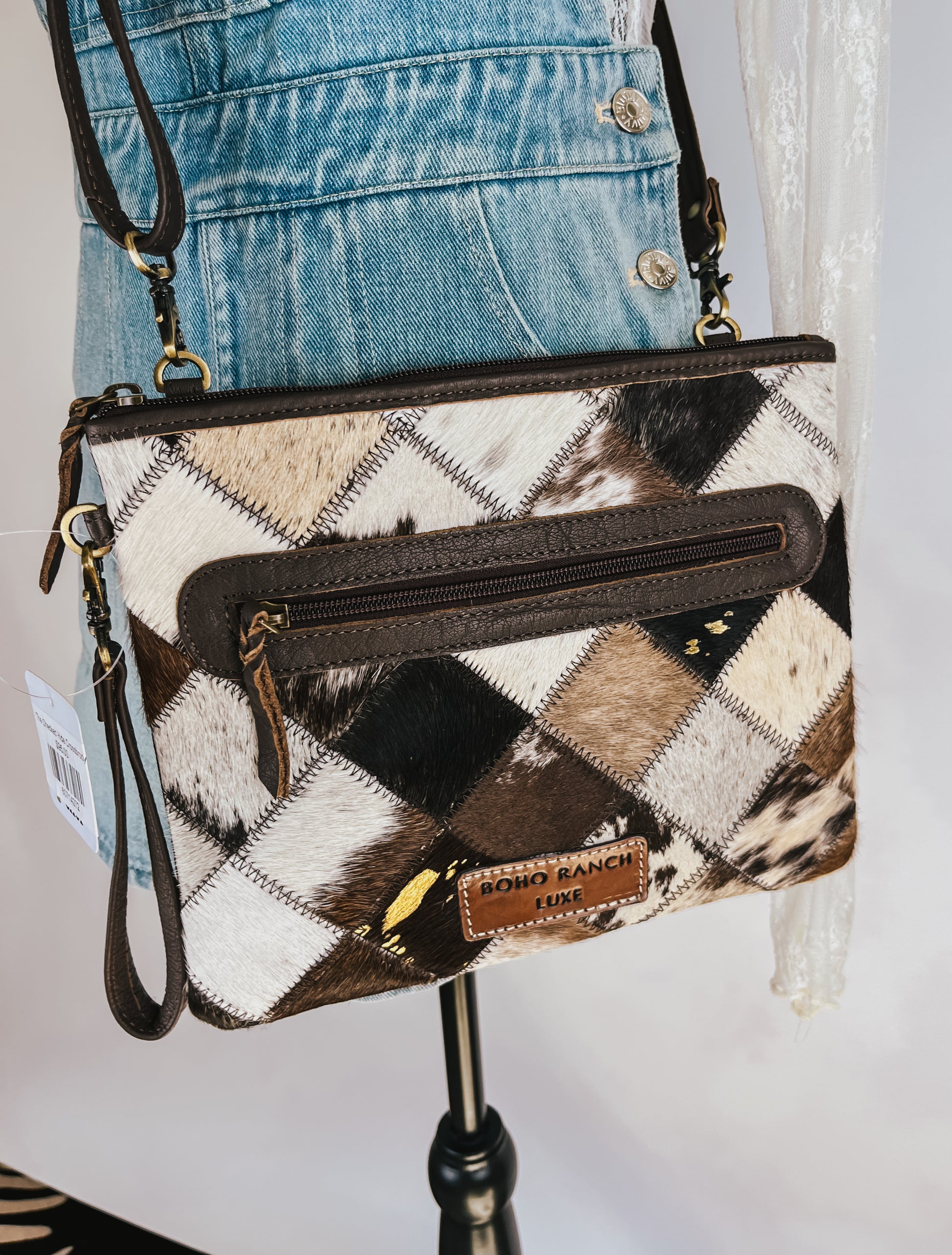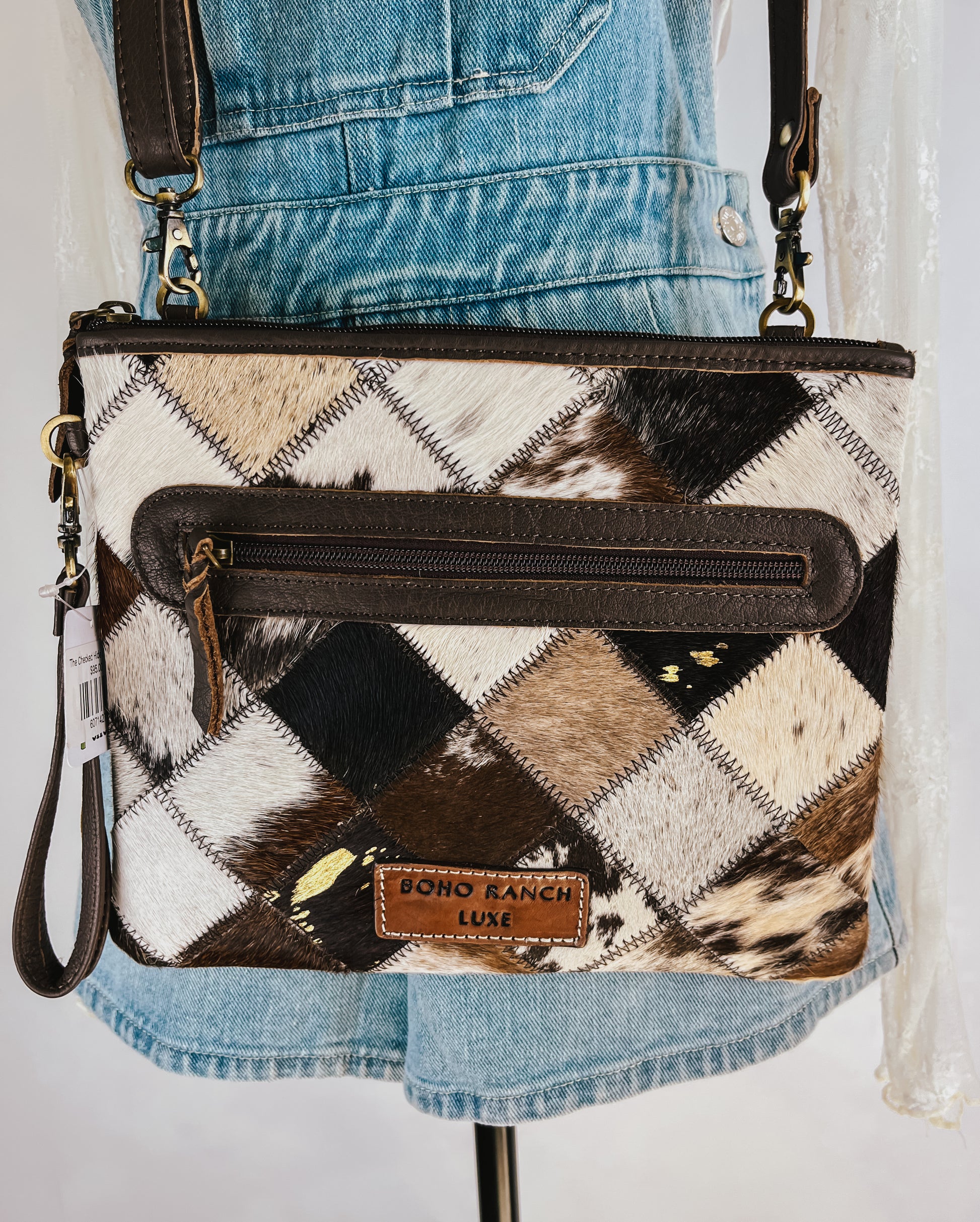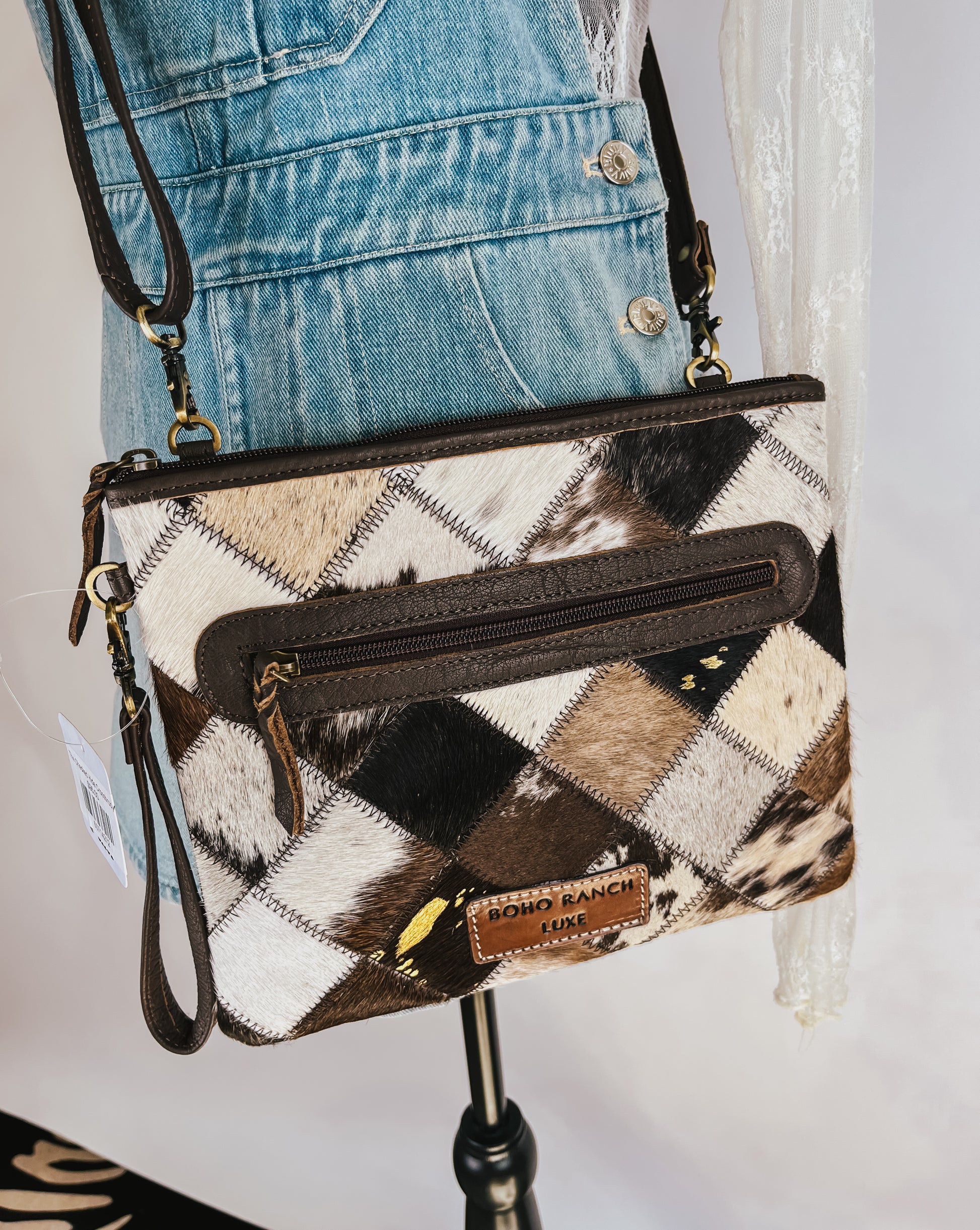 Diamond check genuine cowhide. Dark chocolate leather. Removable adjustable strap & wristlet strap. Concealed pocket on the back.