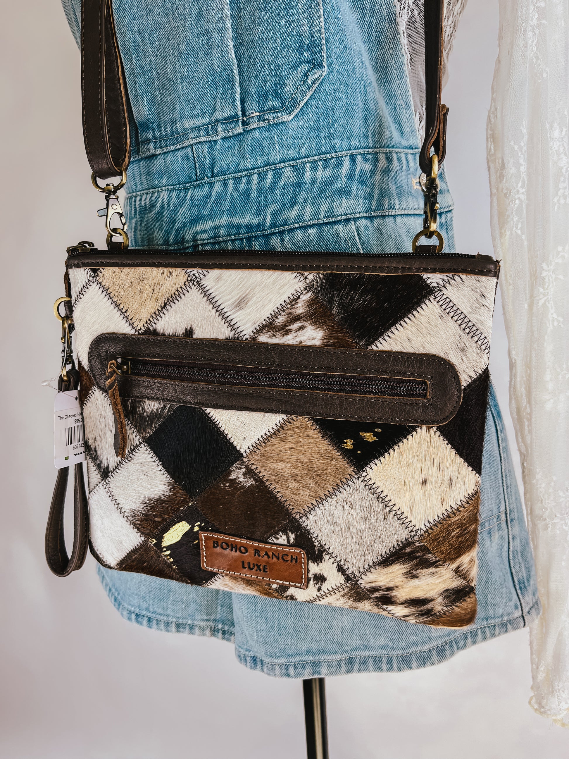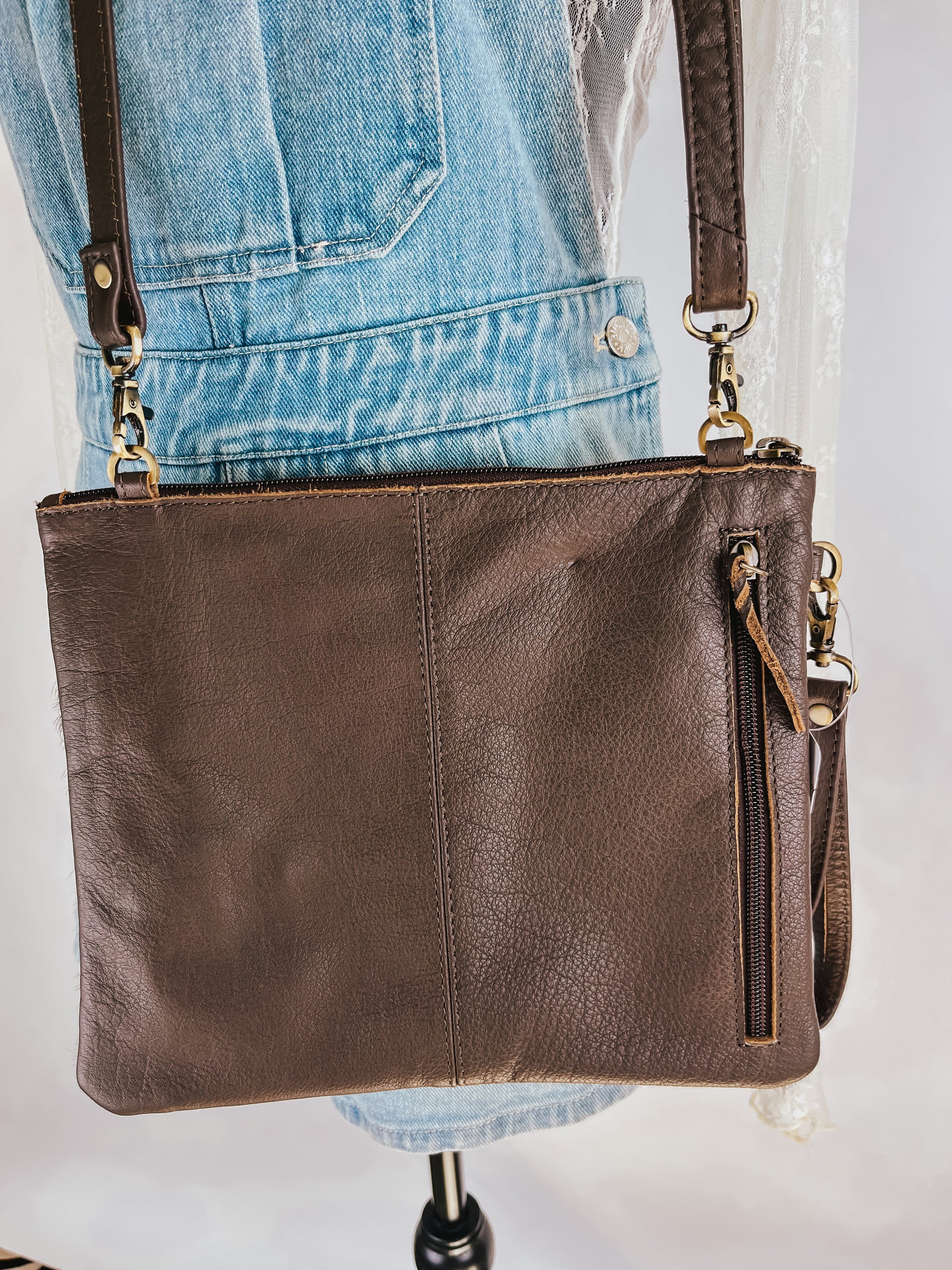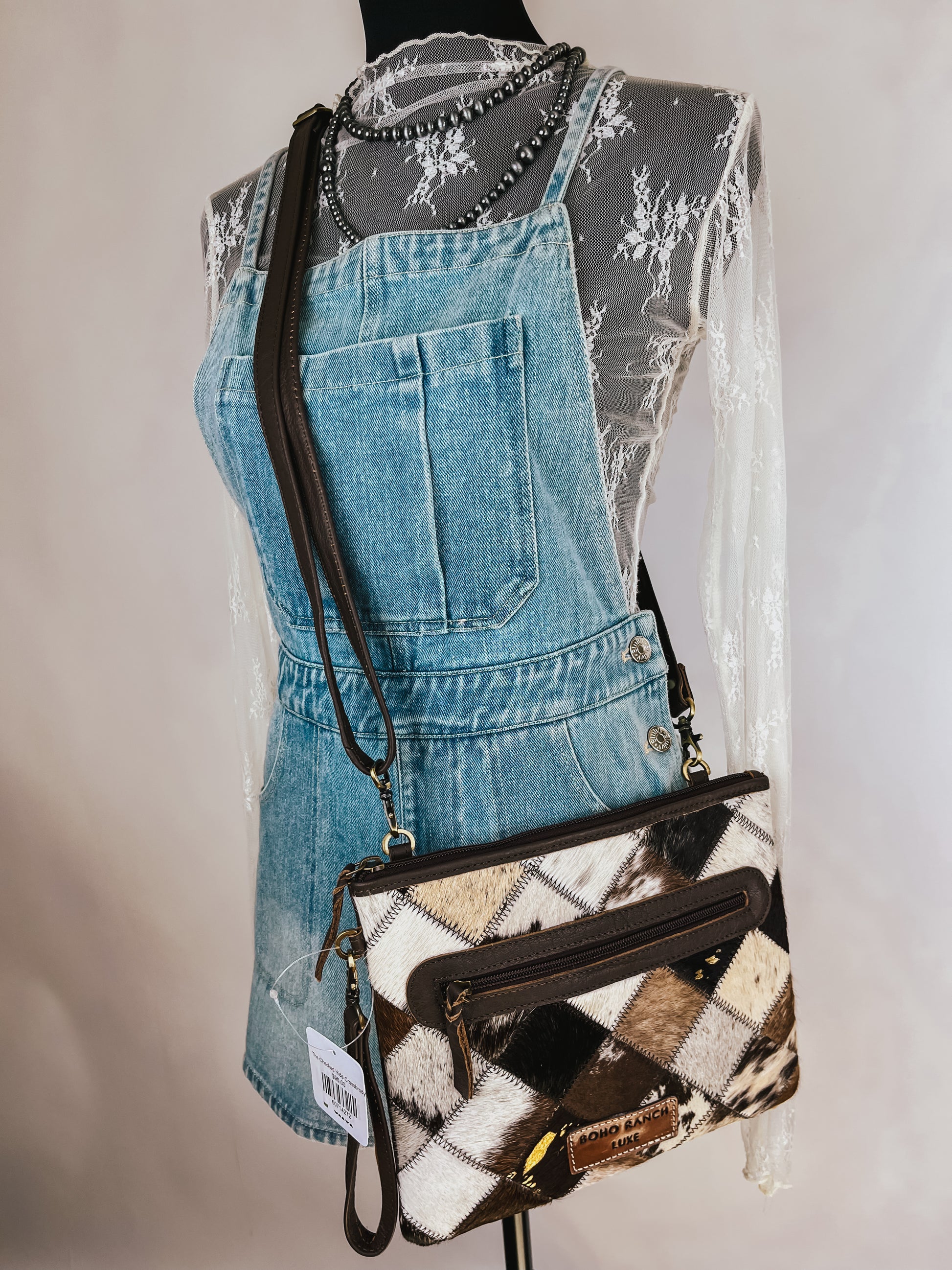 Diamond check genuine cowhide. Dark chocolate leather. Removable adjustable strap & wristlet strap. Concealed pocket on the back.