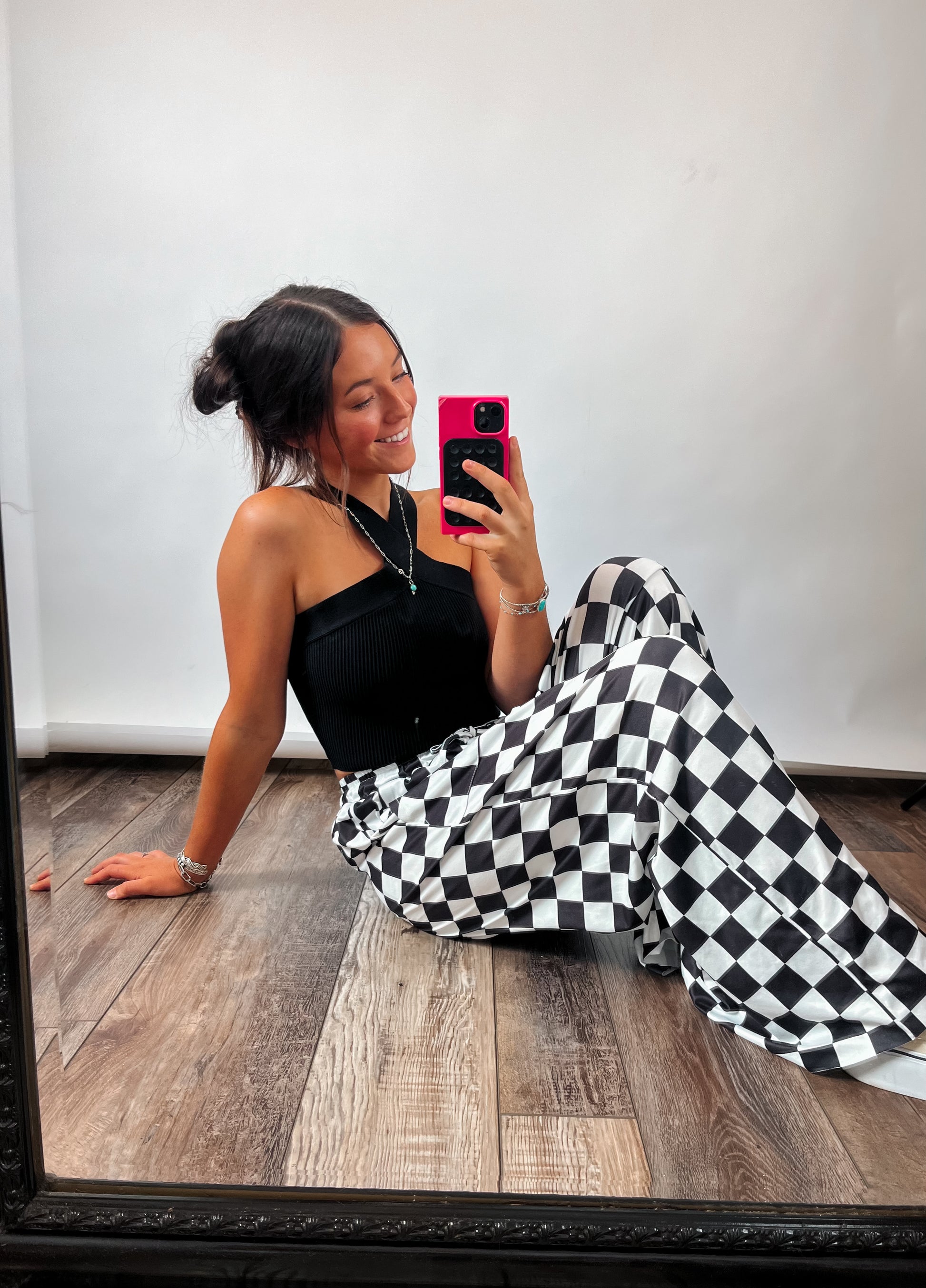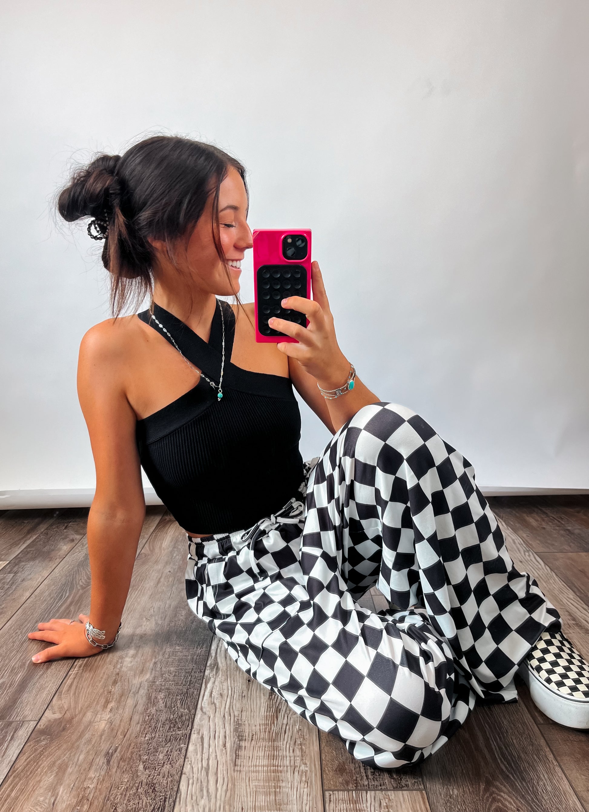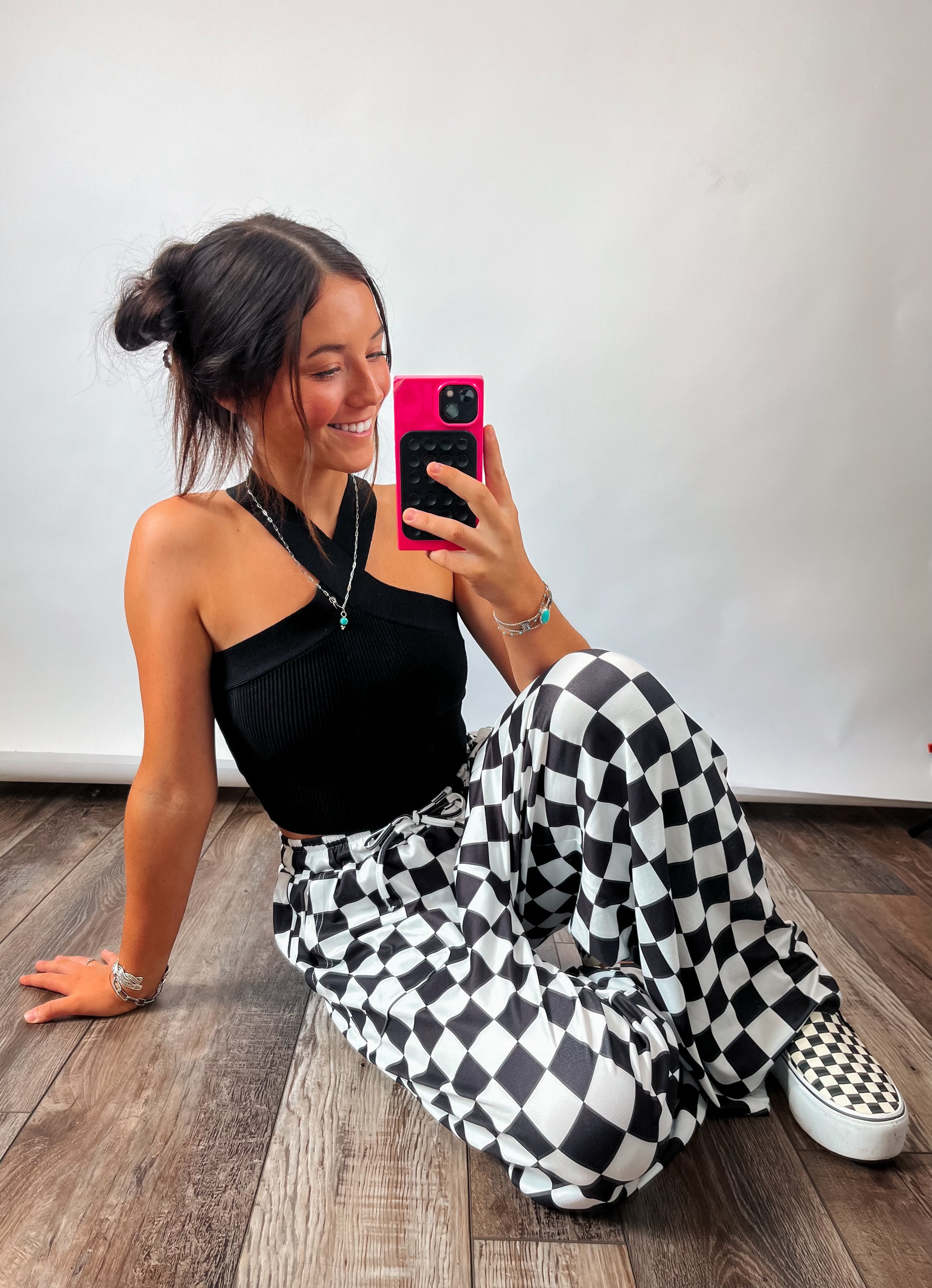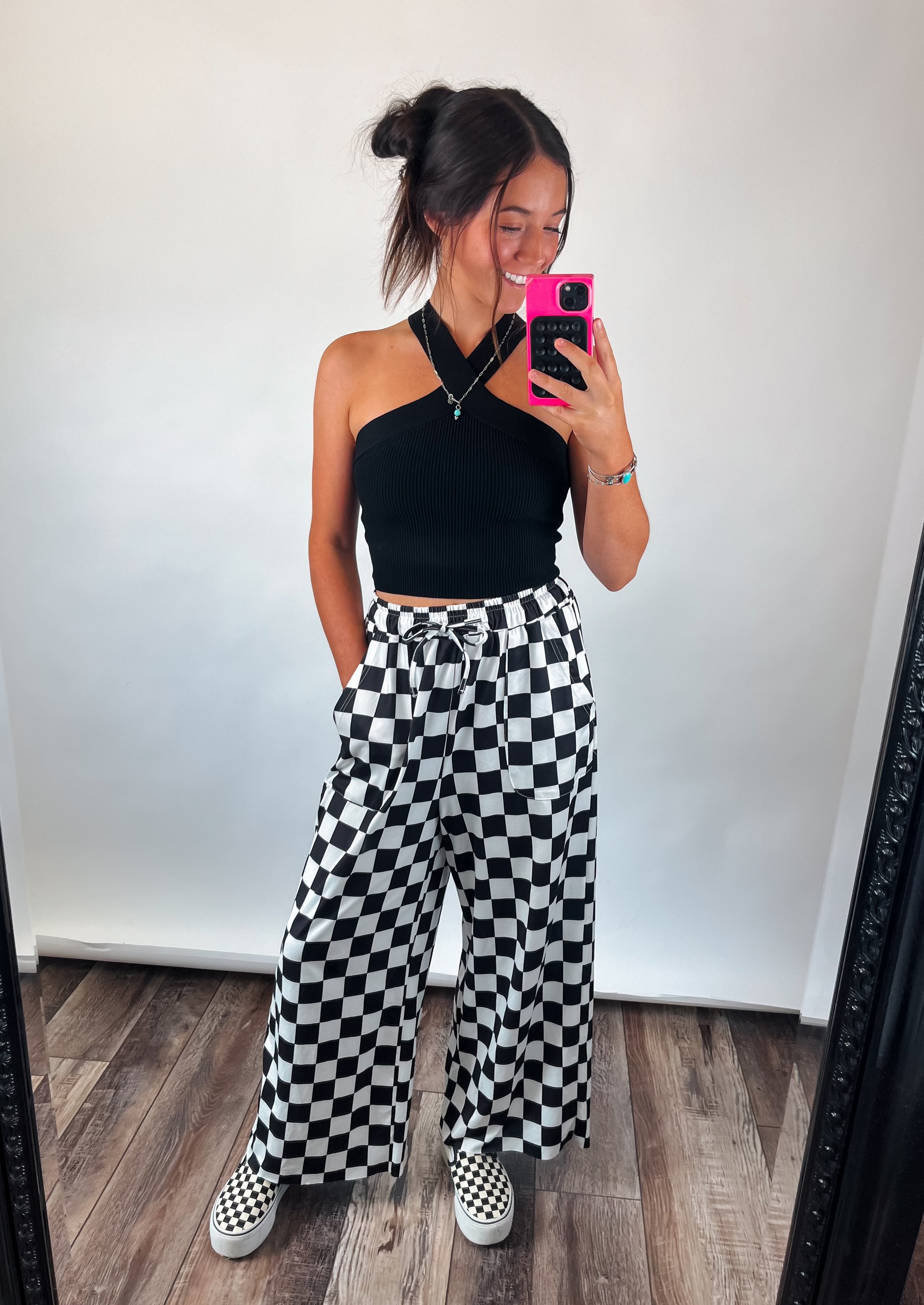 Check these out🏁 Checker print pattern, wide leg ankle crop fit. These pants are extremely stretchy & comfortable, made from a lightweight & flowy material so you can still wear them in the heat of the summer.