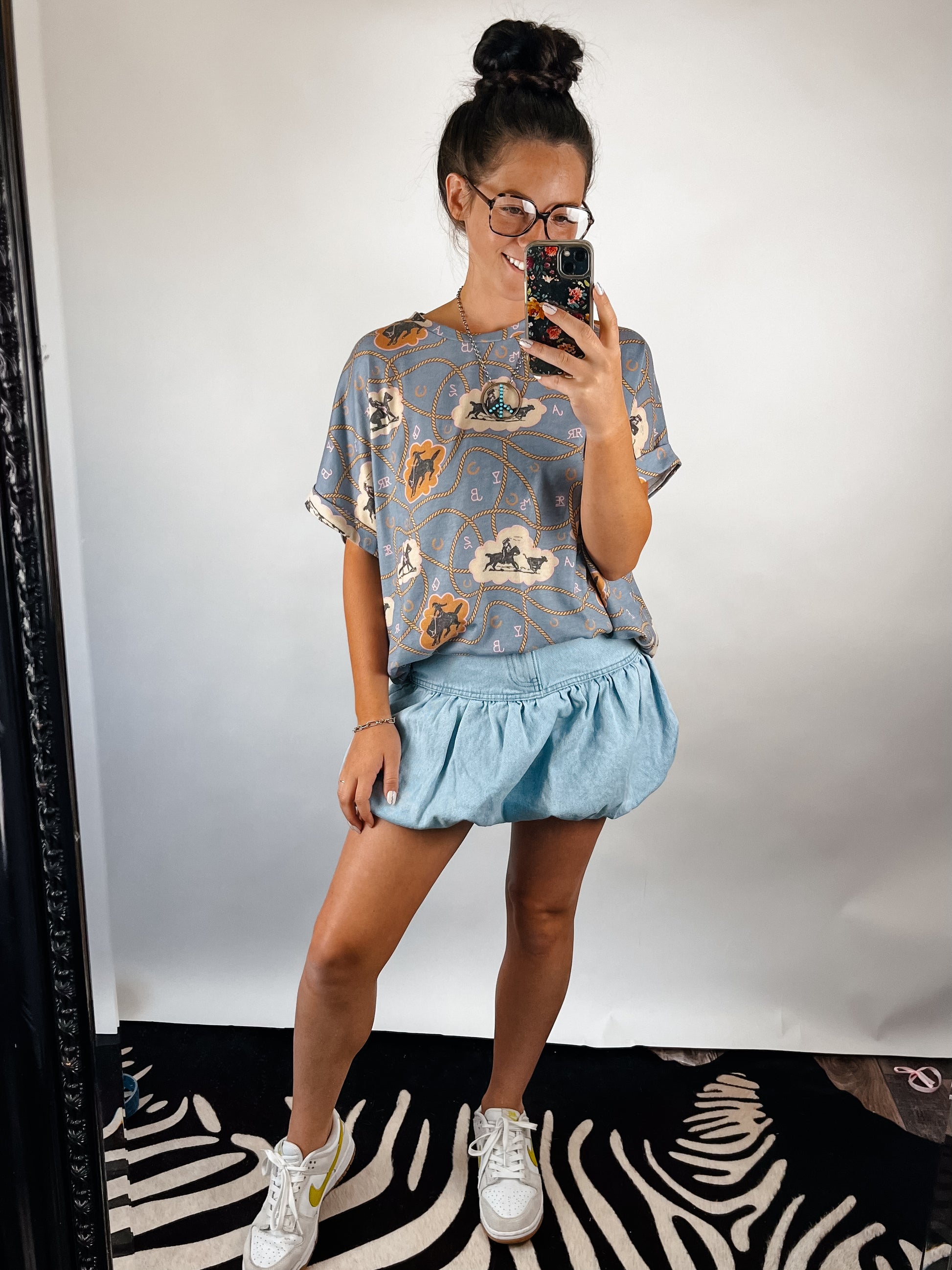 Oversized fit. Western graphic all over on a comfy knit tee.