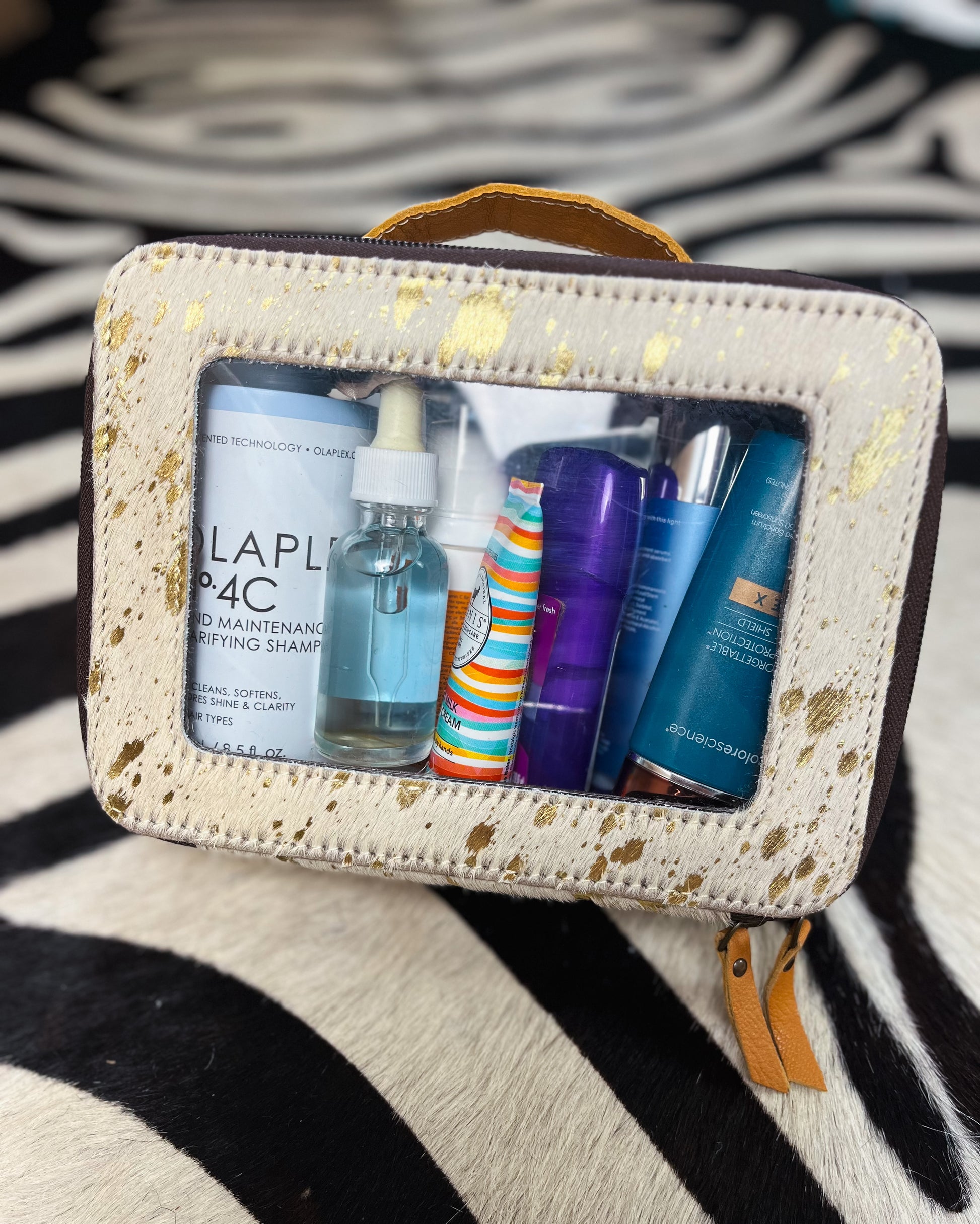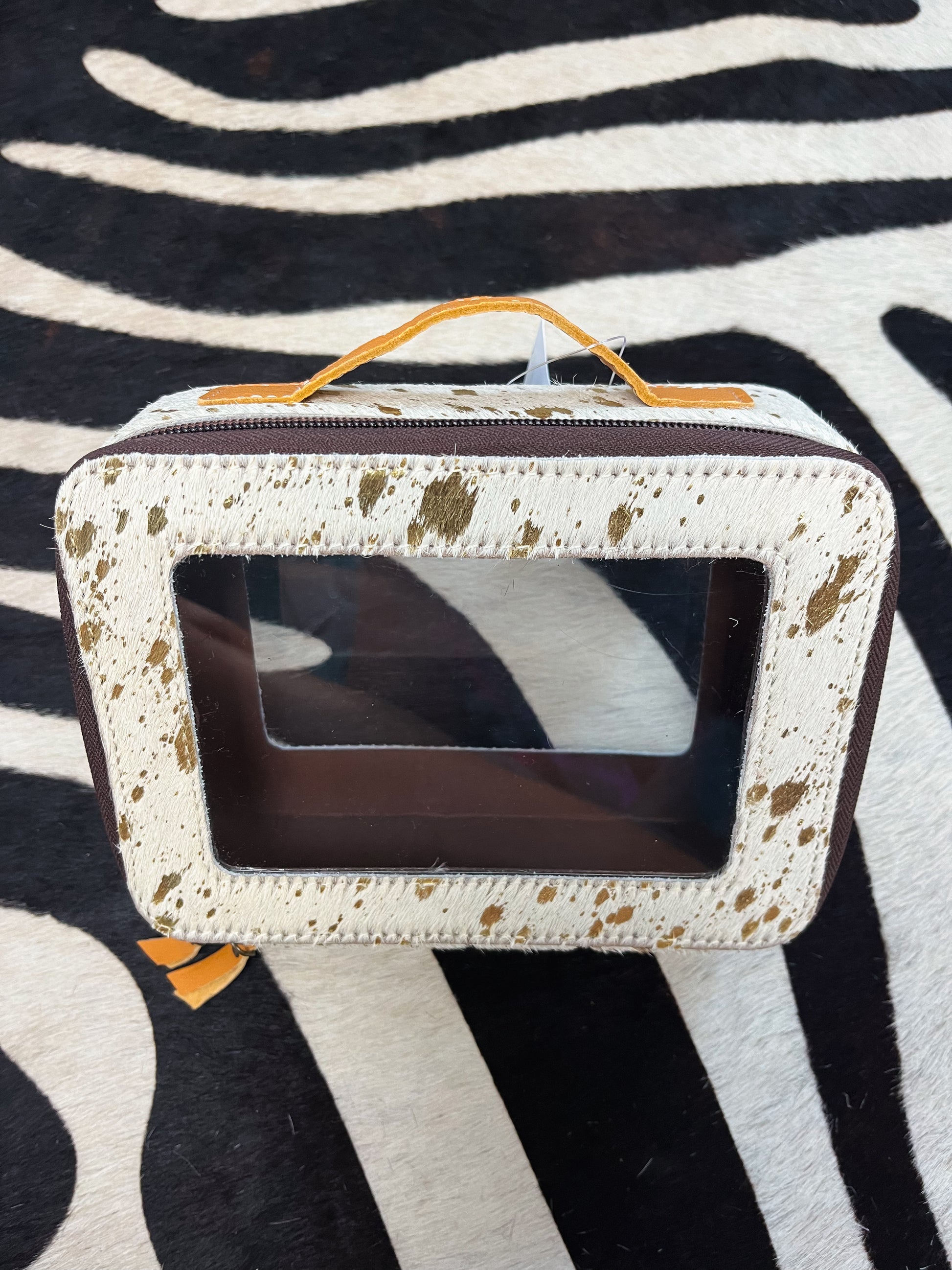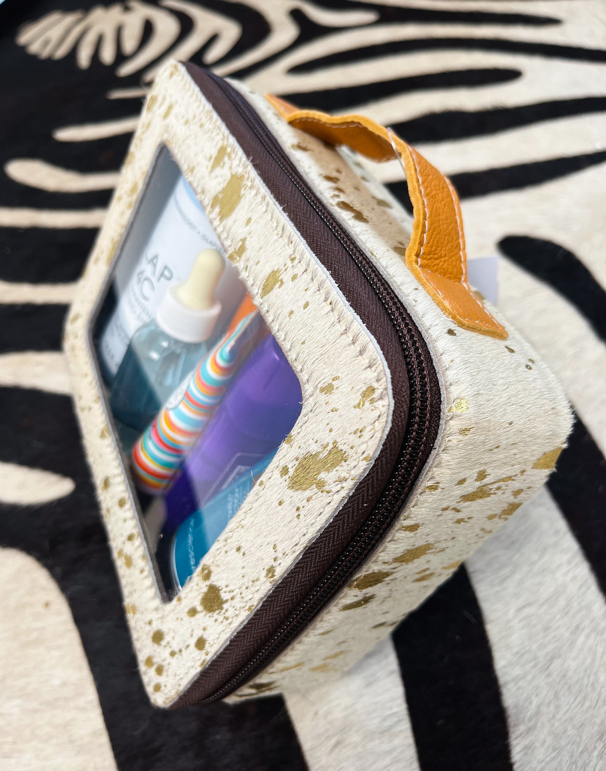 White genuine cowhide with gold splatter. Clear makeup travel case. Leather handle & double leather zippers.