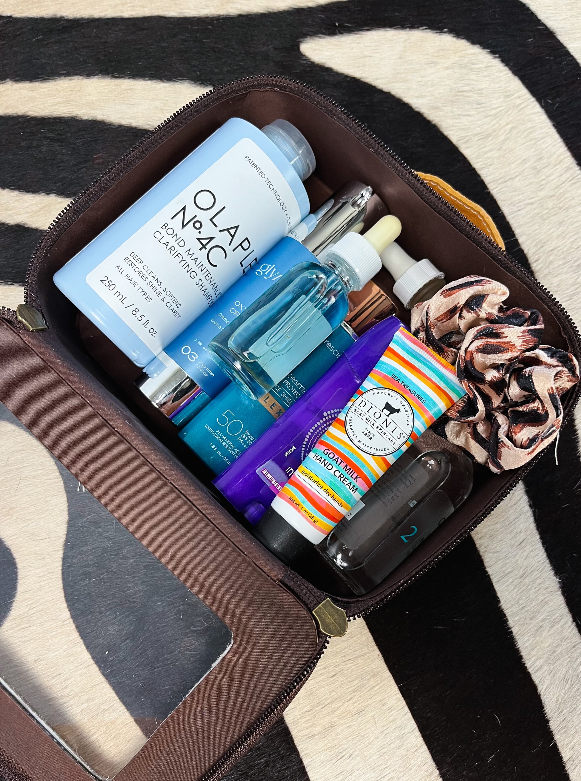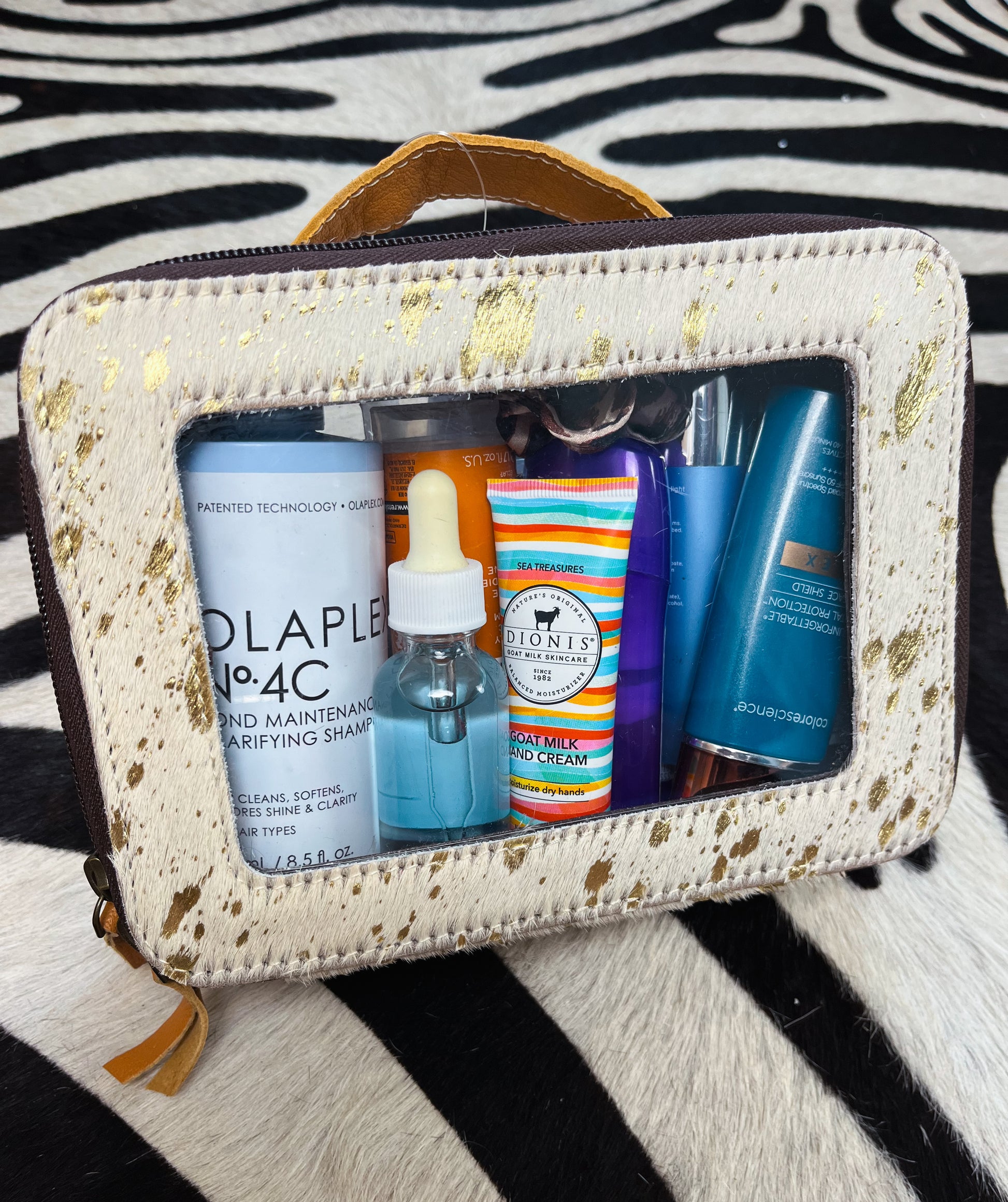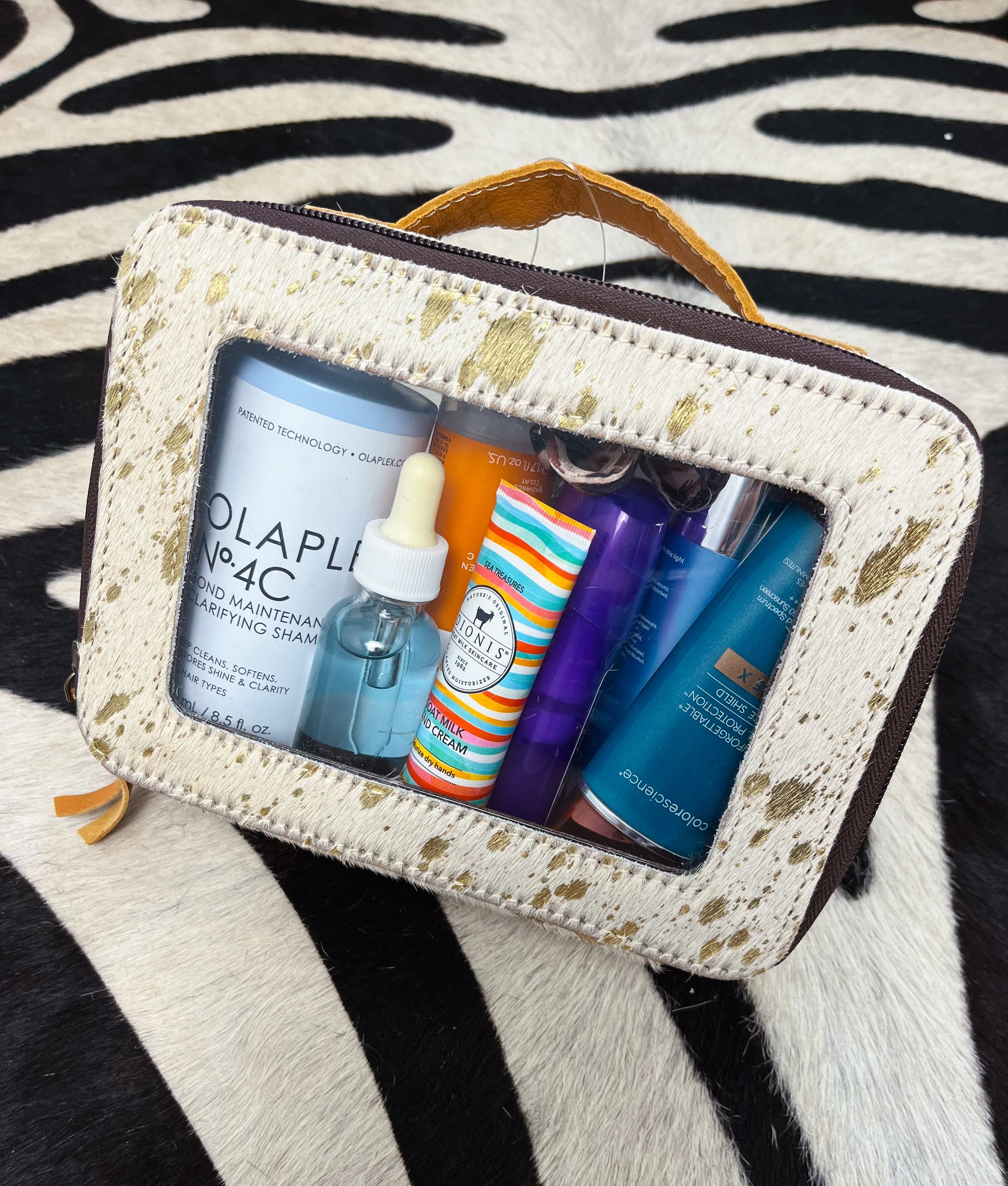 White genuine cowhide with gold splatter. Clear makeup travel case. Leather handle & double leather zippers.