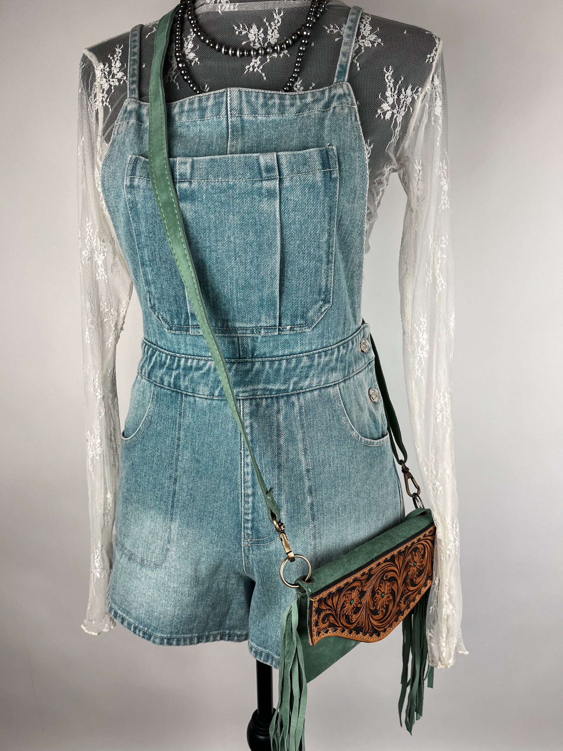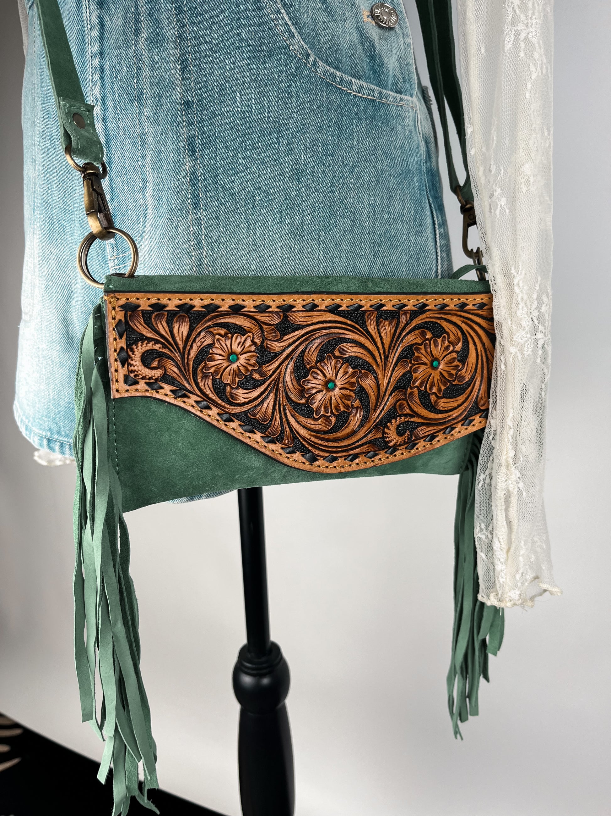 Green suede leather purse w/ matching suede fringe. Tooled leather flap completed with buckstitched border & little green accents to tie it all together.
