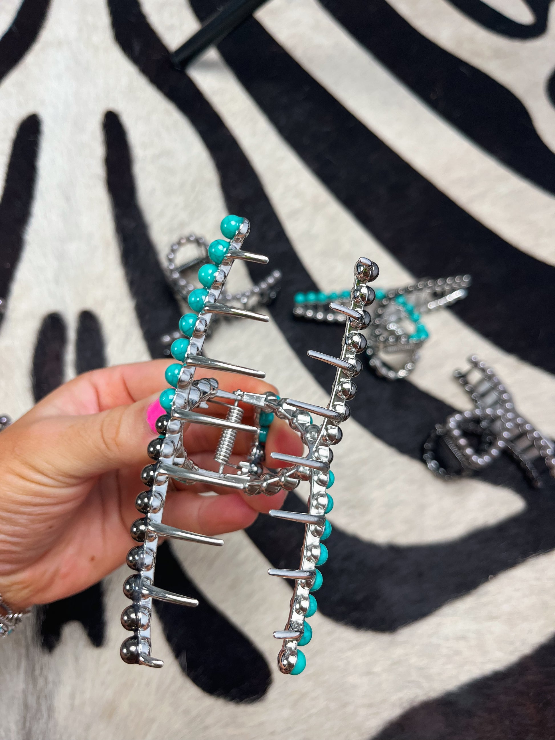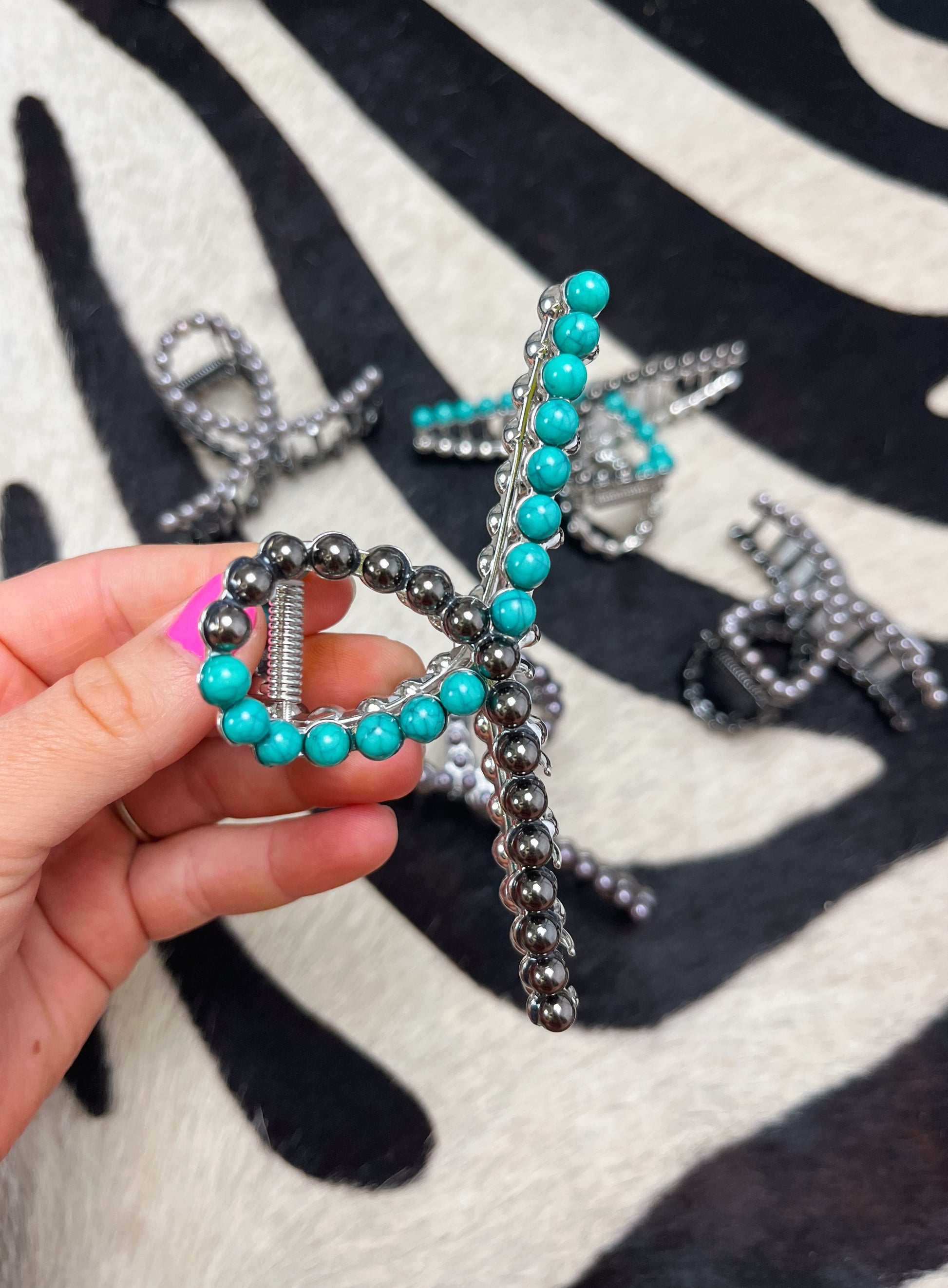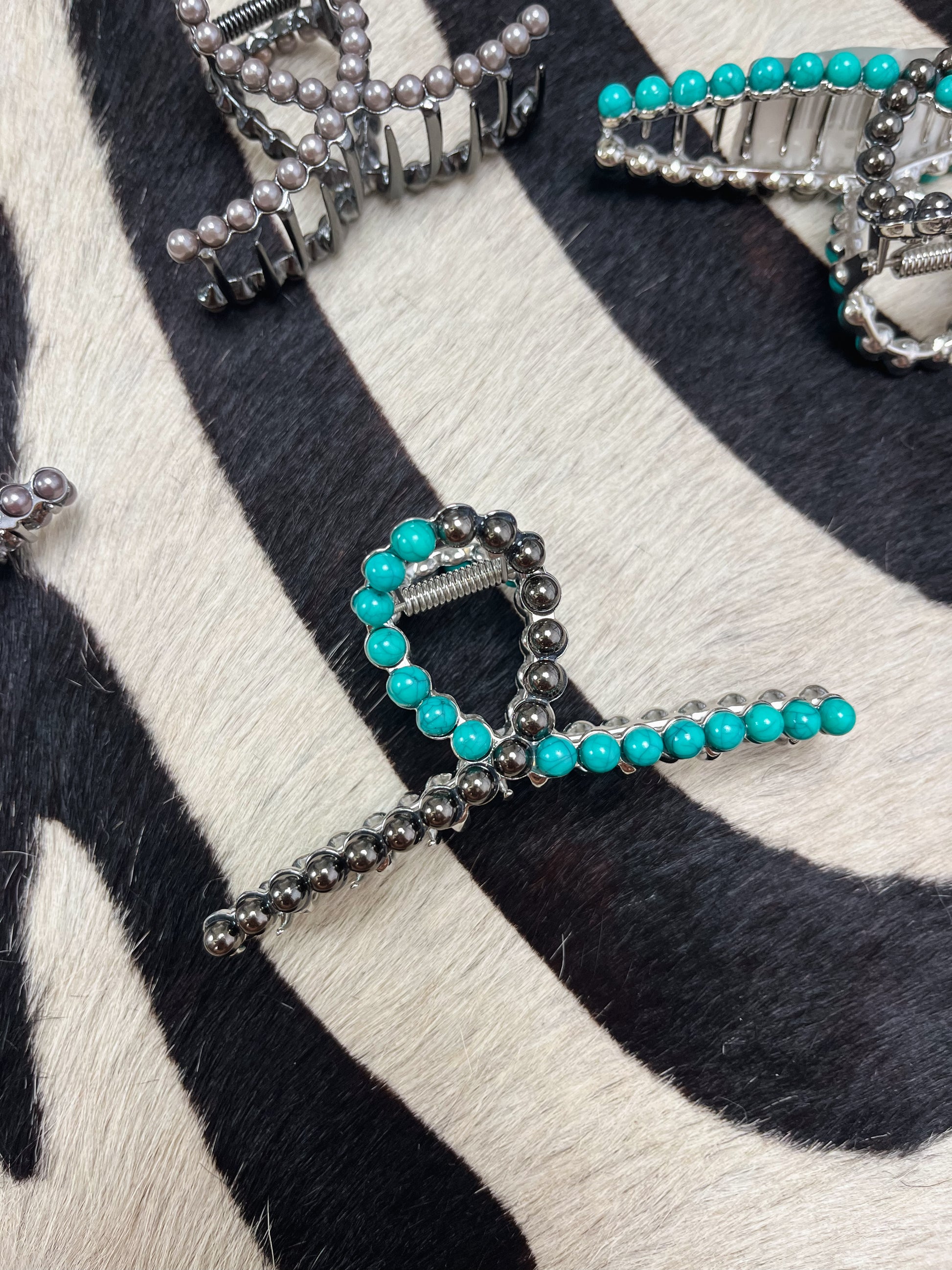Metal claw clip. Faux Navajo pearls & turquoise.