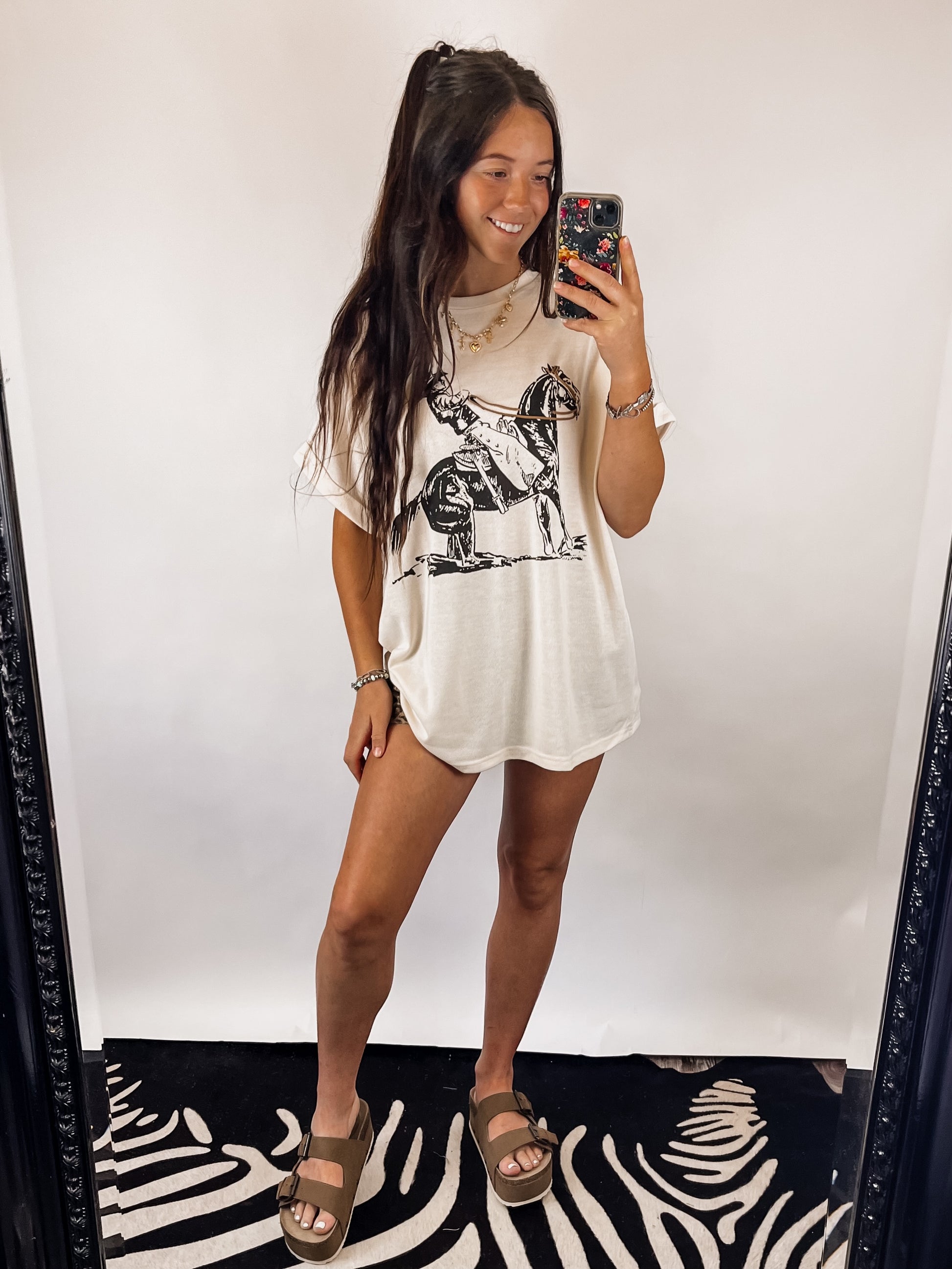 SIZE & FIT: Oversized cream colored tee. The reins on this tee are a little leather piece! Cuffed sleeves.