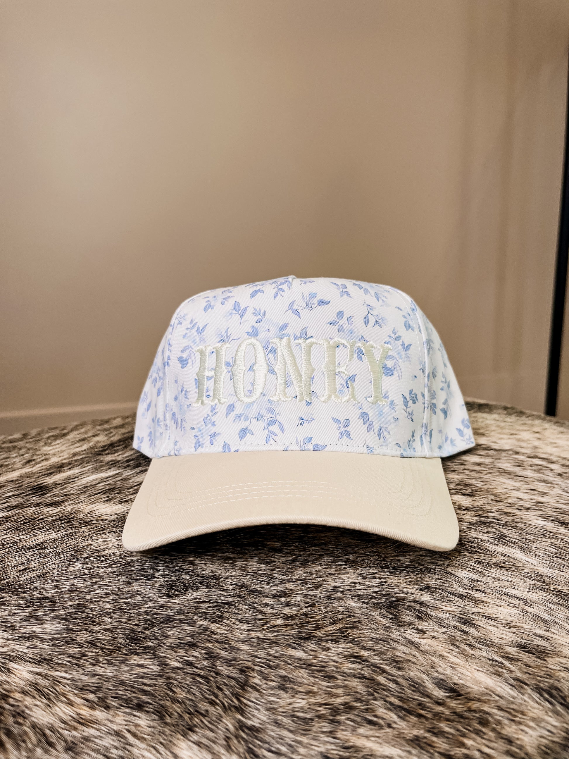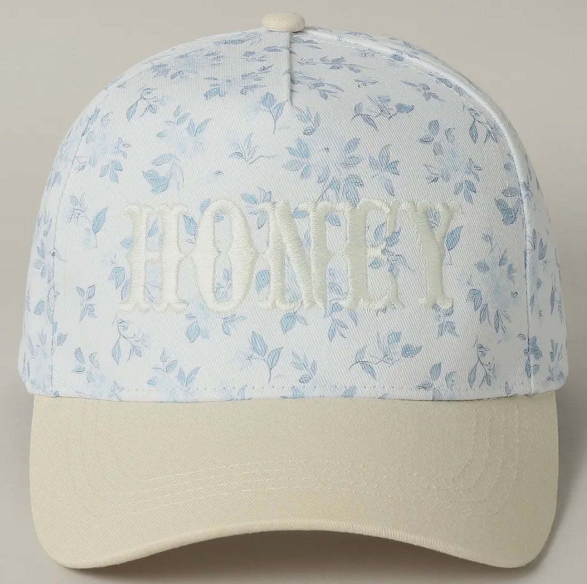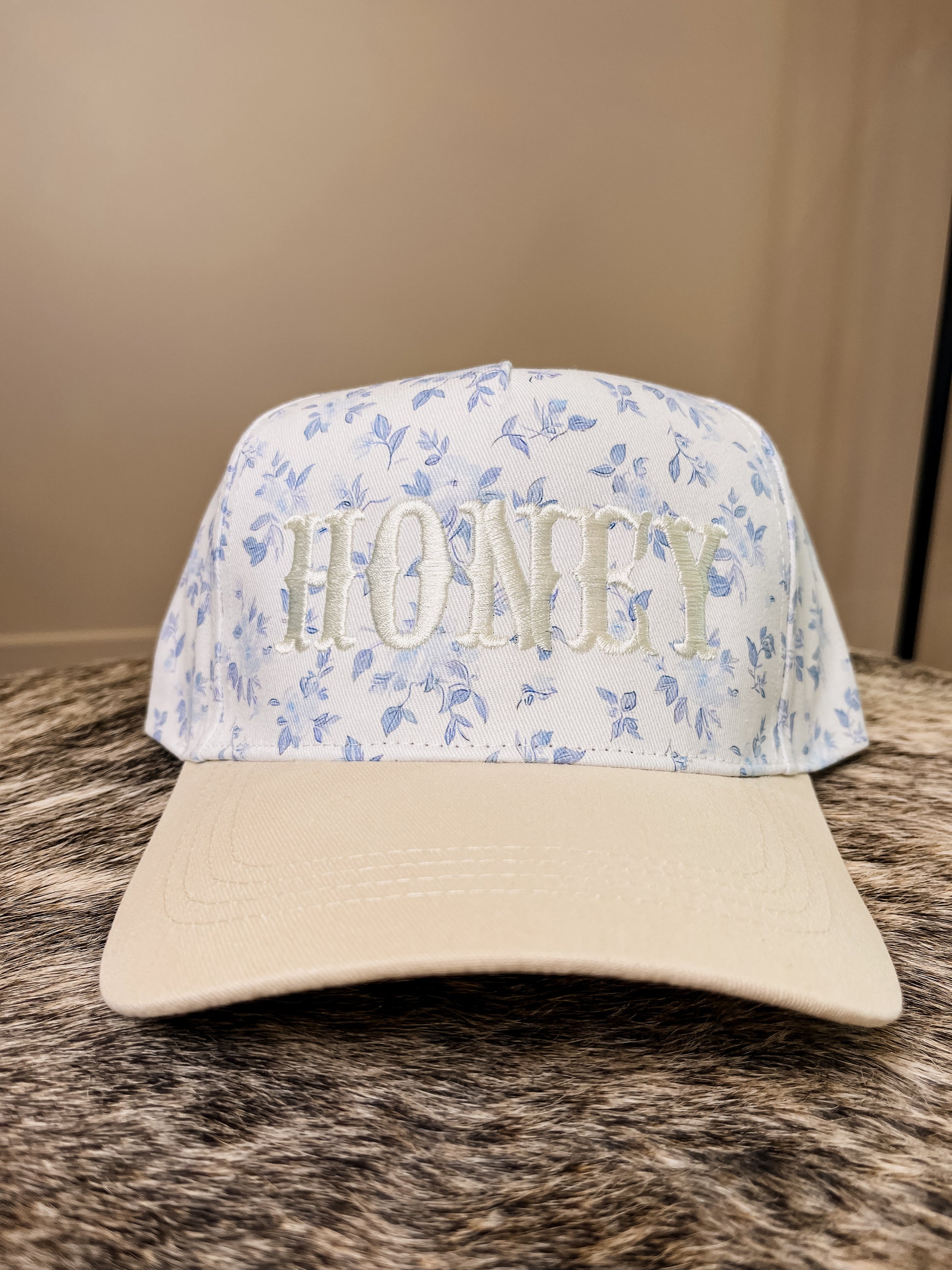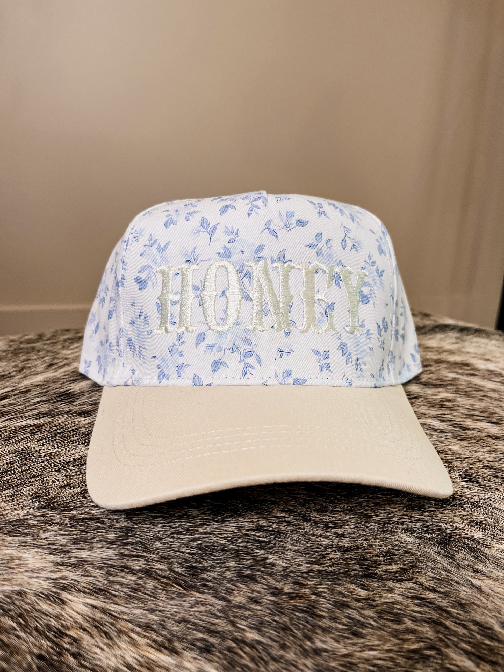 White and blue floral print canvas trucker hat & baby yellow bill. Snap back. "HONEY" embroidery.