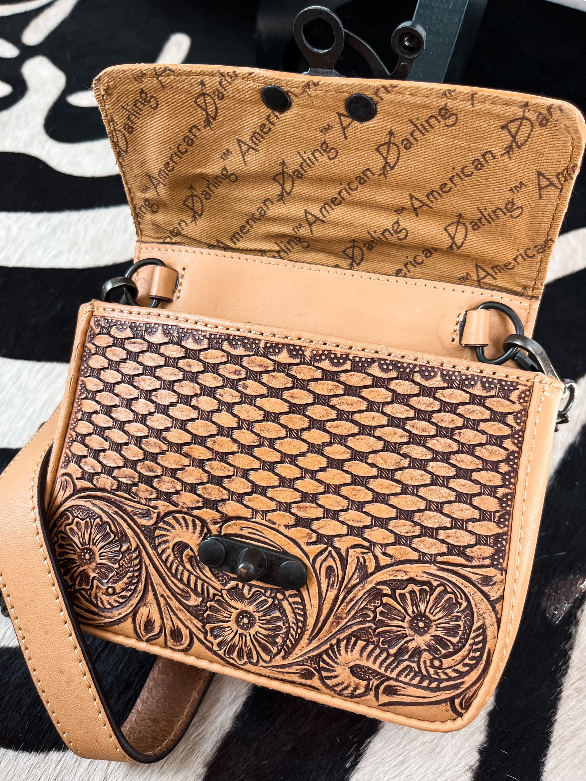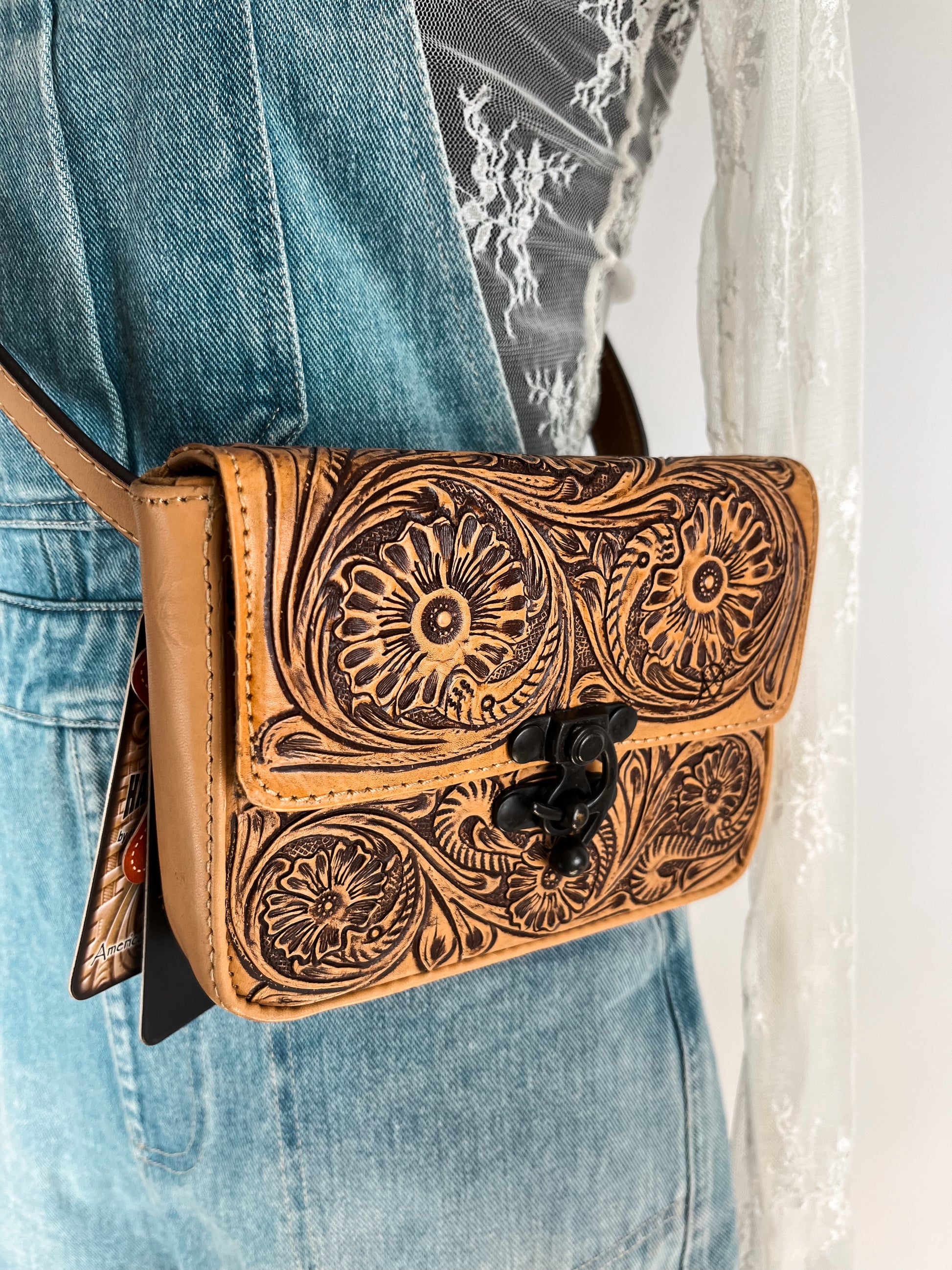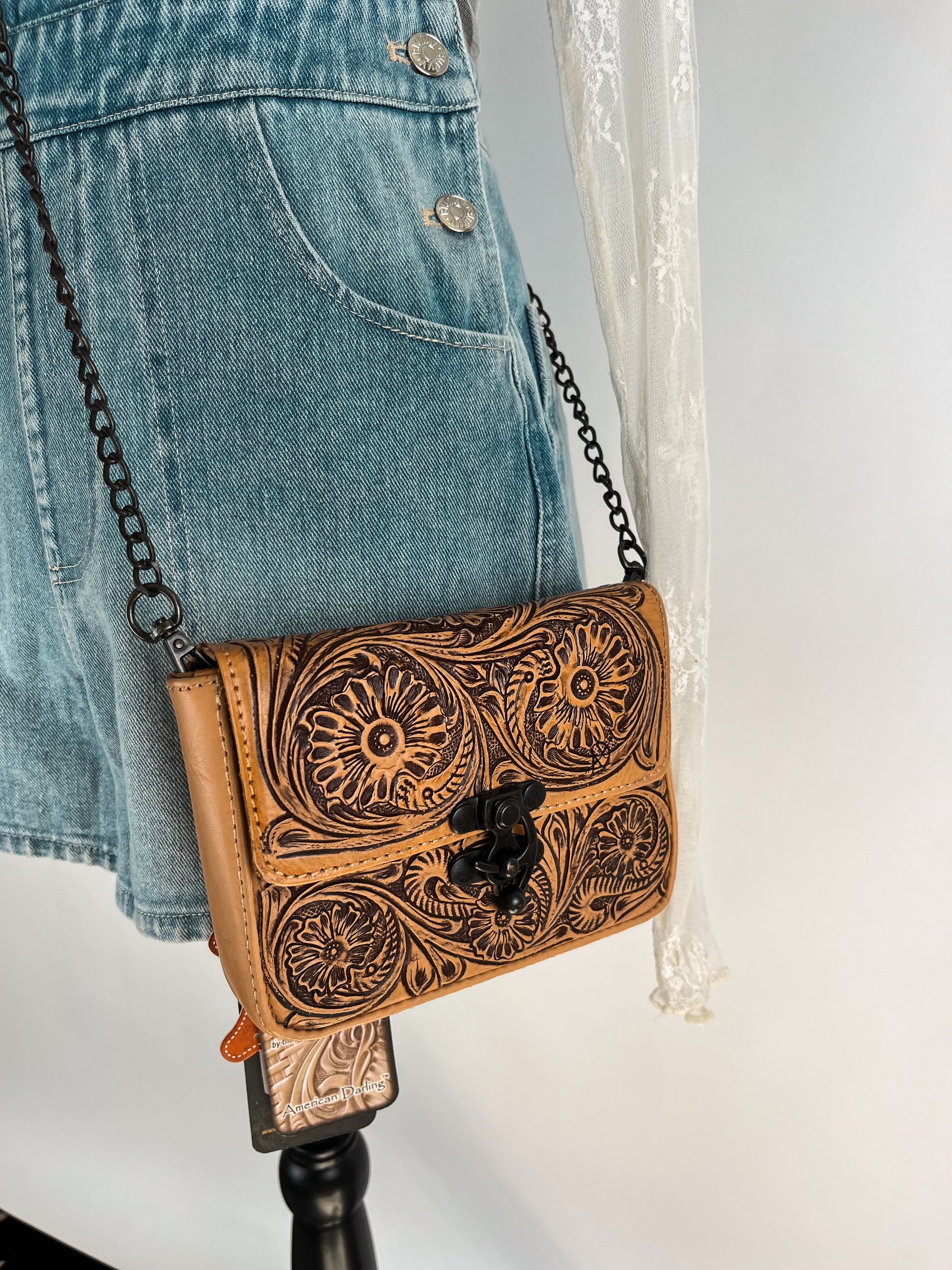 Itty bitty & super cute. Comes with a removable chain & leather strap as well as an all leather belt strap that attaches through the back. The little latch is such a cute detail. Card slots built in.