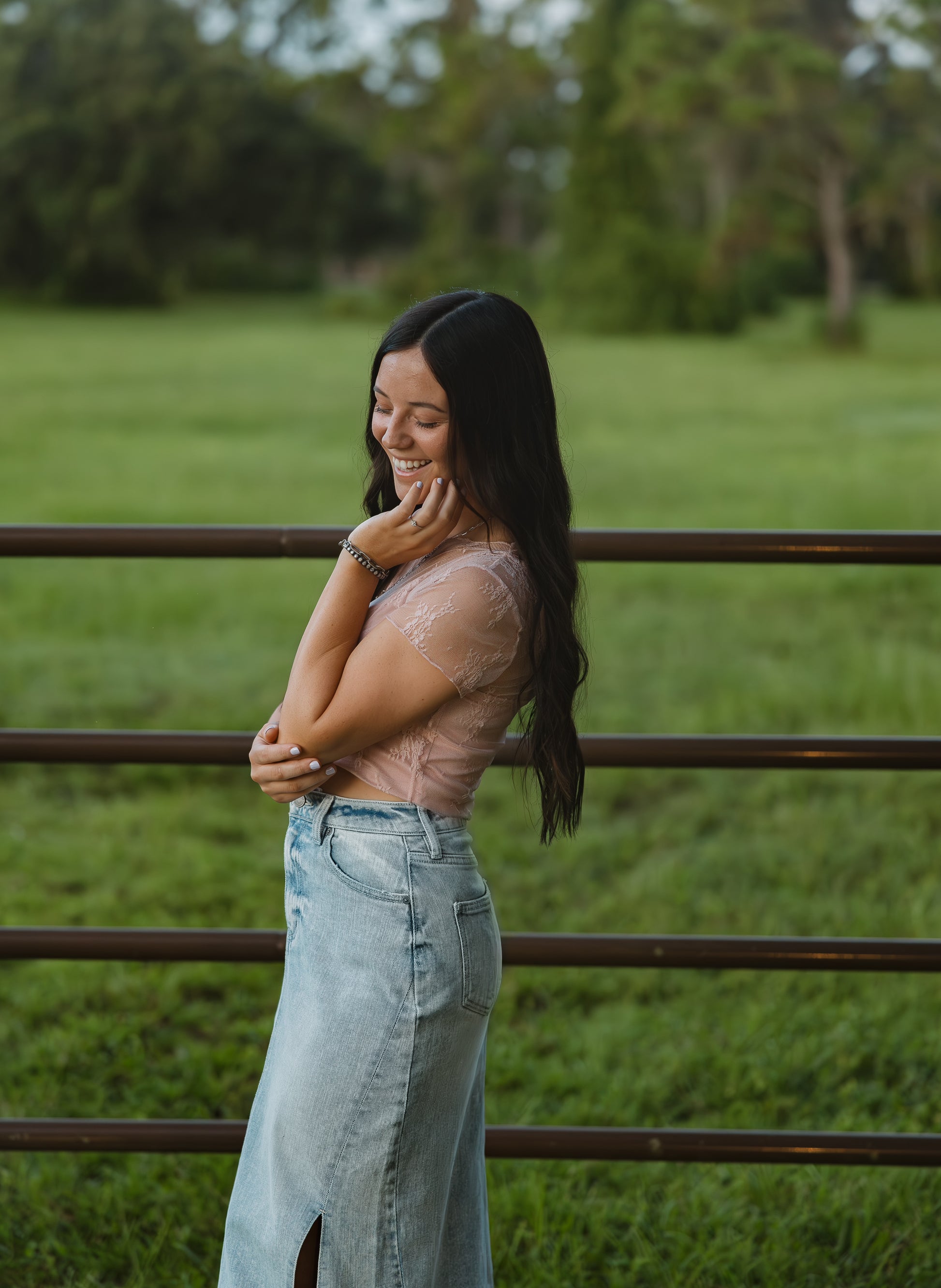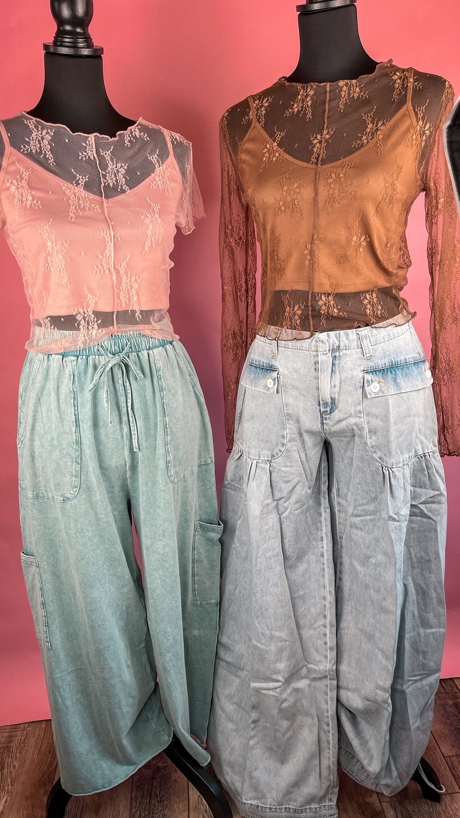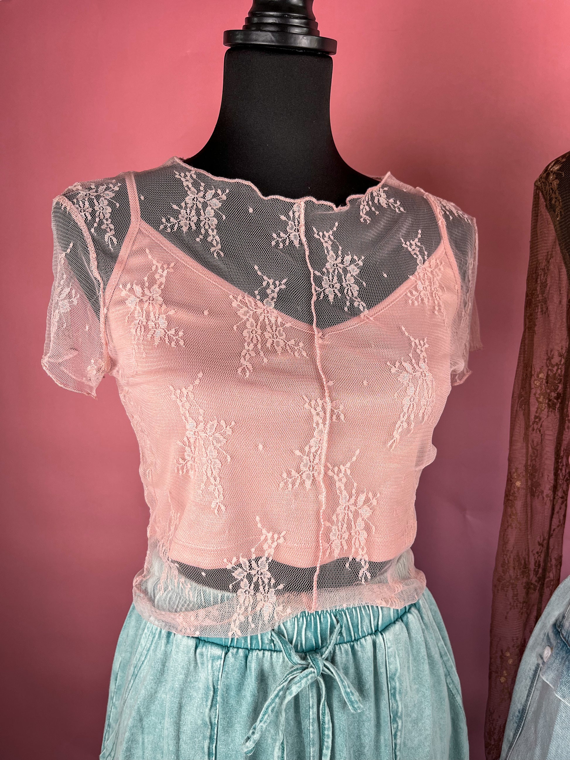Blush color lace cropped tee. Comes with tank liner that has adjustable straps. Stretchy & soft material (& no, the lace is NOT itchy!!)