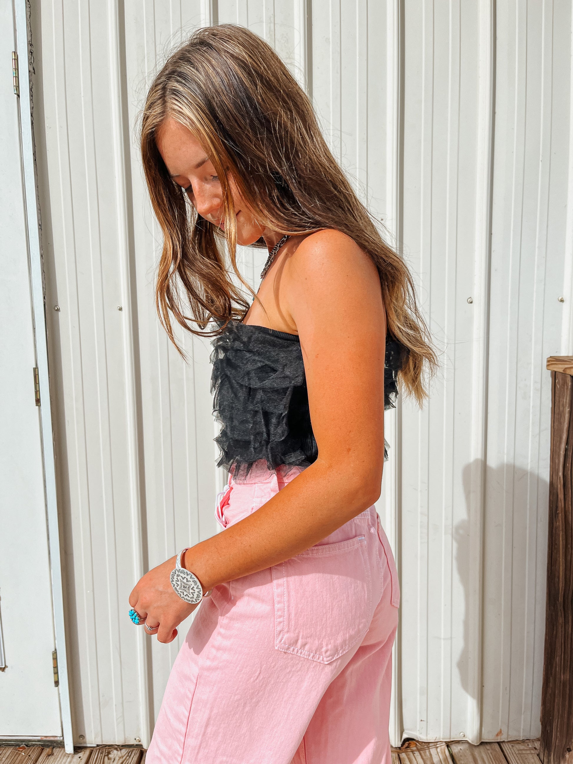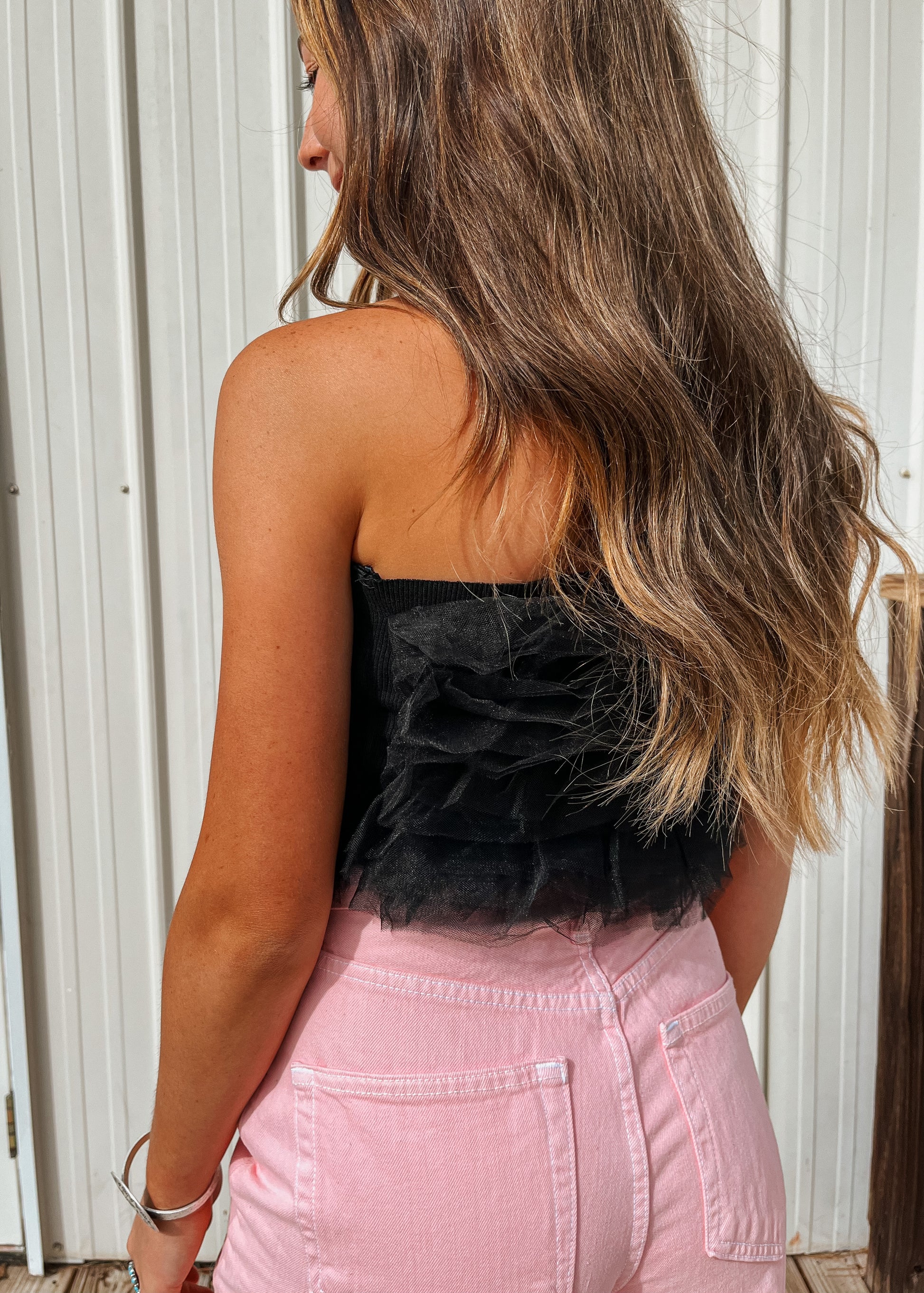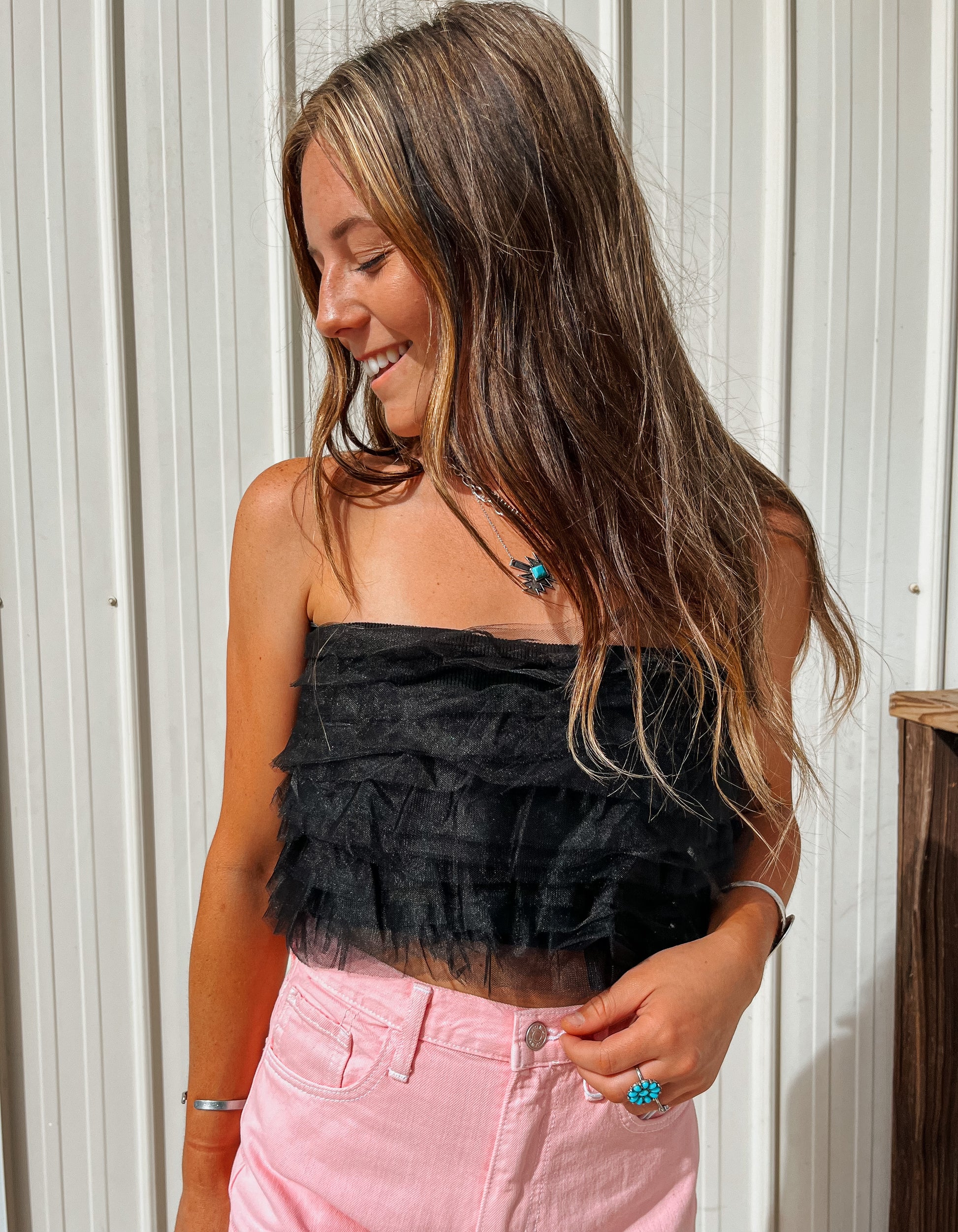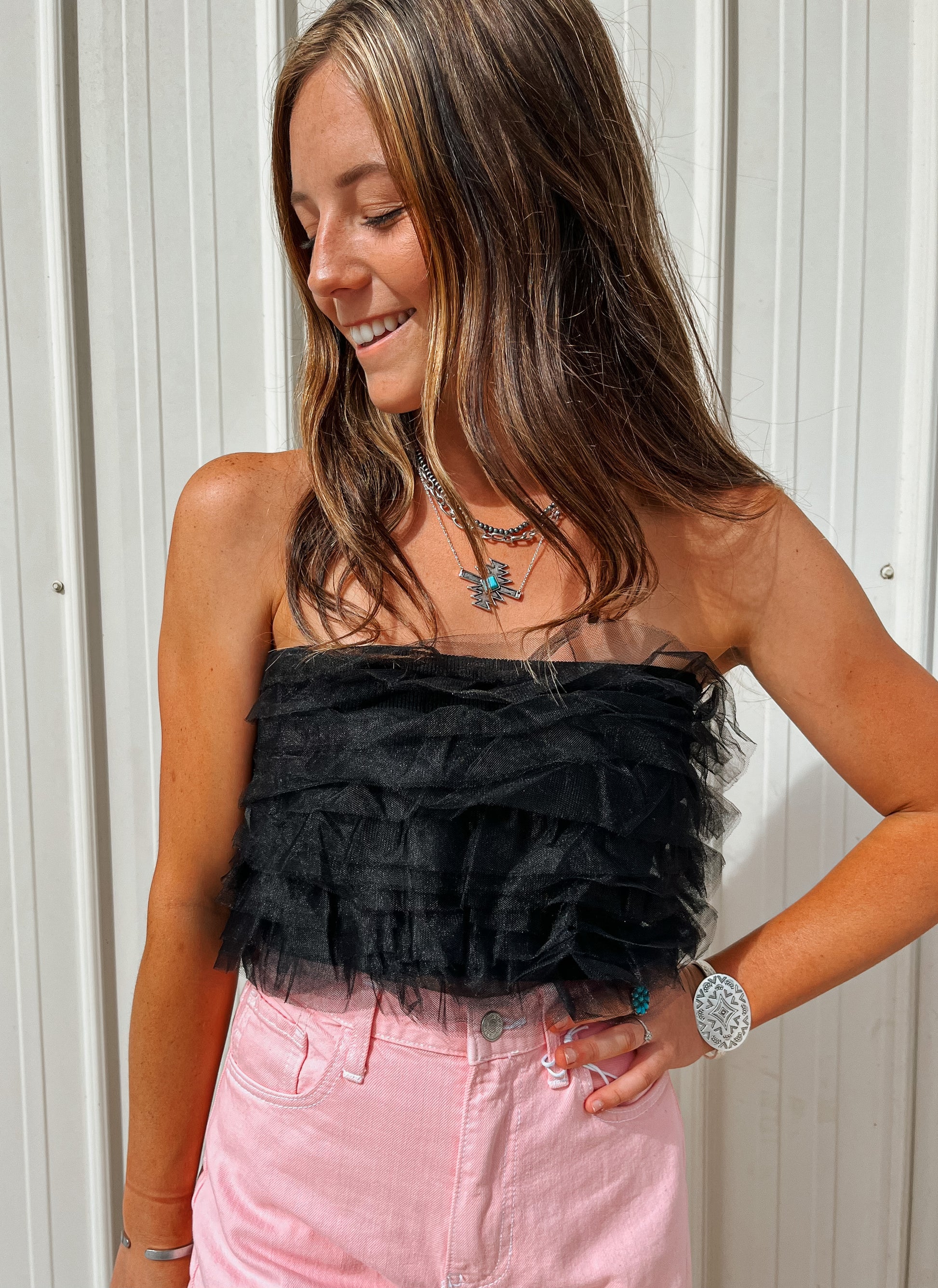 Tulle ruffles. Elastic band type lining that keeps this top in place without feeling tight.
