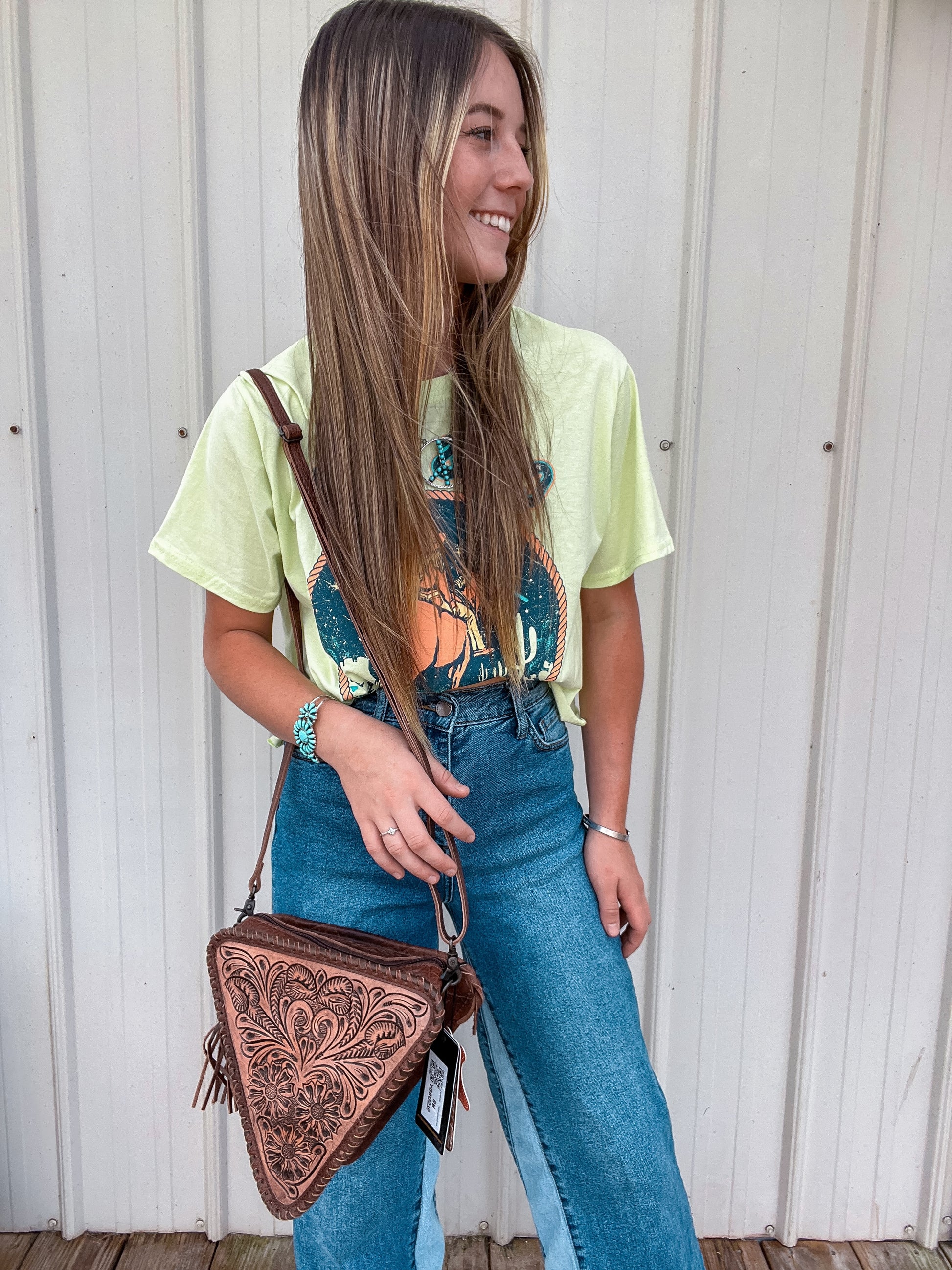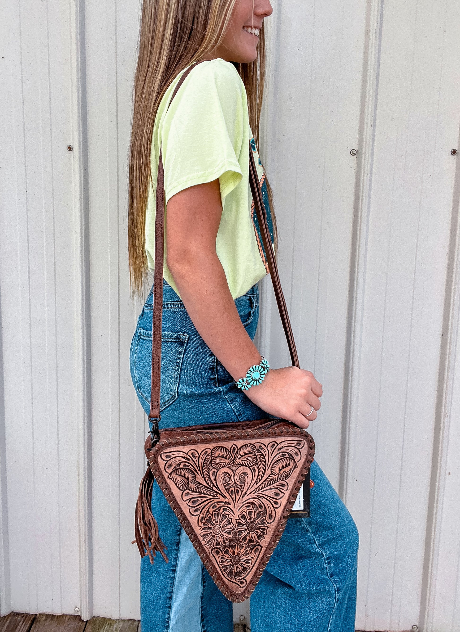 Triangle shaped tooled leather purse. This one’s unique & we’re obsessed.