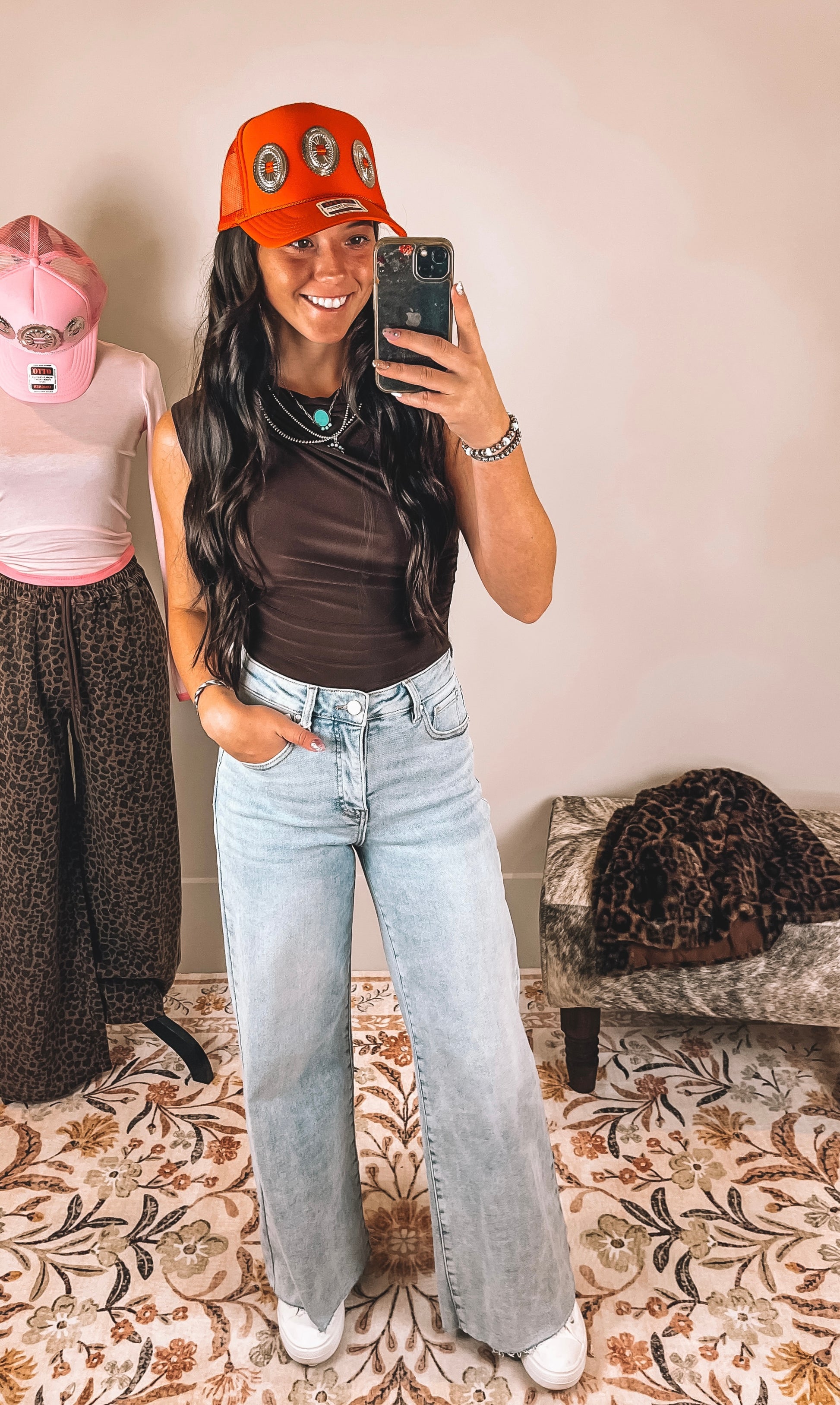 Pictured with The Logan Wide Leg Jeans & #6 Orange Concho Hat