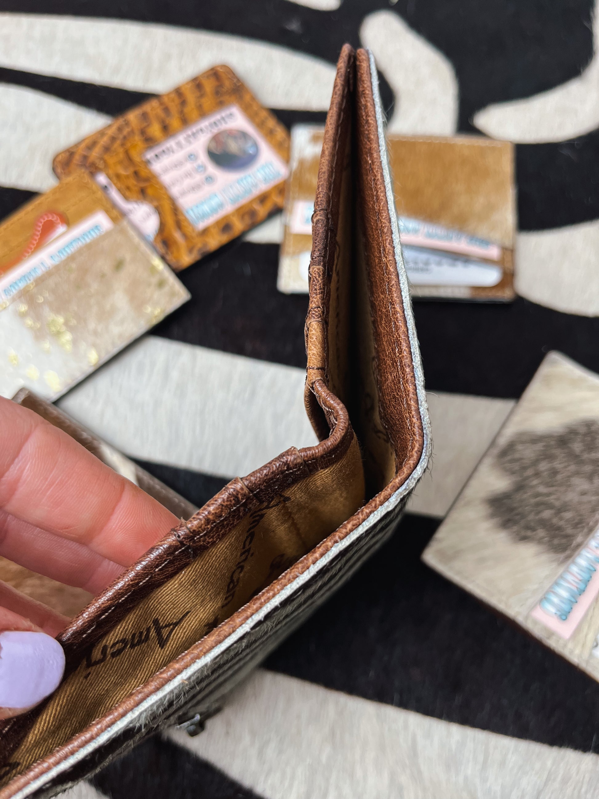 Authentic cowhide with zebra print design. Button snap closure, clear ID slot, plenty of card slots & cash slot on the side. Little zipper pocket on the back.