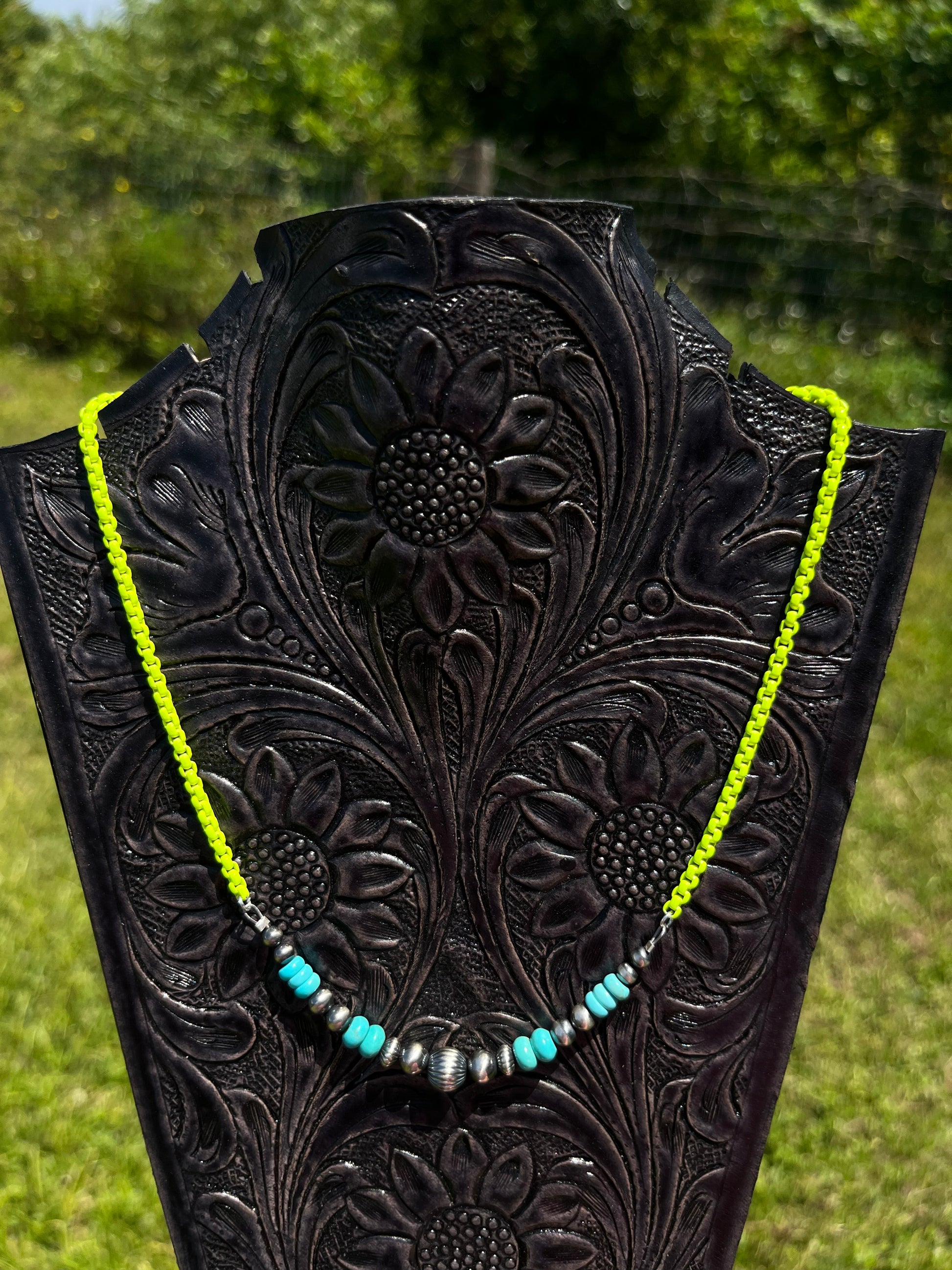 Authentic Arizona turquoise rondelle beads and 4-8mm Navajo pearls. Sterling silver findings, enameled stainless steel chain, 17.75” long.