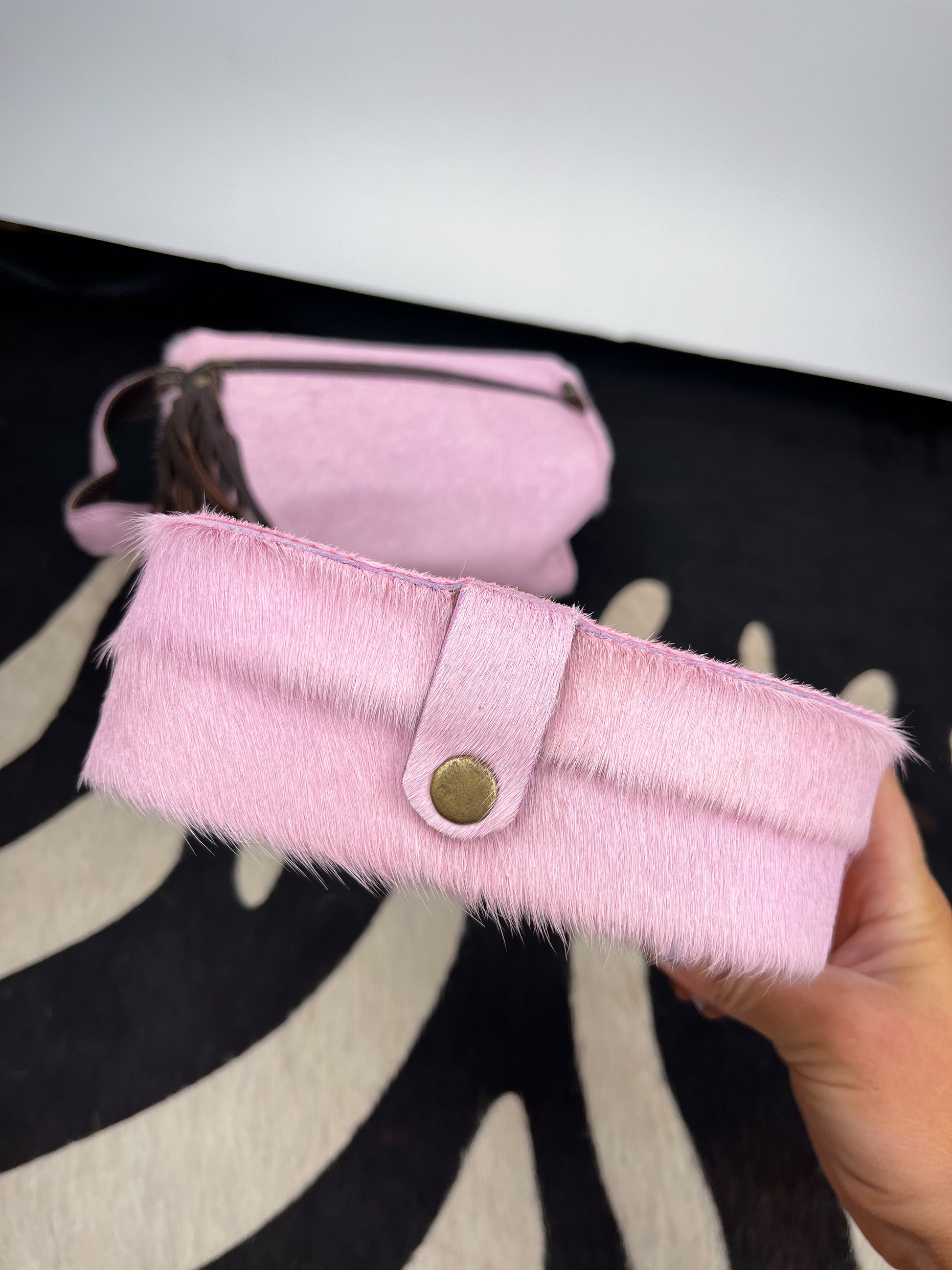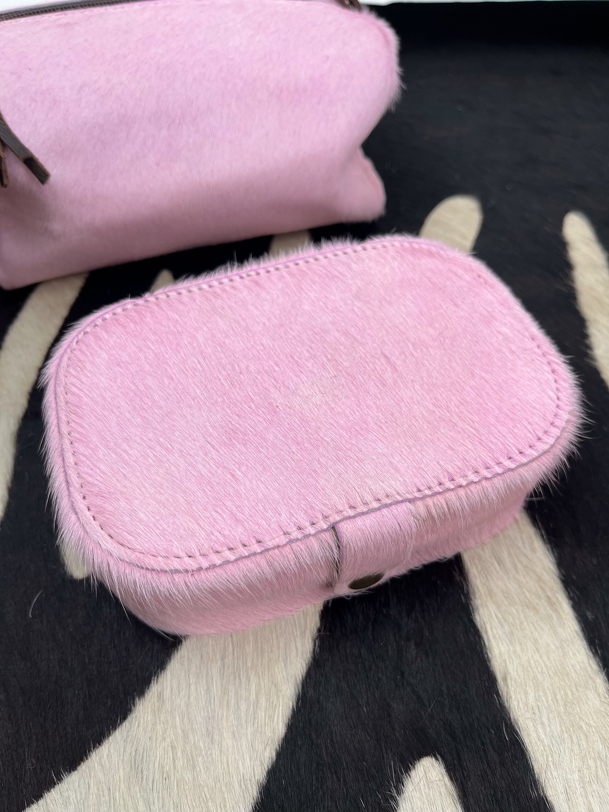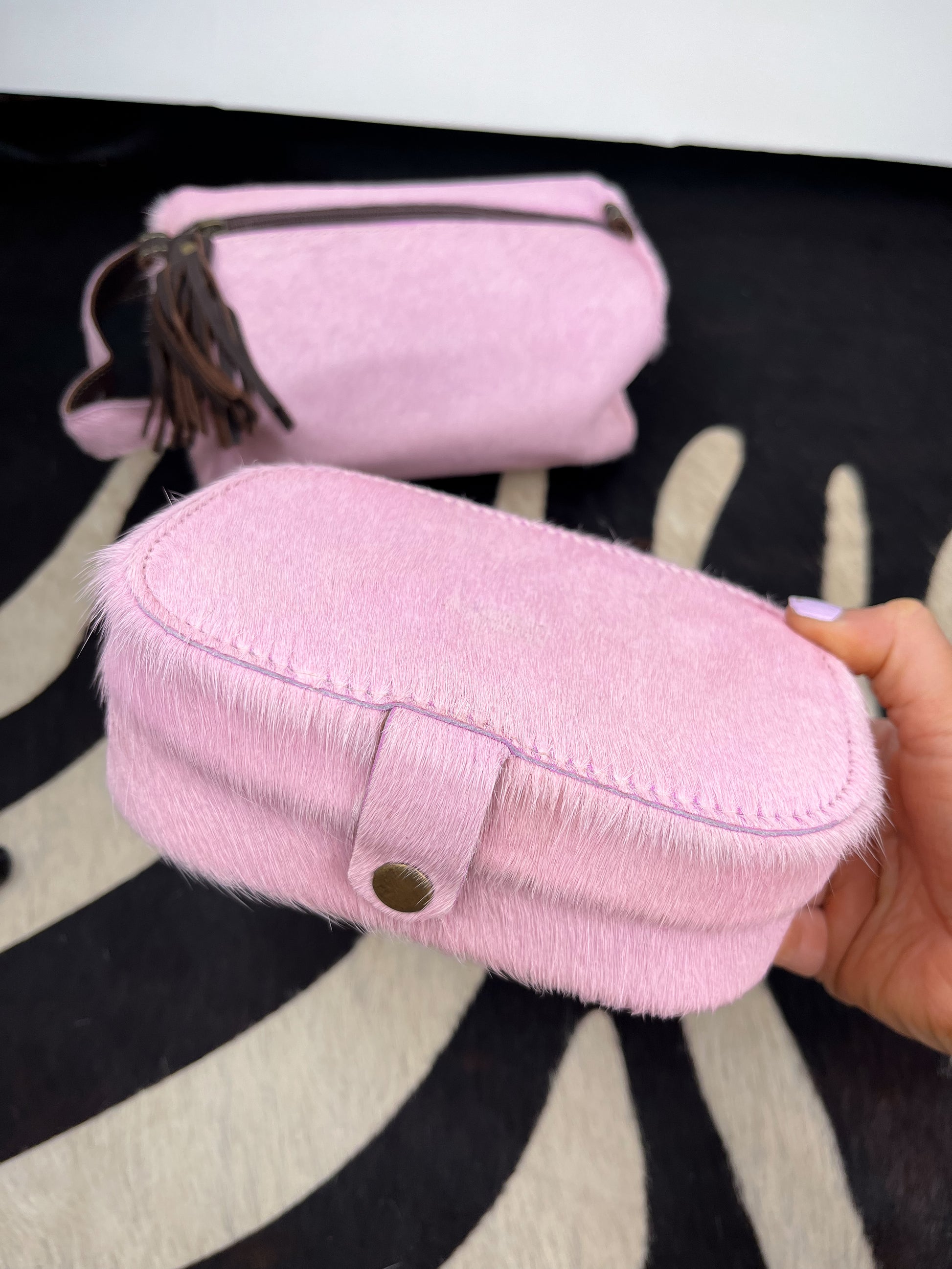 Baby pink genuine cowhide jewelry box. Snap closure. Velvet material inside