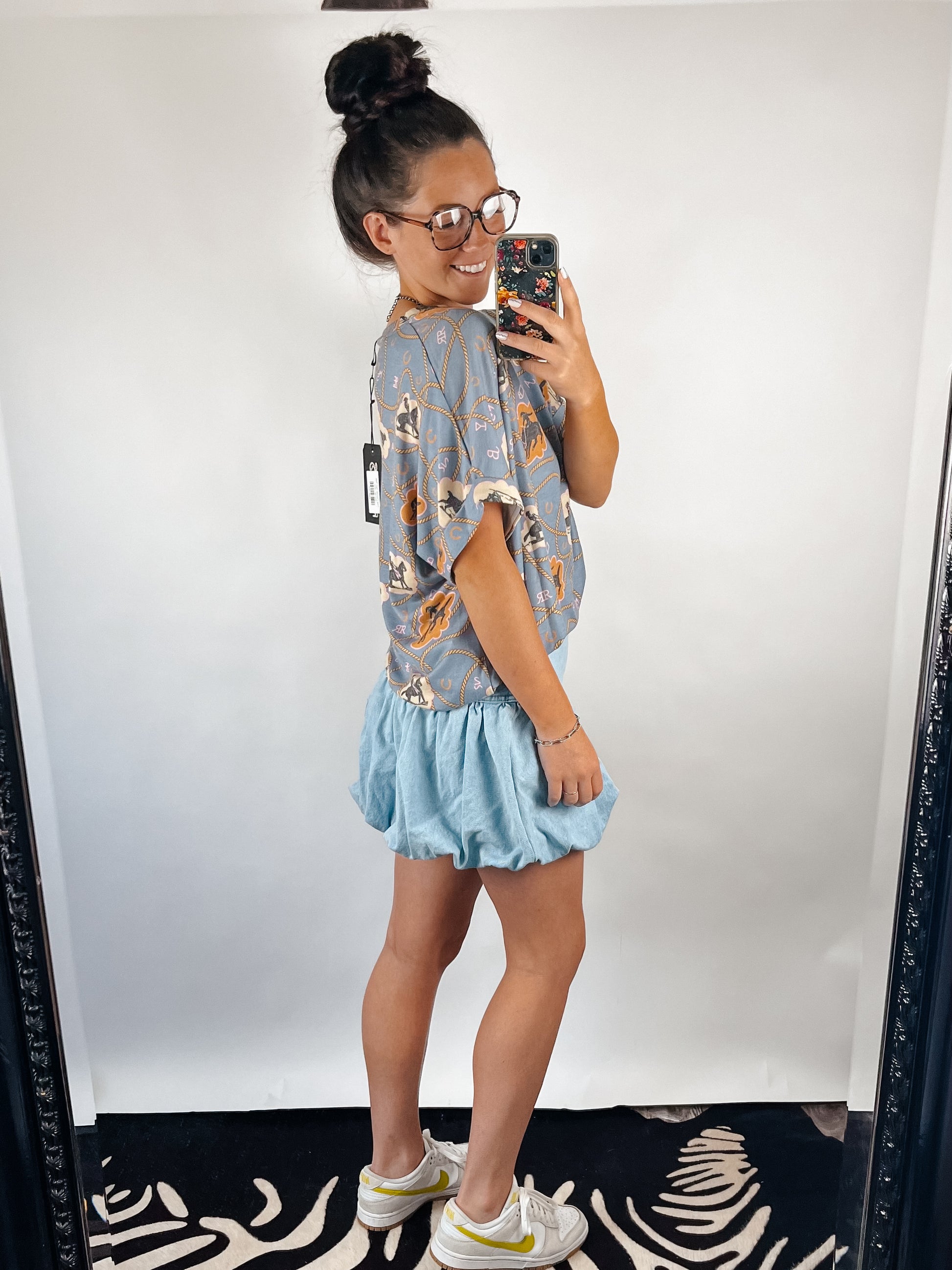 FIT: Fitted through the hips and waist, with the cutest pleated puff design at the bottom. High rise fit. Deep front pockets, faux back pockets.
