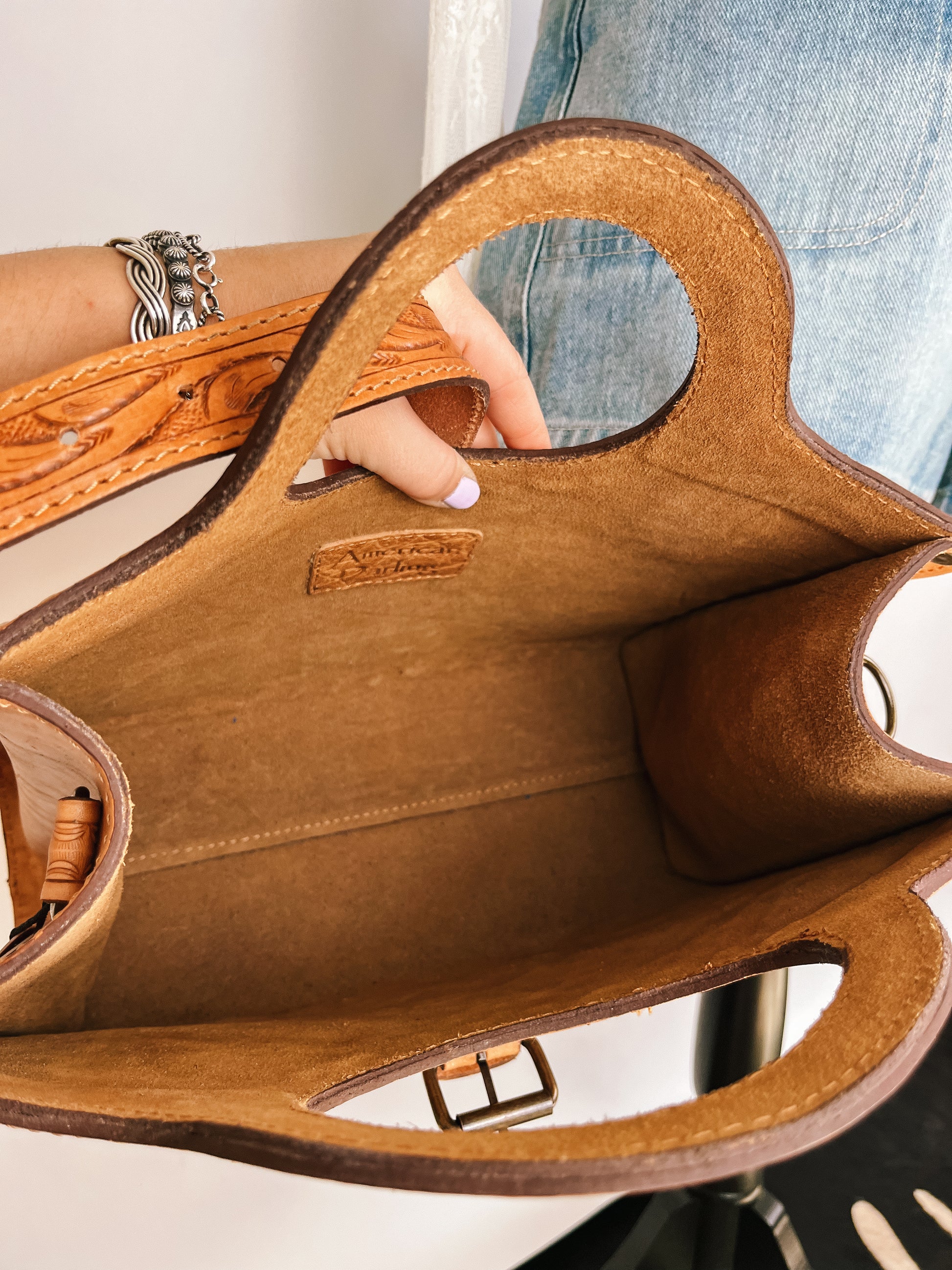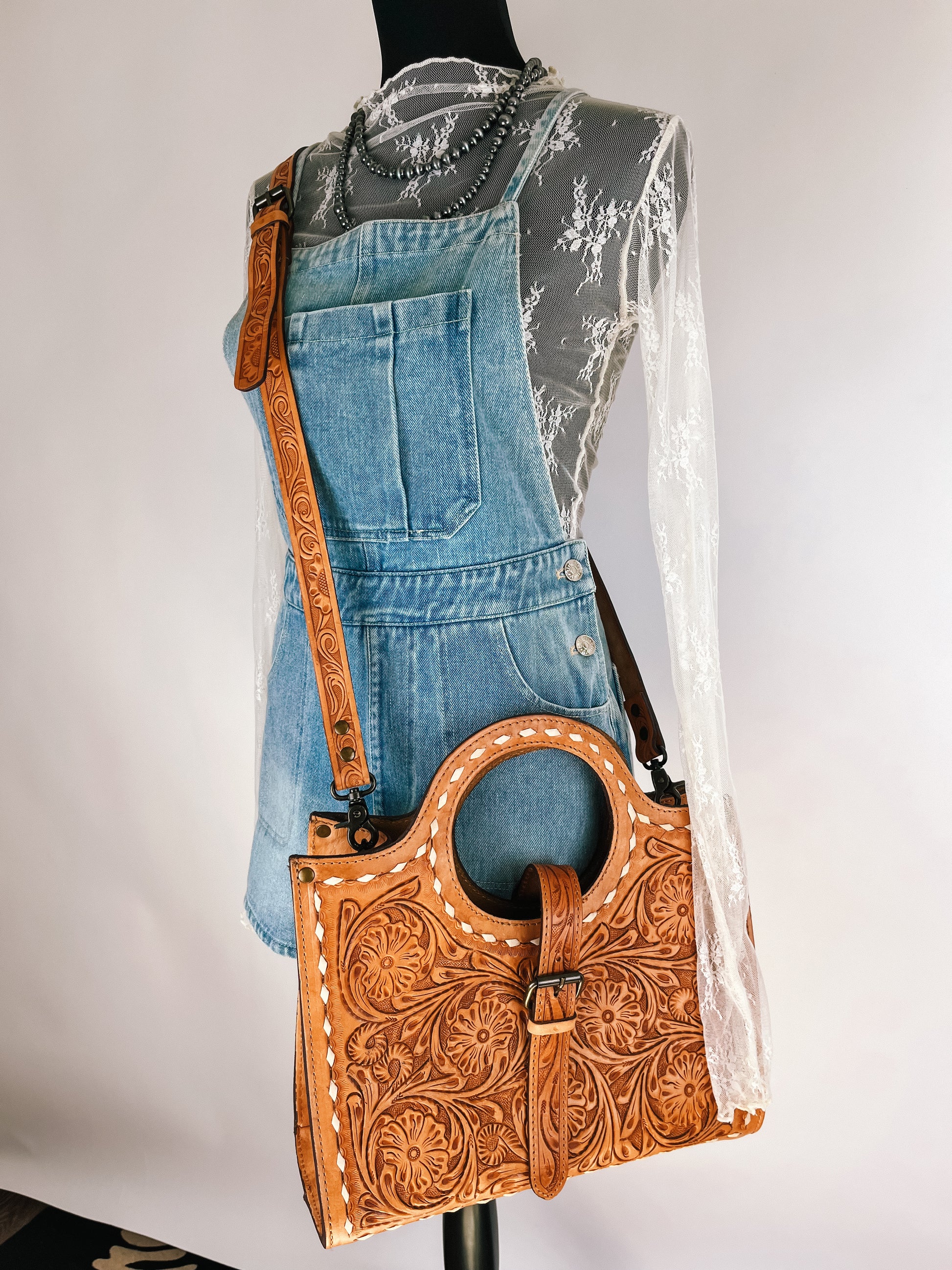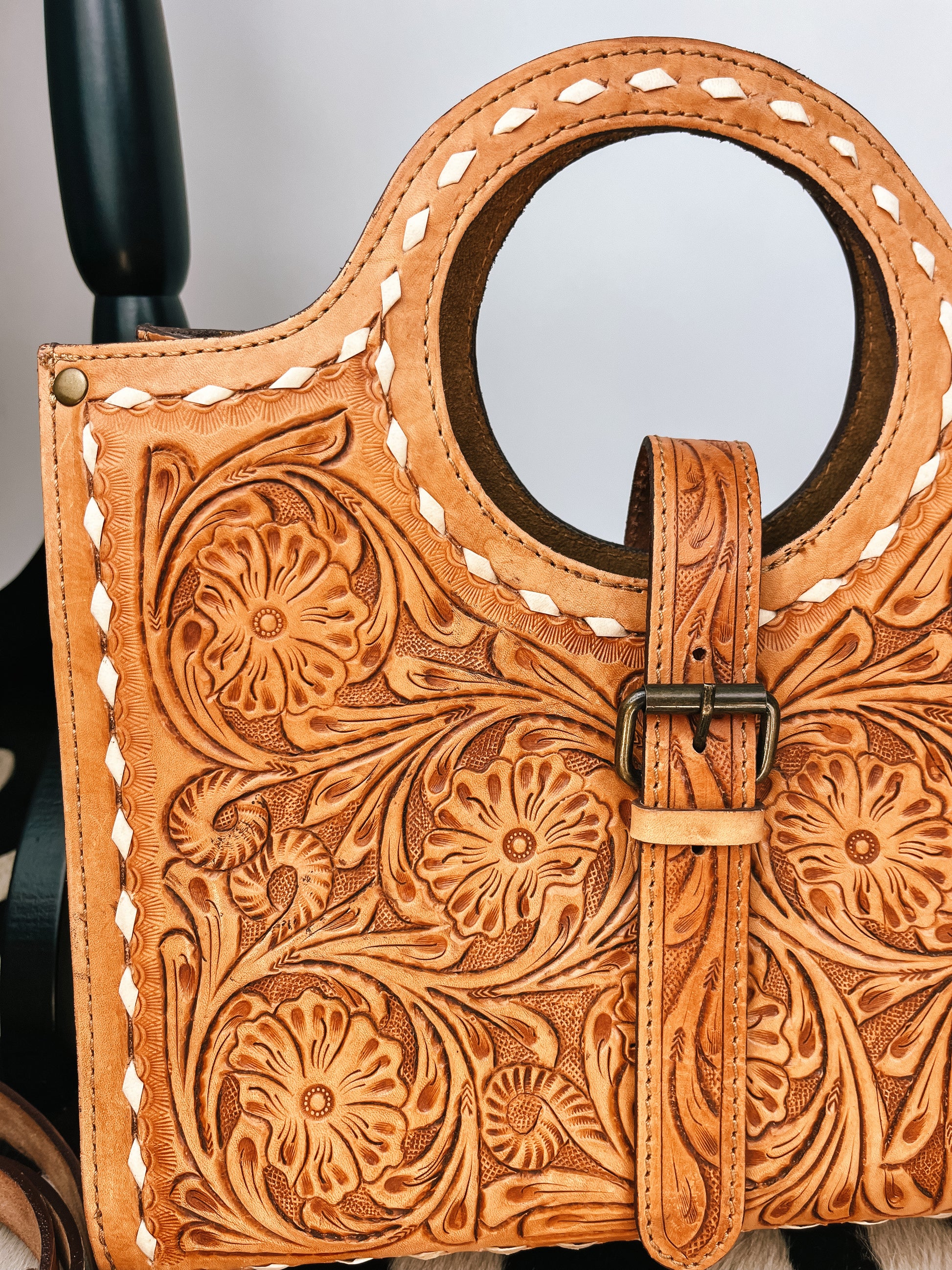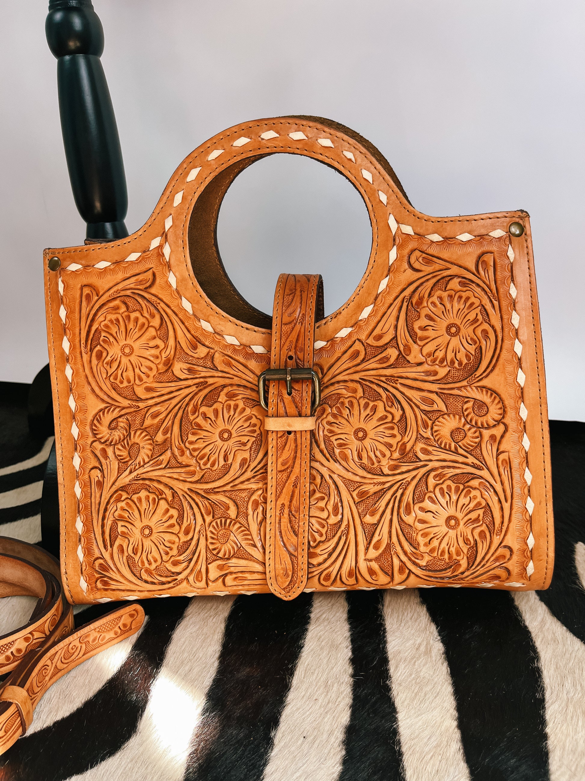 Rectangle tote bag. The cutest circle handles & buckle closure, buckstitch & floral tooled leather design. Comes with matching adjustable strap.