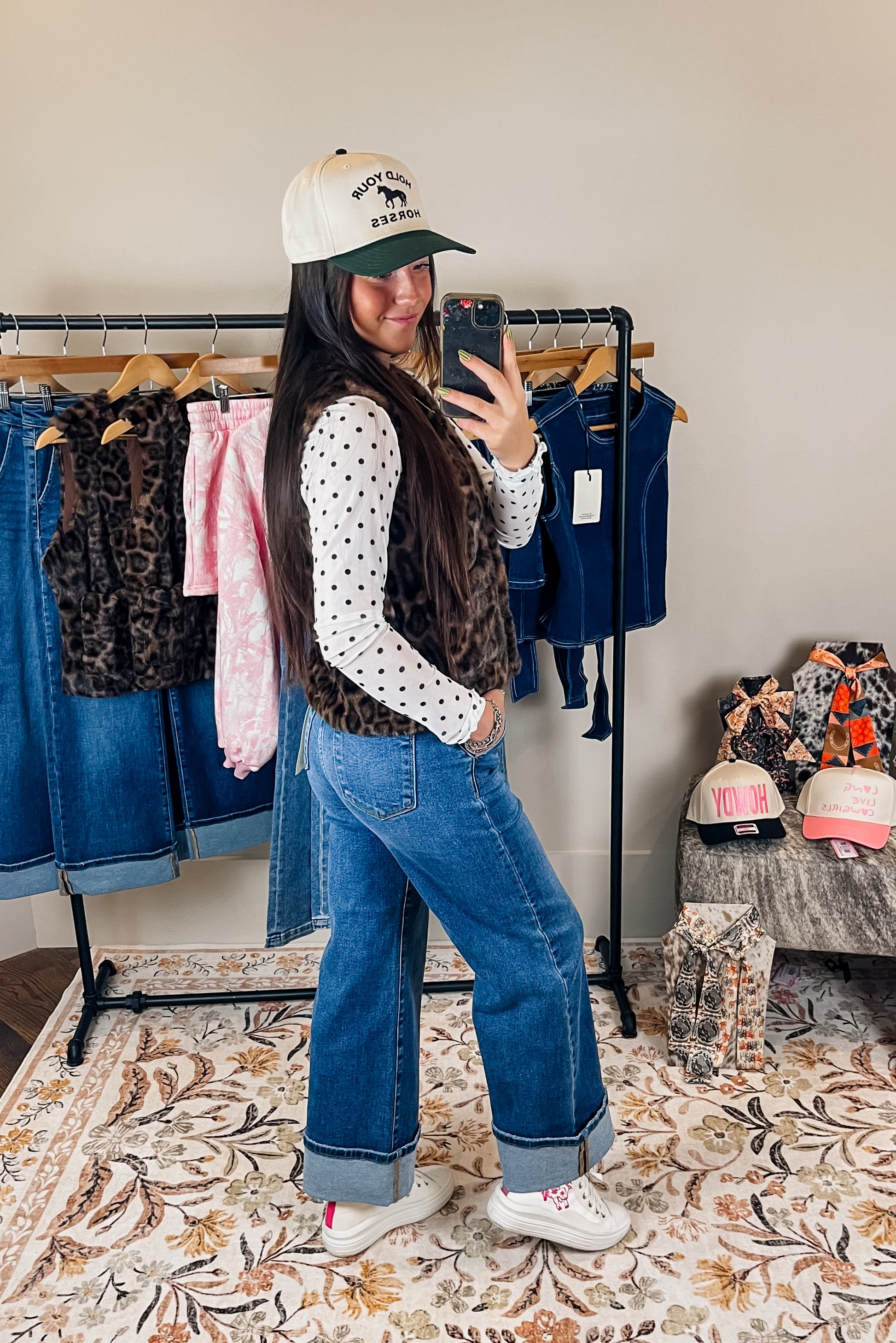 Dark wash high rise jeans, can be worn cuffed or uncuffed. Super stretchy & comfortable. Tummy control, fitted through the upper thigh for a flattering fit, widens down the legs to a boot cut.