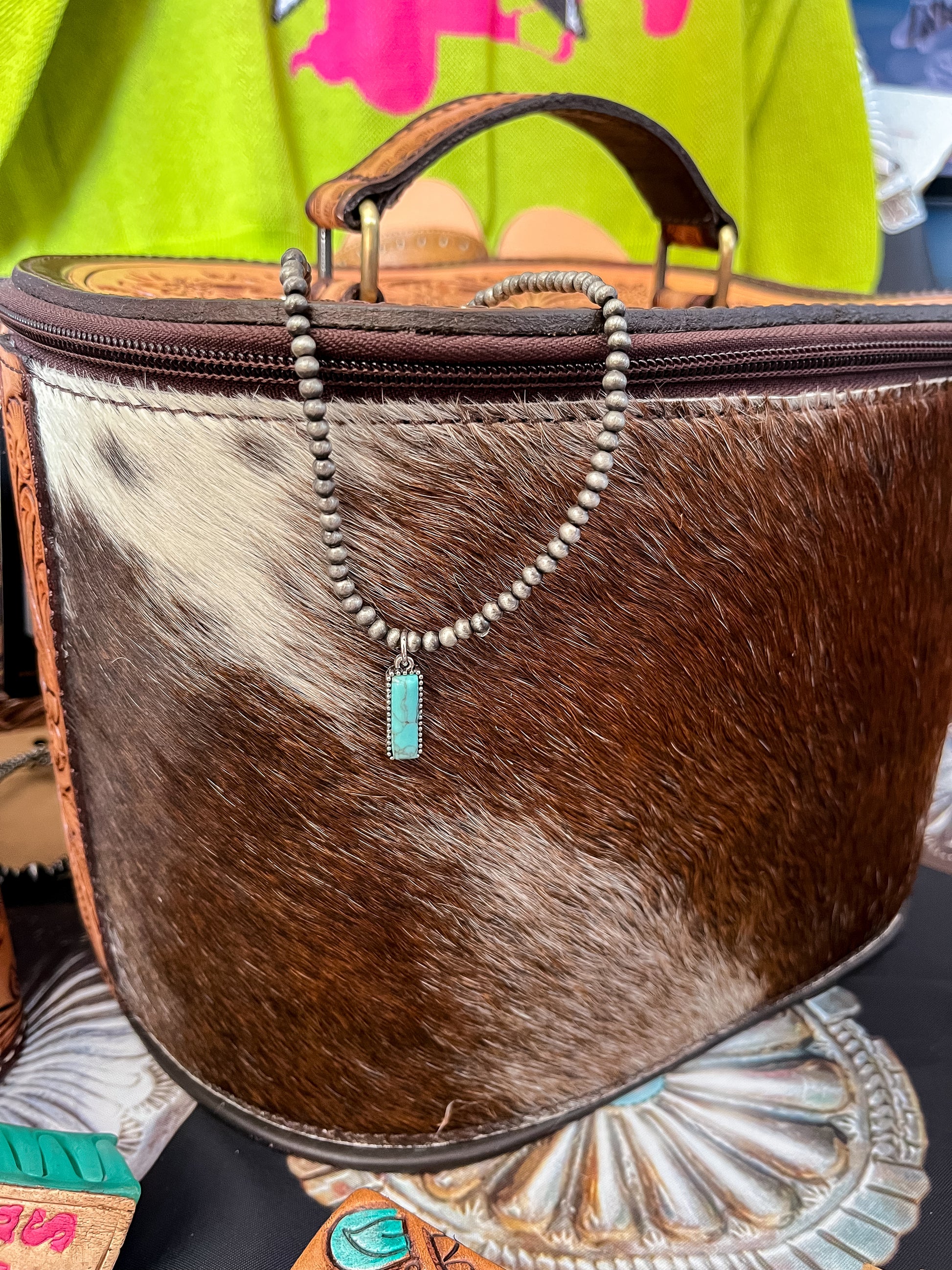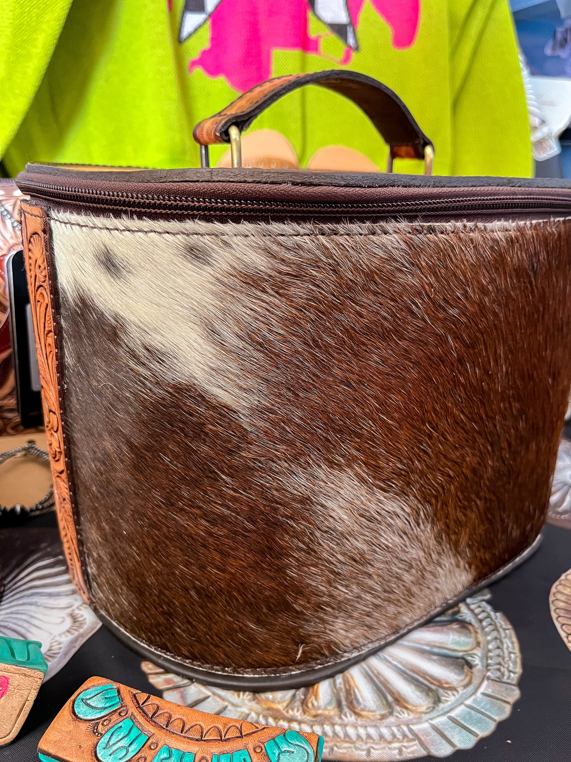 American Darling brand. Zips closed. Small pocket inside & brush holders on underside of lid. Turquoise velvet lining inside.