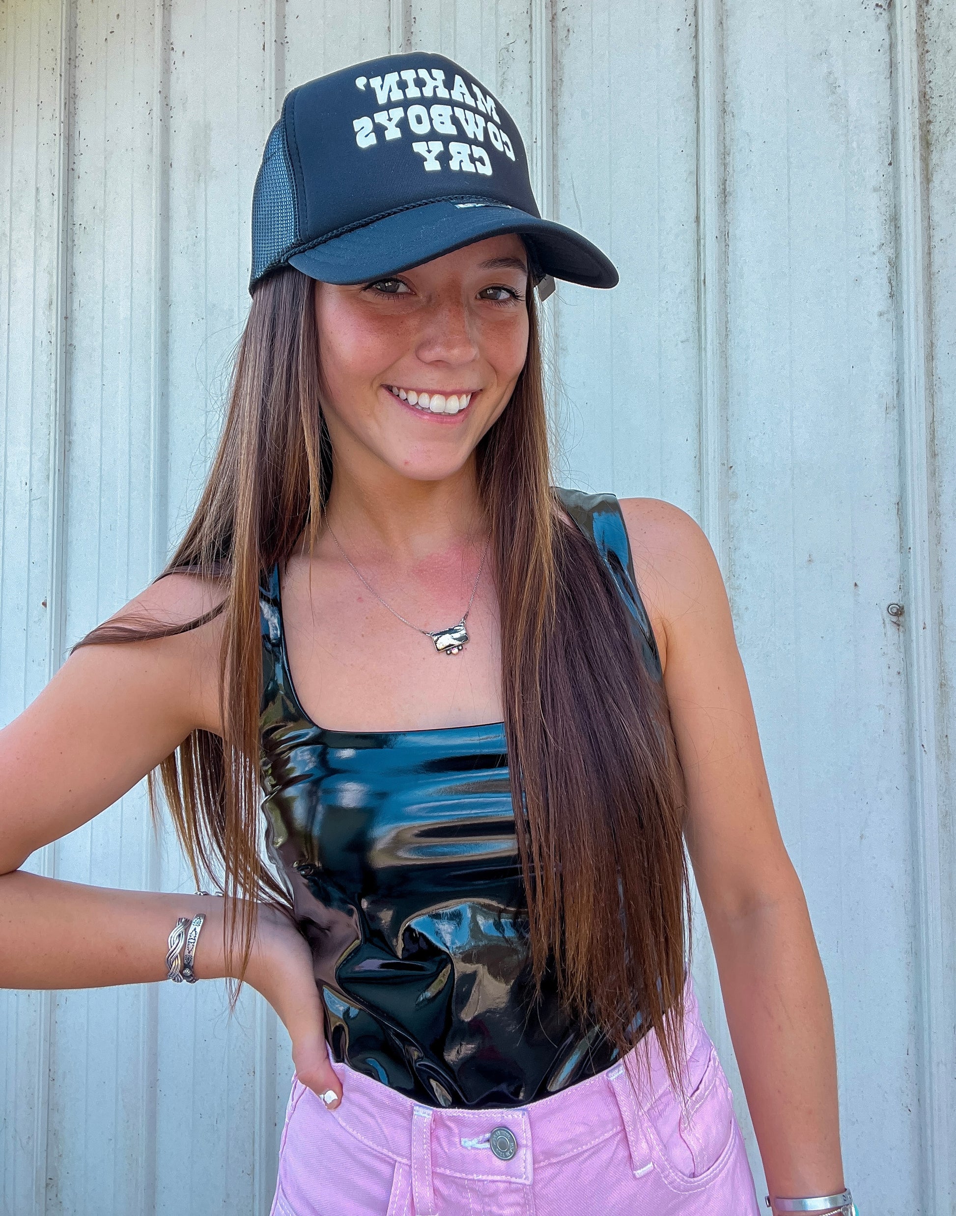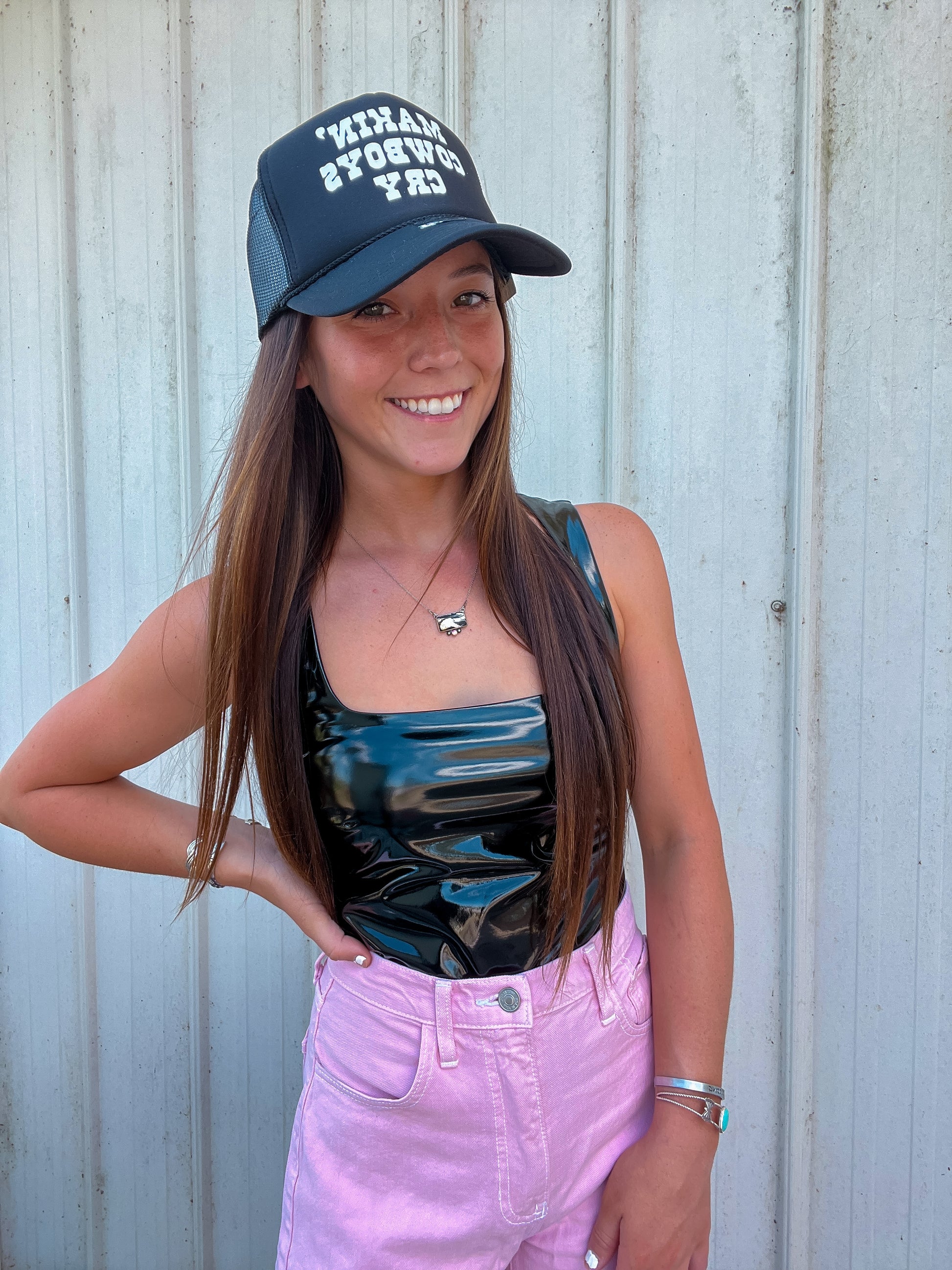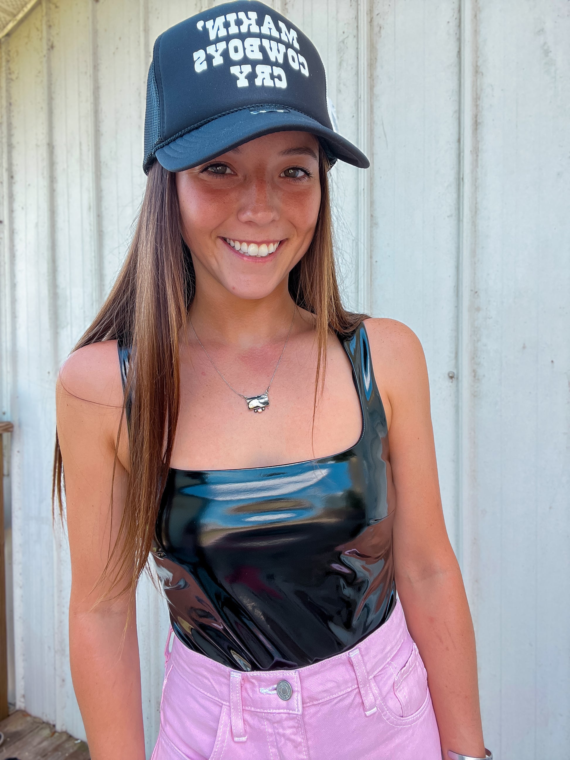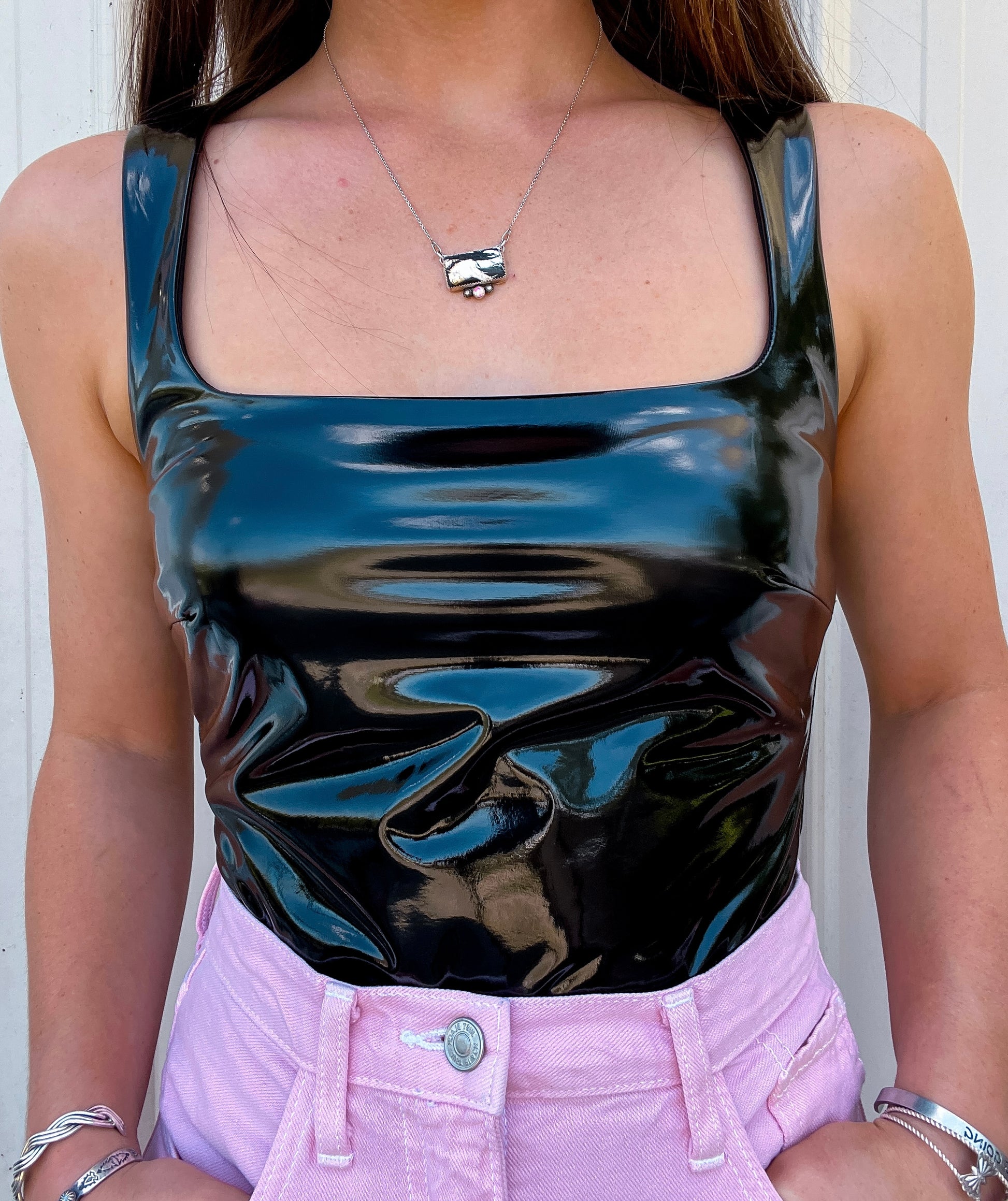 Faux shiny leather bodysuit. Square neck tank with full coverage back & back zipper. Stretchy material.