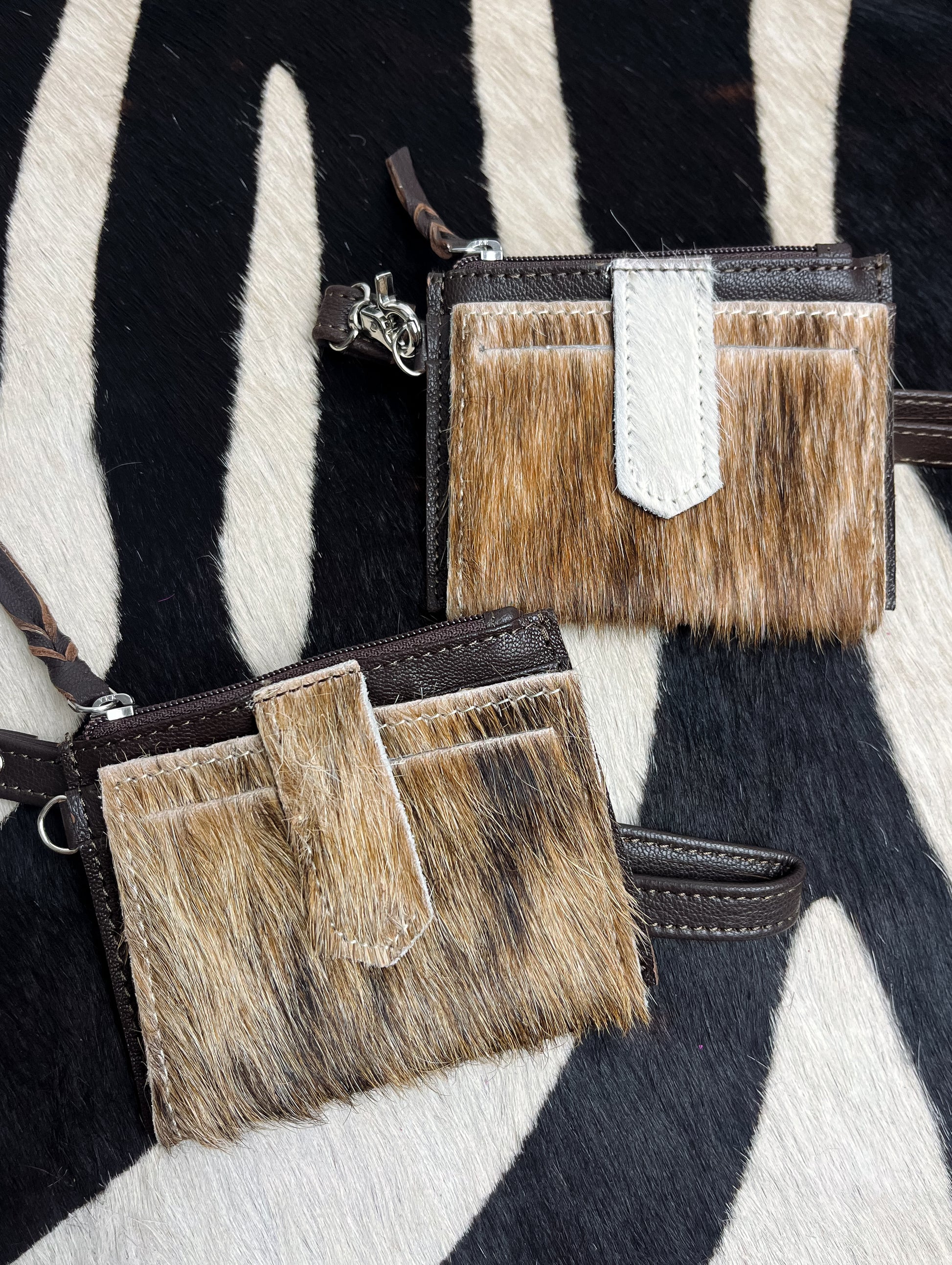 Card wallet with removable wristlet strap. Zip closure pocket, one card slot on the front. Open the snap closure on the front to reveal two more card slots and a clear ID slot. Genuine leather on the back with three additional card slots.